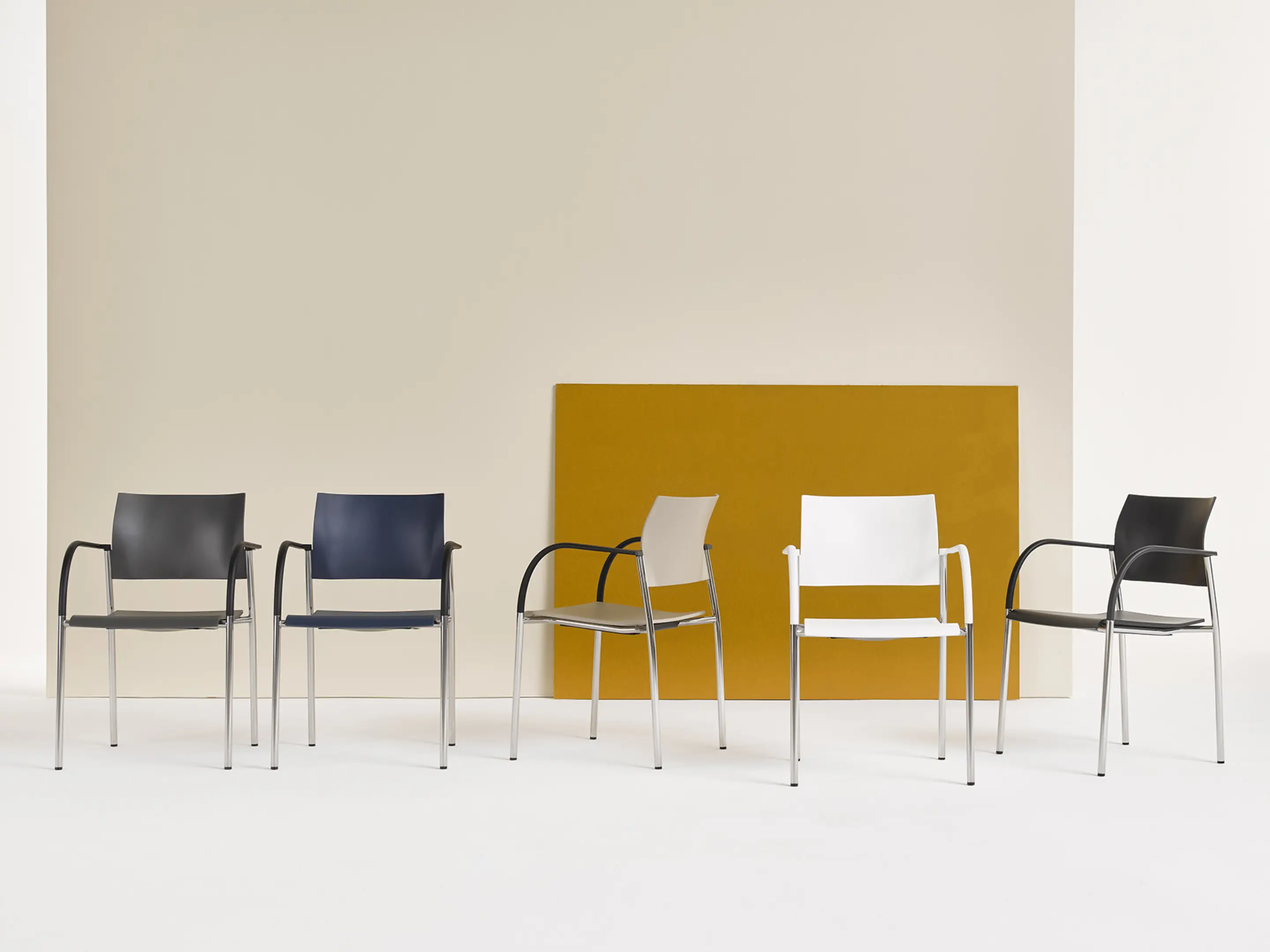 4-poots frame op kunststof glijders, met een kunststof zitting en rug zonder stoffering. Inclusief armleggers. Stapelbaar tot 12 stuks op transportwagen en 8 stuks vrijstaand.
