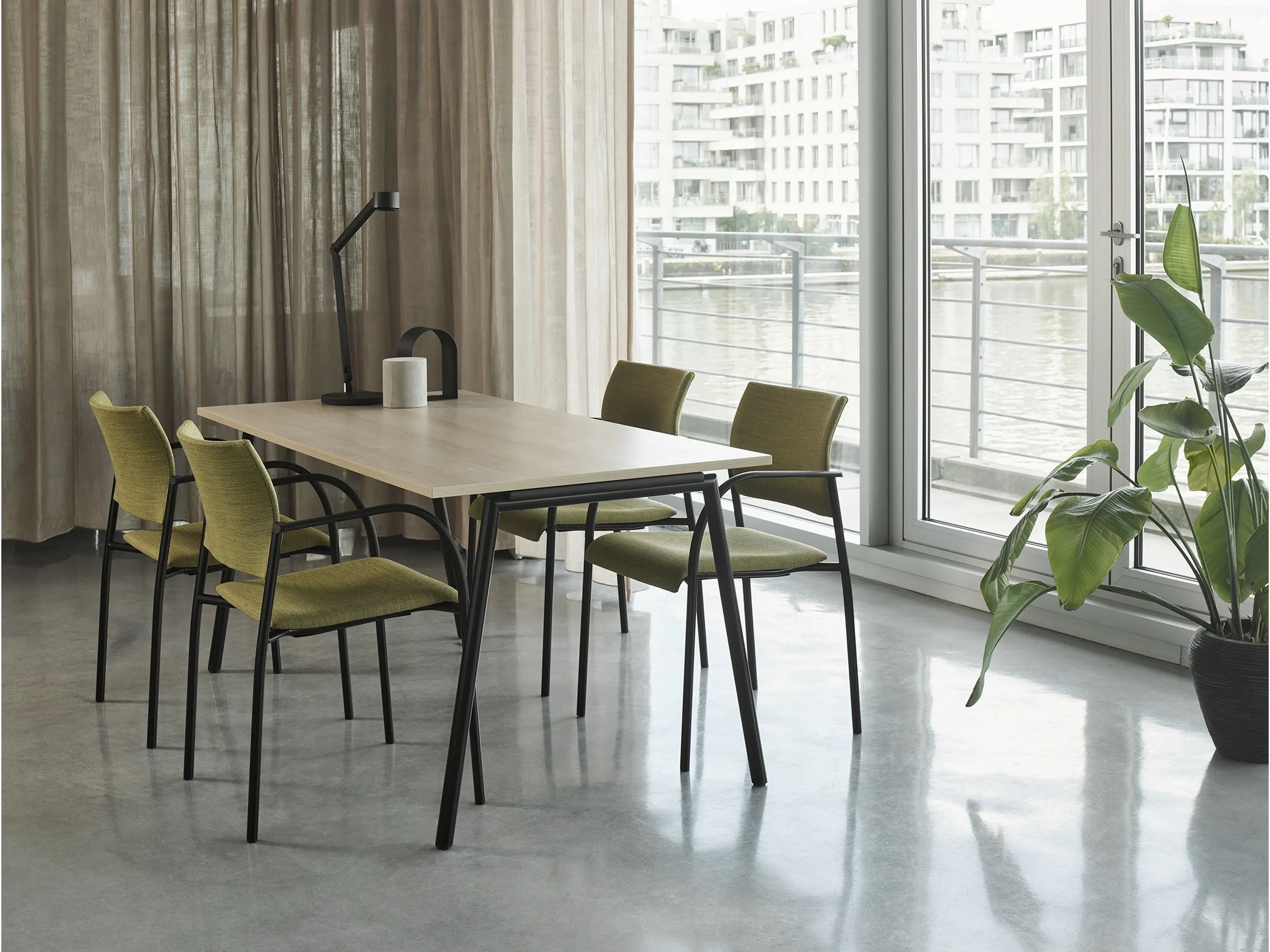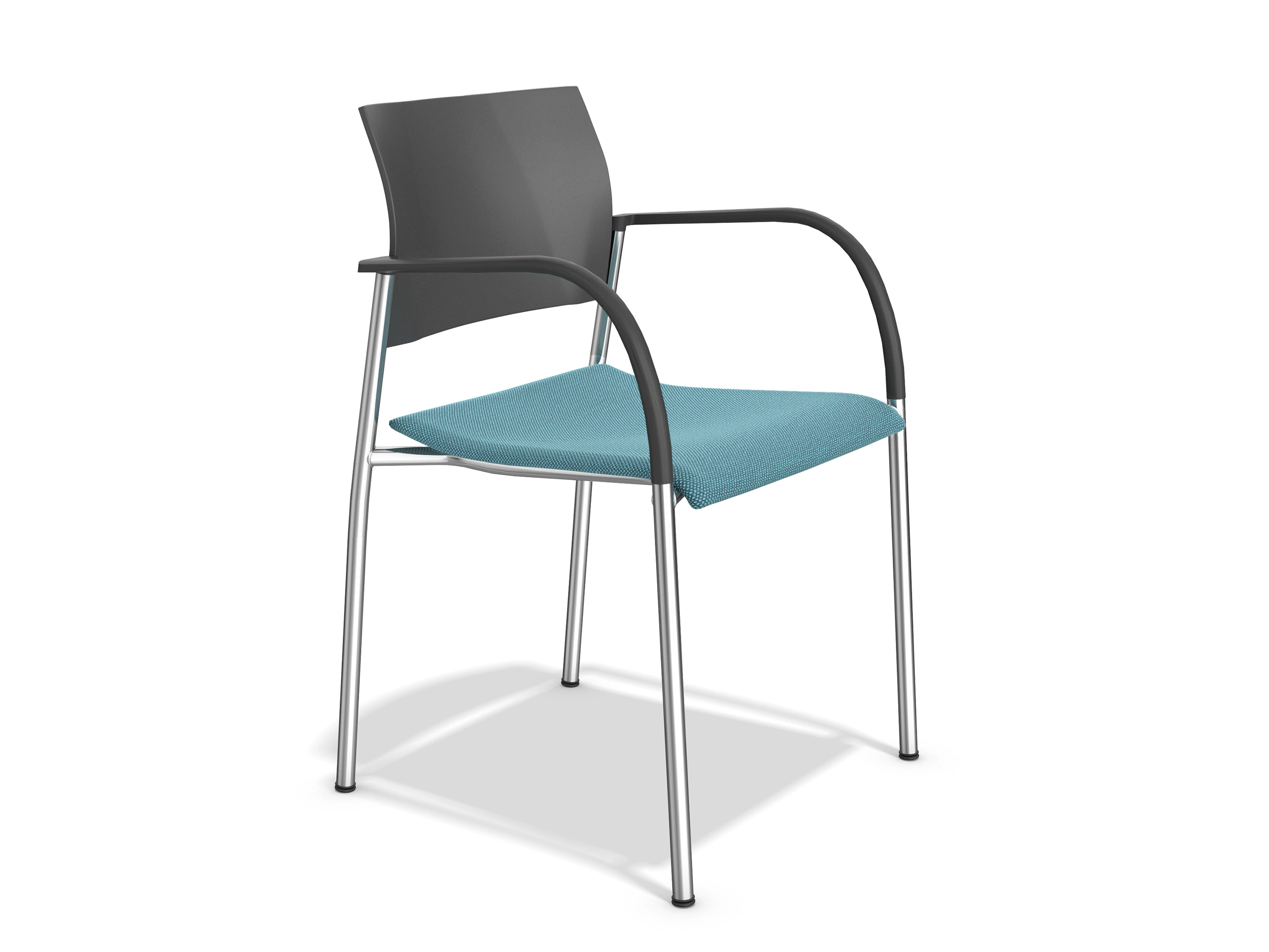 4-poots frame op kunststof glijders, met een volledig gestoffeerde zitting en rug. Inclusief armleggers. Stapelbaar tot 12 stuks op transportwagen en 8 stuks vrijstaand.