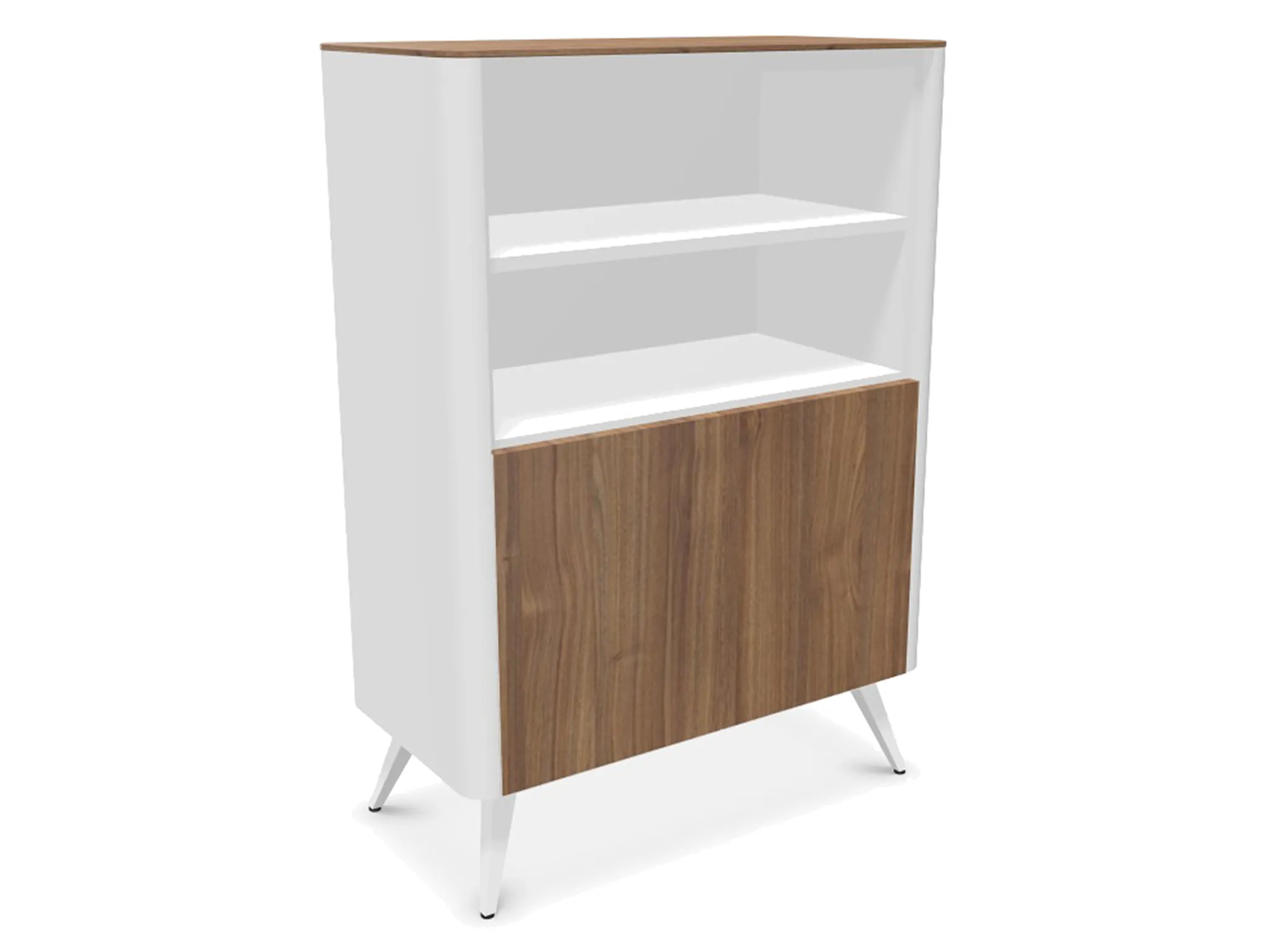 Kast volledig uit staal en een houten top. Voorzien van 2 HPL draaideuren en één groot open vak, en twee verstelbare legborden. Afmeting: 900 x 1260 x 450mm (BxHxD).