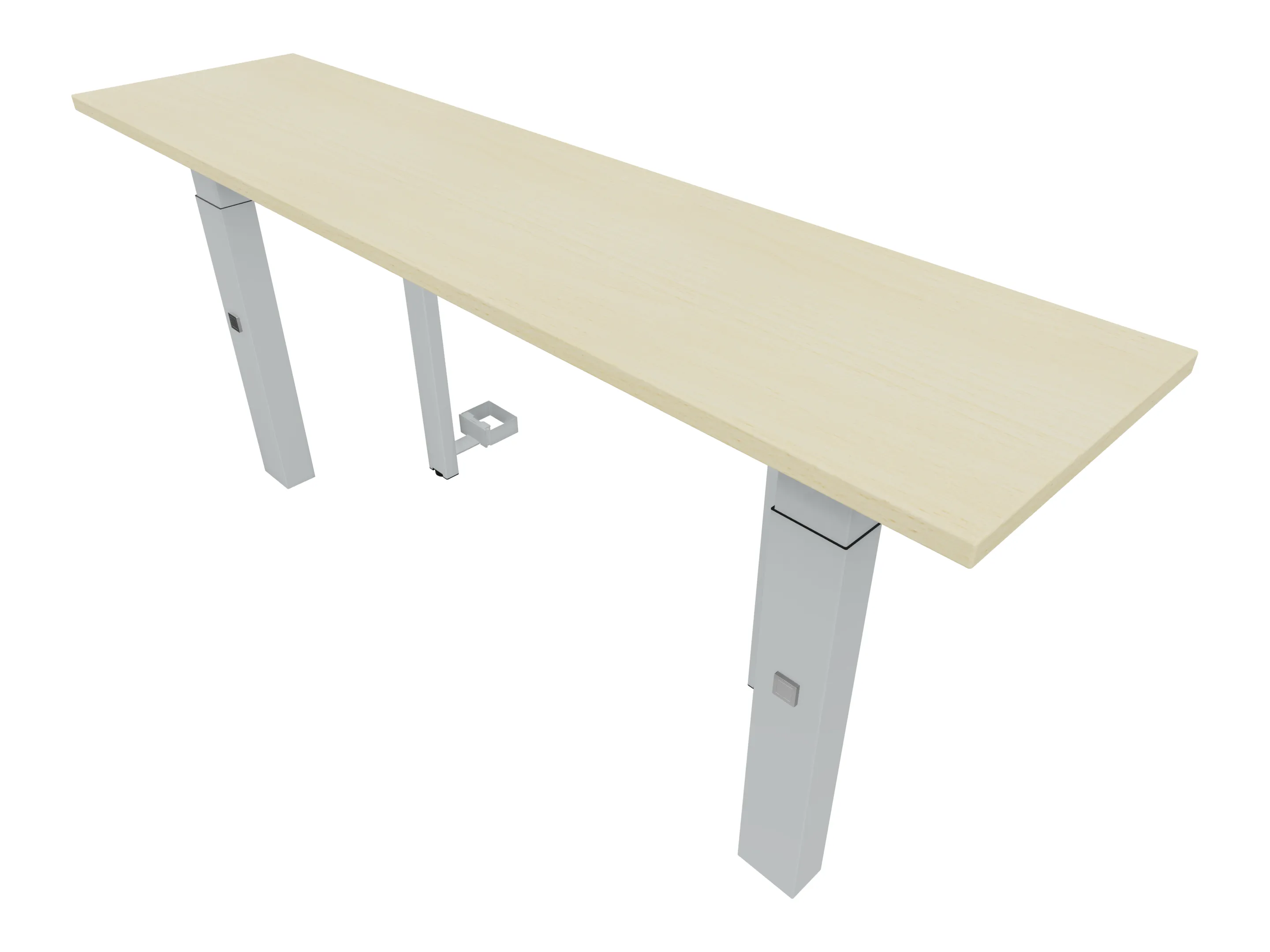 Aanbouwelement voor plaatsing aan zit-sta bureaus, van 2025mm breed en 600mm diep, voor koppeling aan poten. Inclusief twee koppel-steunpoten met hoogte verstelling (650-850mm, d.m.v. "Easy-Push").