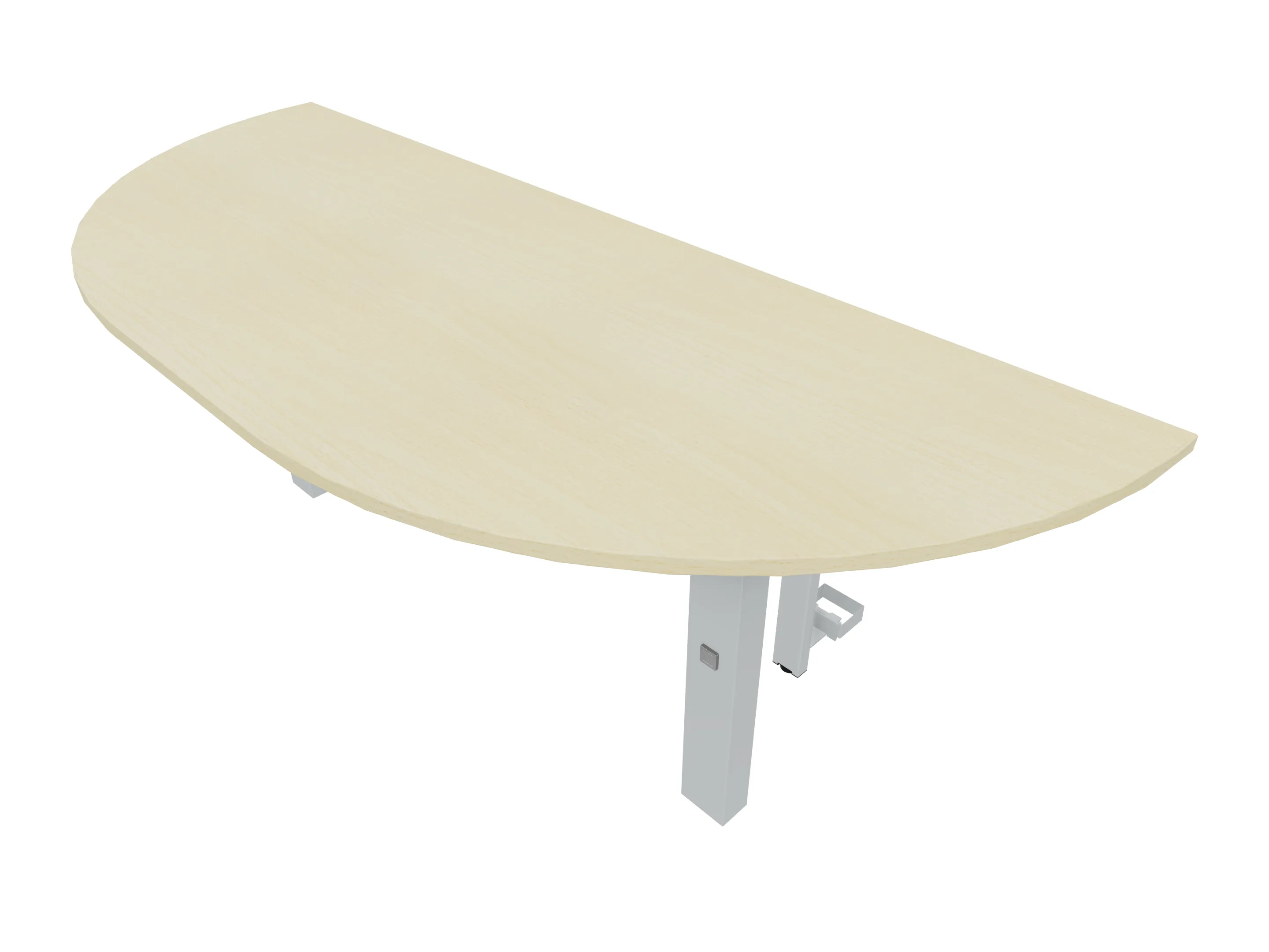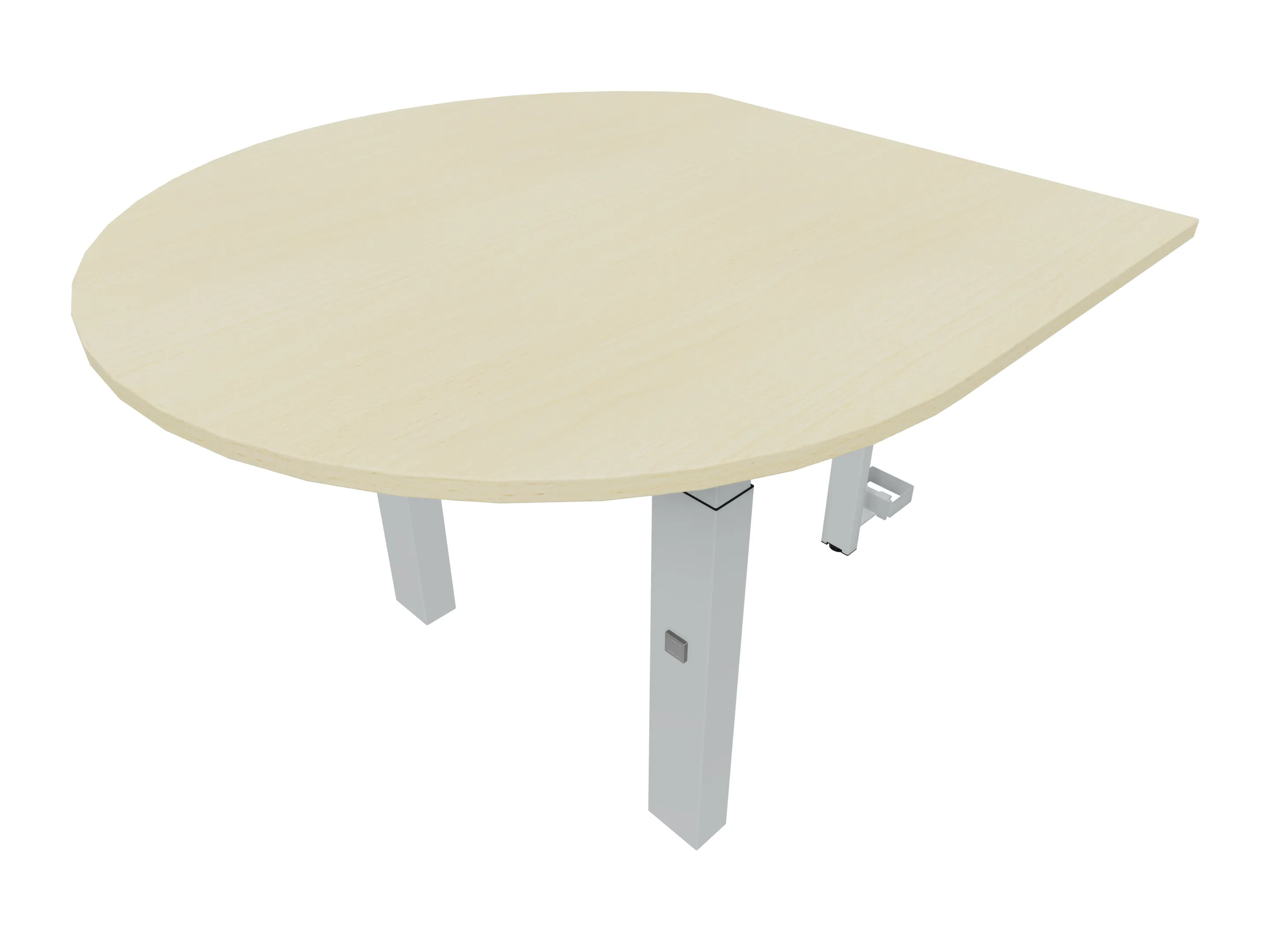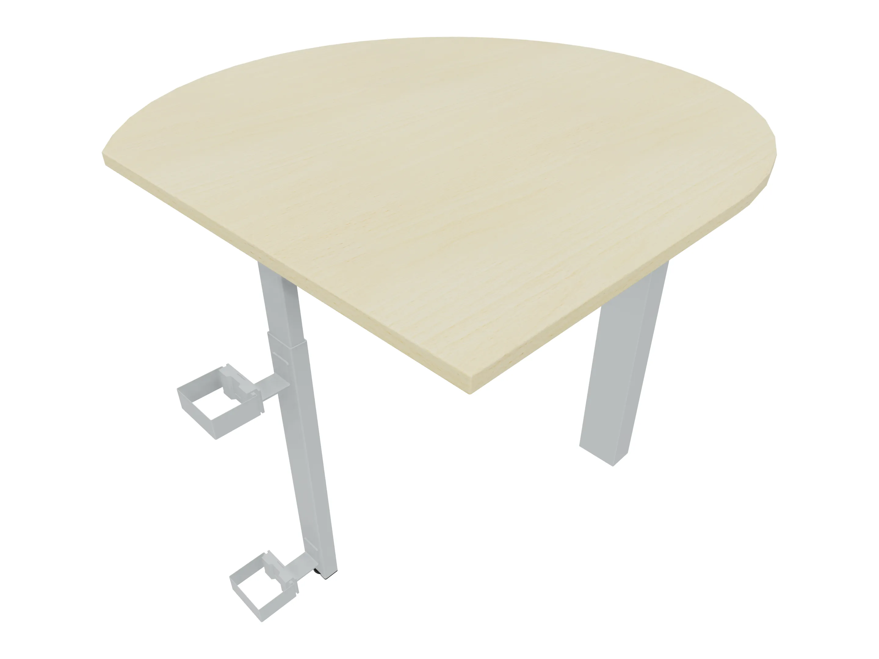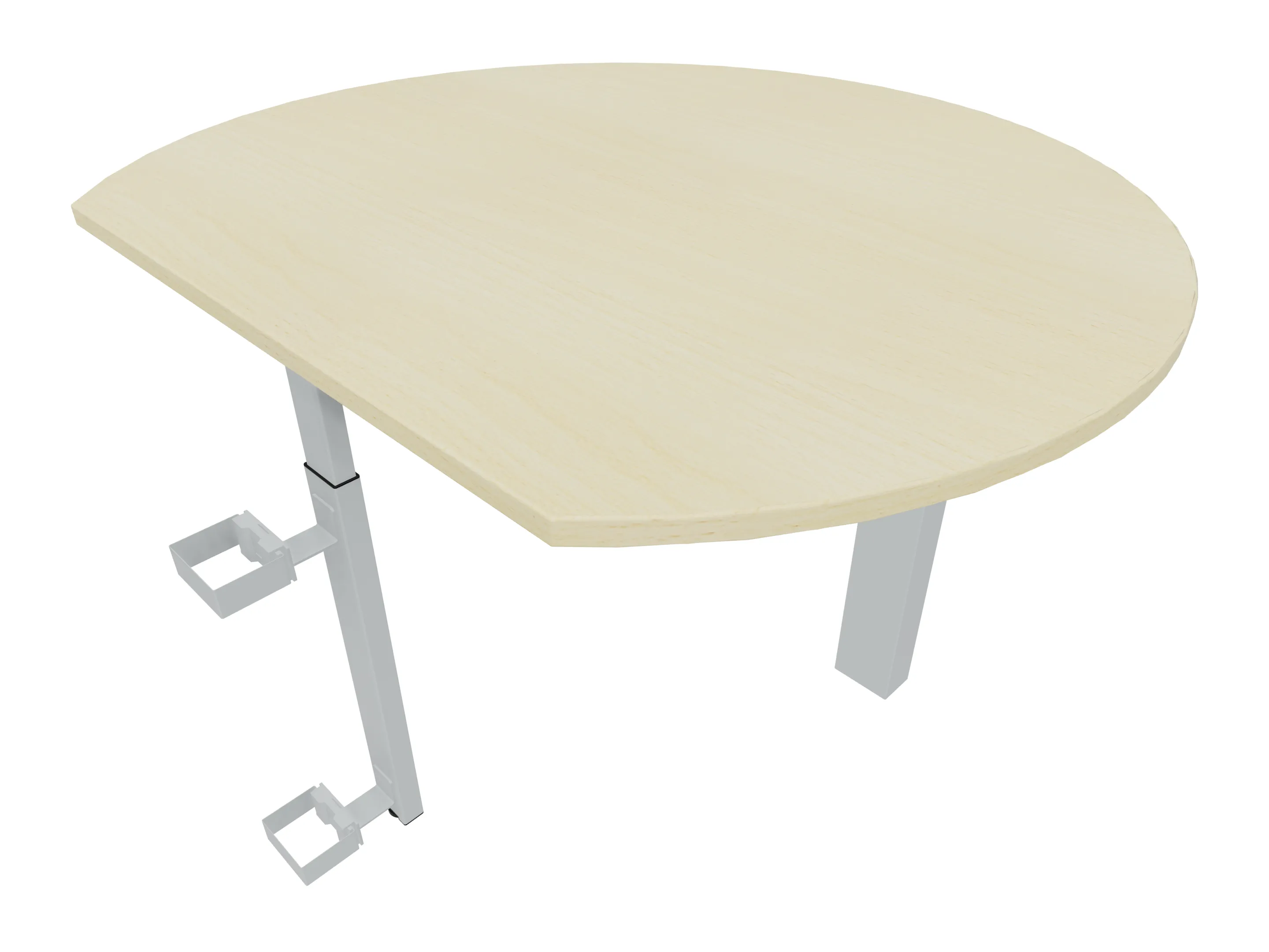 Aanbouwelement voor plaatsing aan zit-sta bureaus, van 1625mm breed en 800mm diep. Blad is voorzien van een doorlopende ronding, diameter 800mm. Inclusief twee koppel-steunpoten met hoogte verstelling (650-850mm, d.m.v. "Easy-Push").