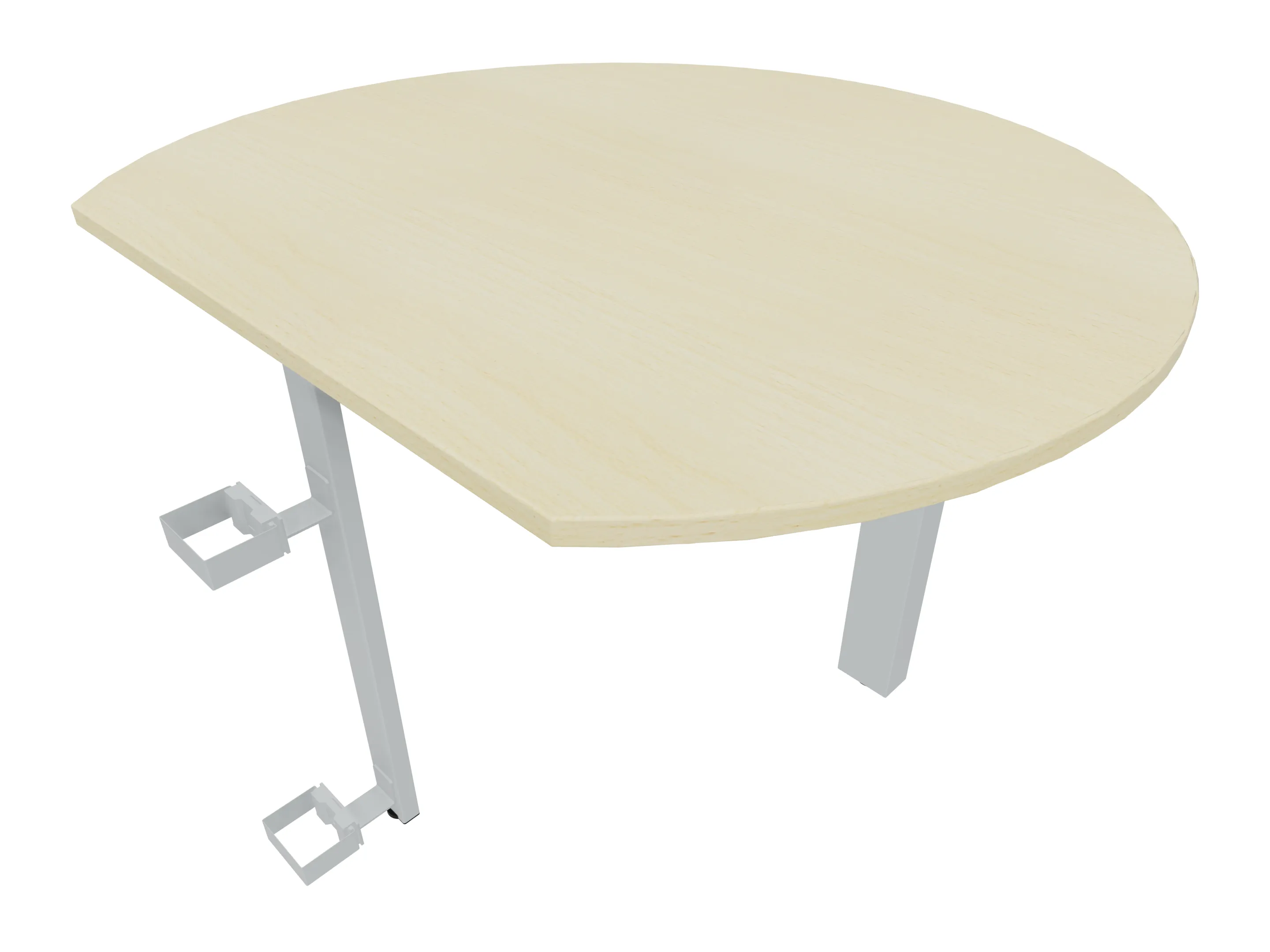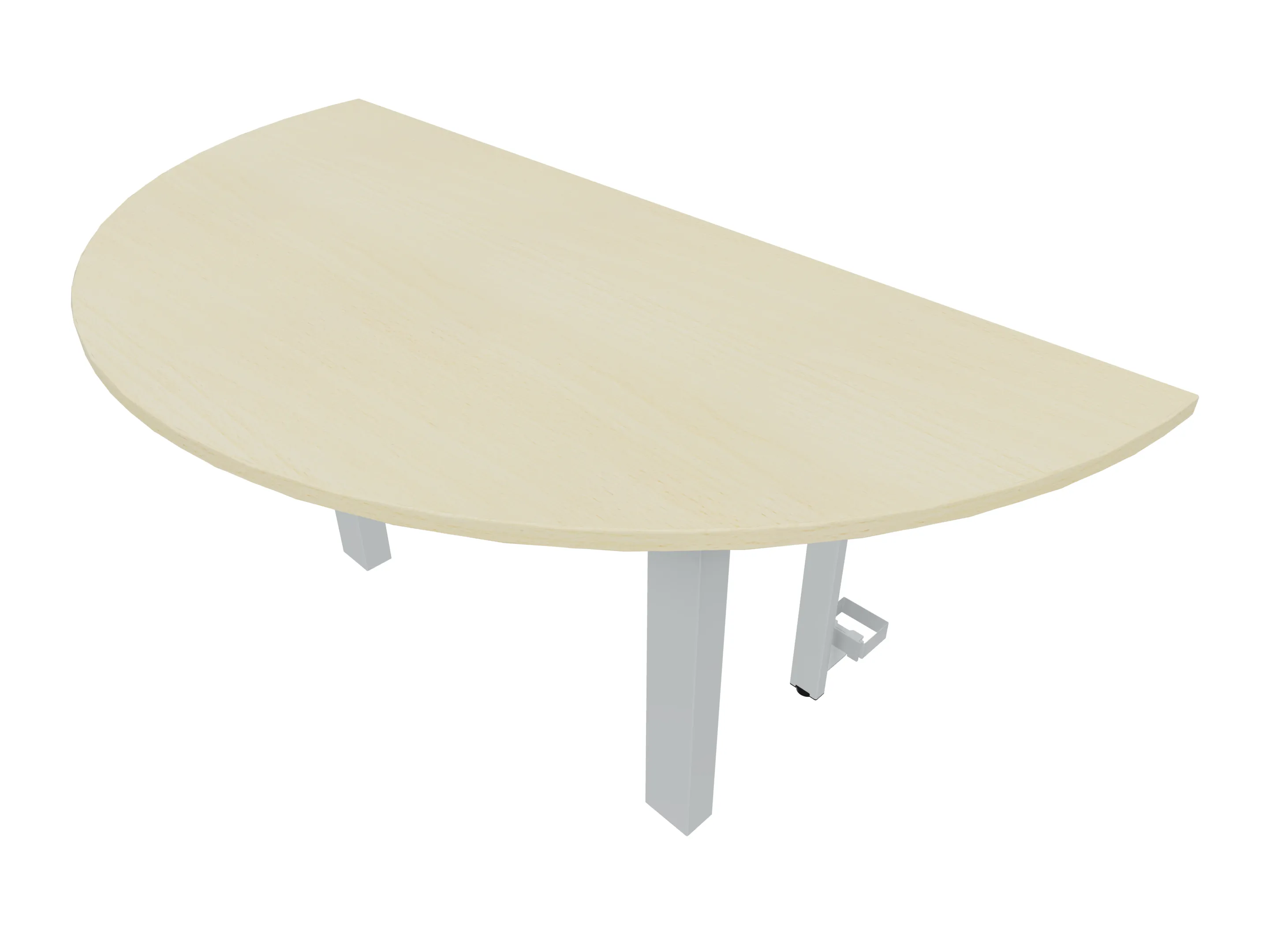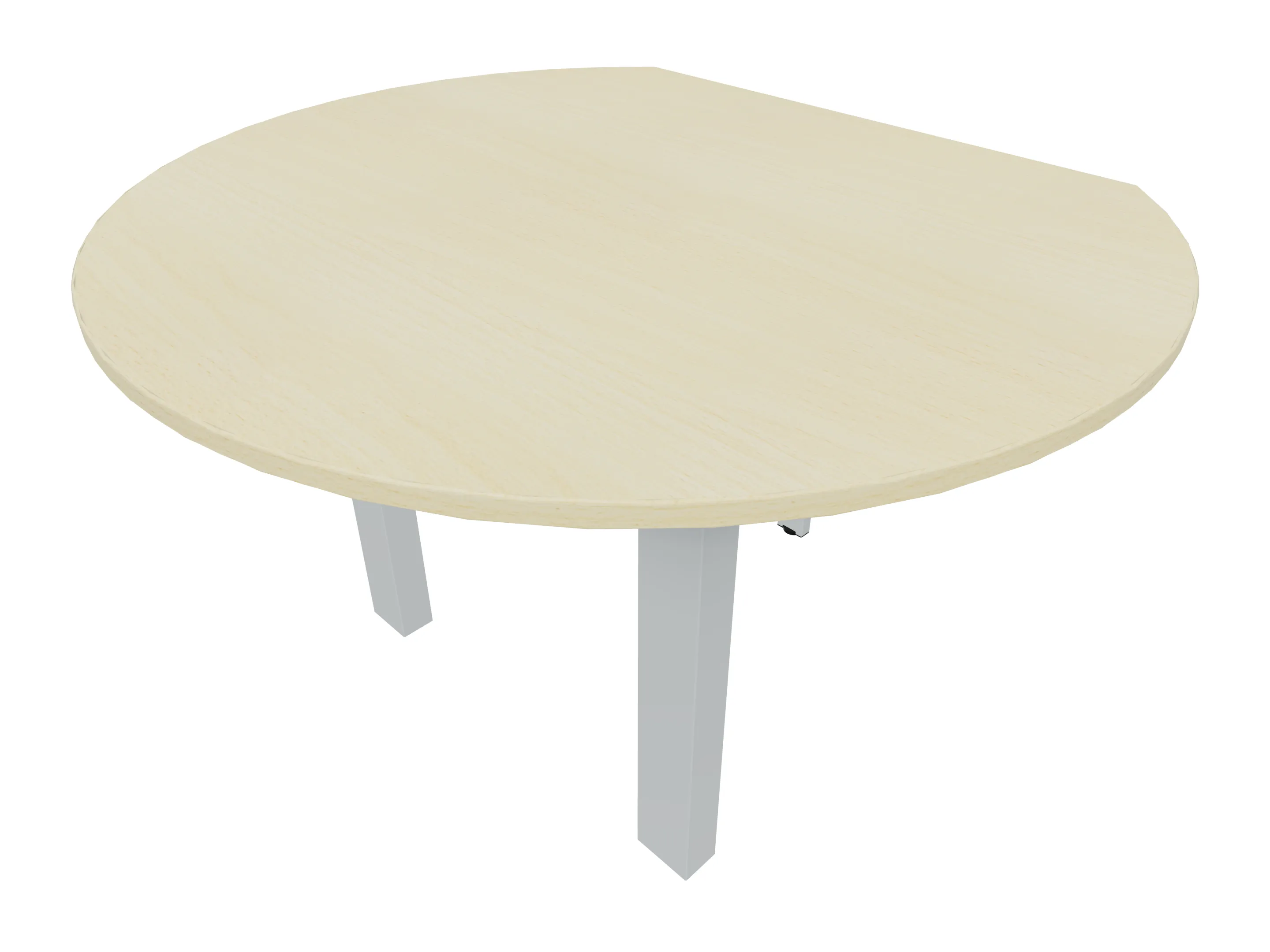 Rond aanbouwelement voor plaatsing aan zit-sta bureaus, rechts symetrisch gekoppeld. Diameter is 1200mm, koppelzijde is 800mm. Inclusief 2 koppel-steunpoten zonder hoogte verstelling