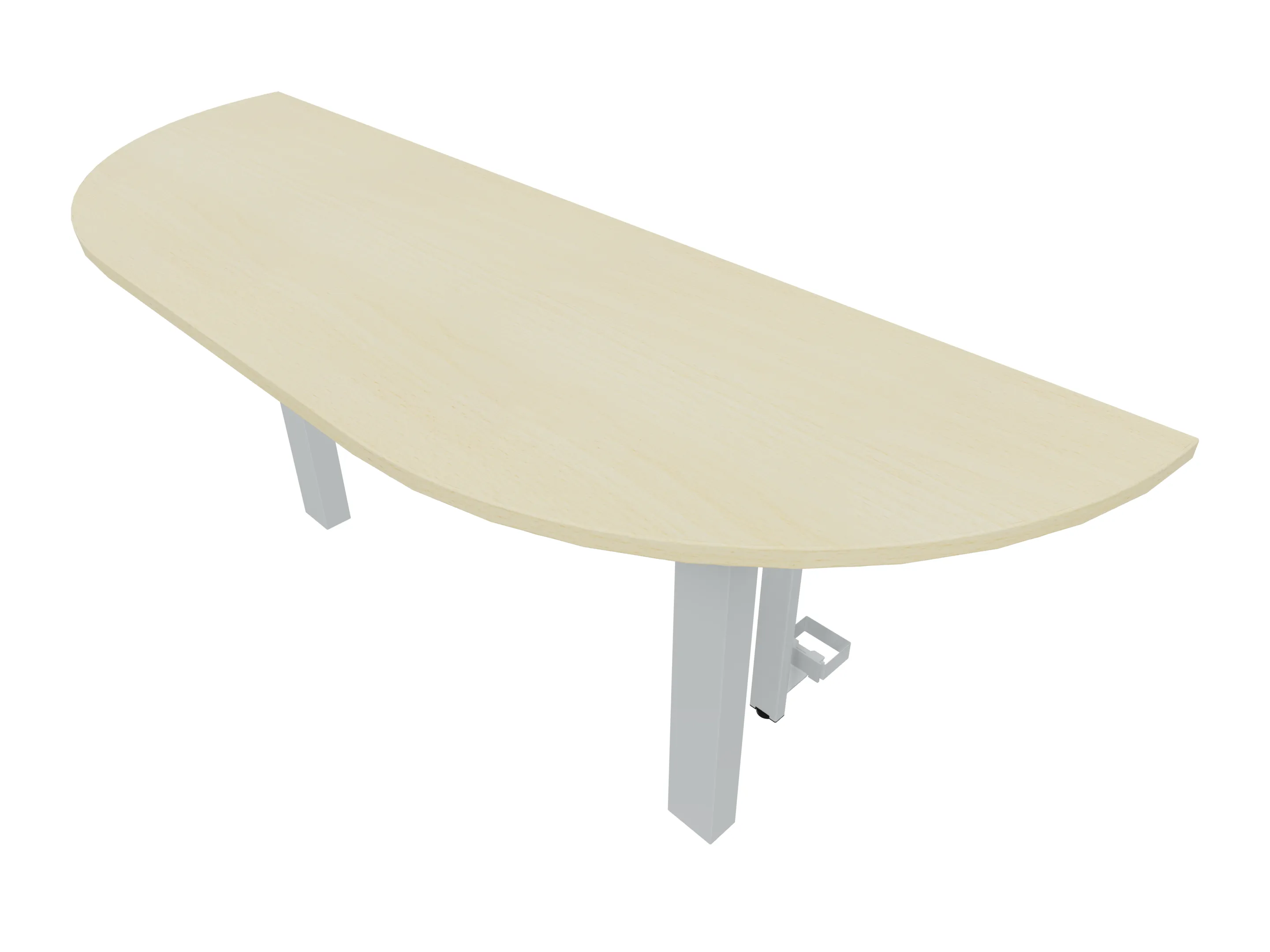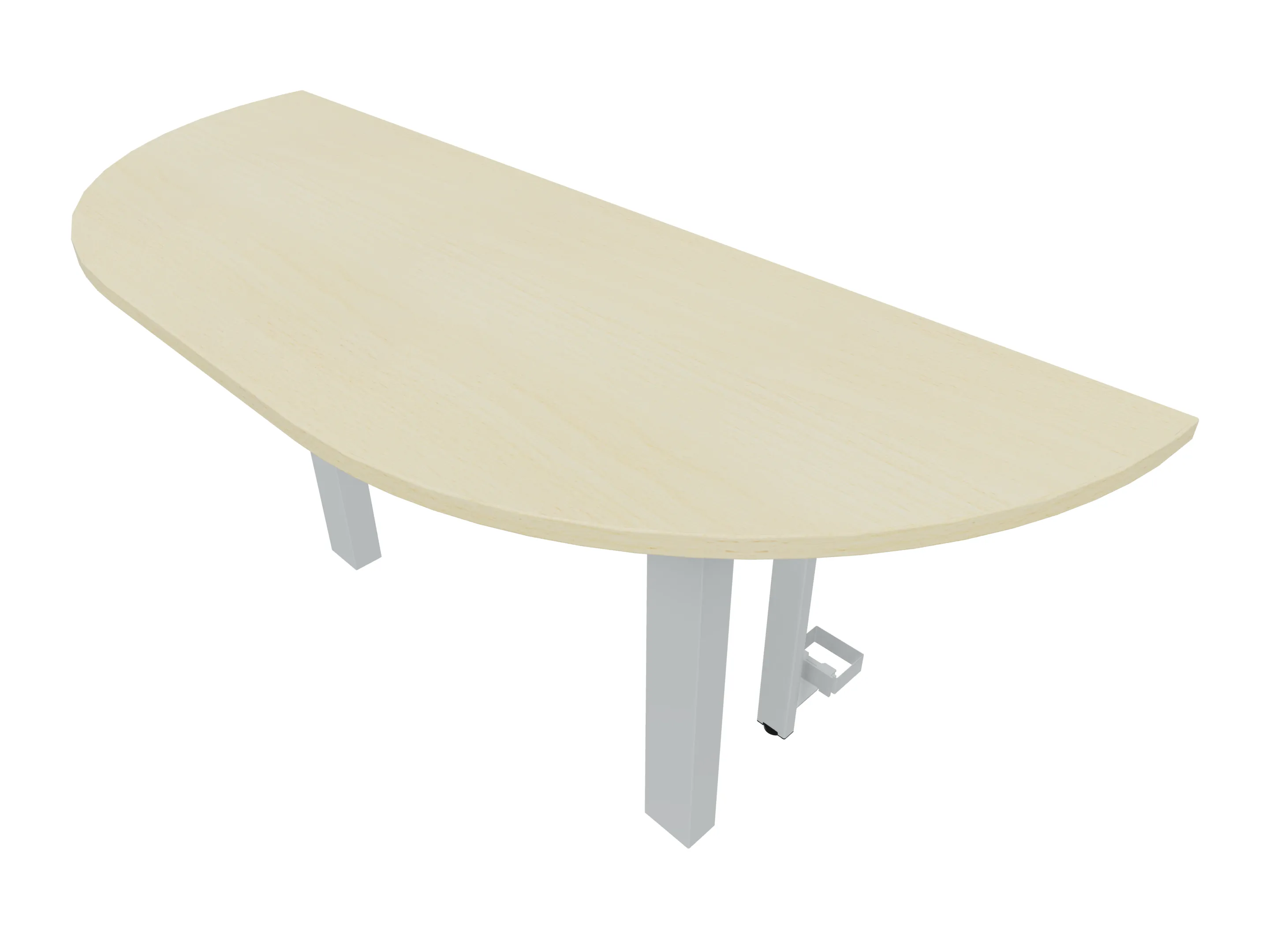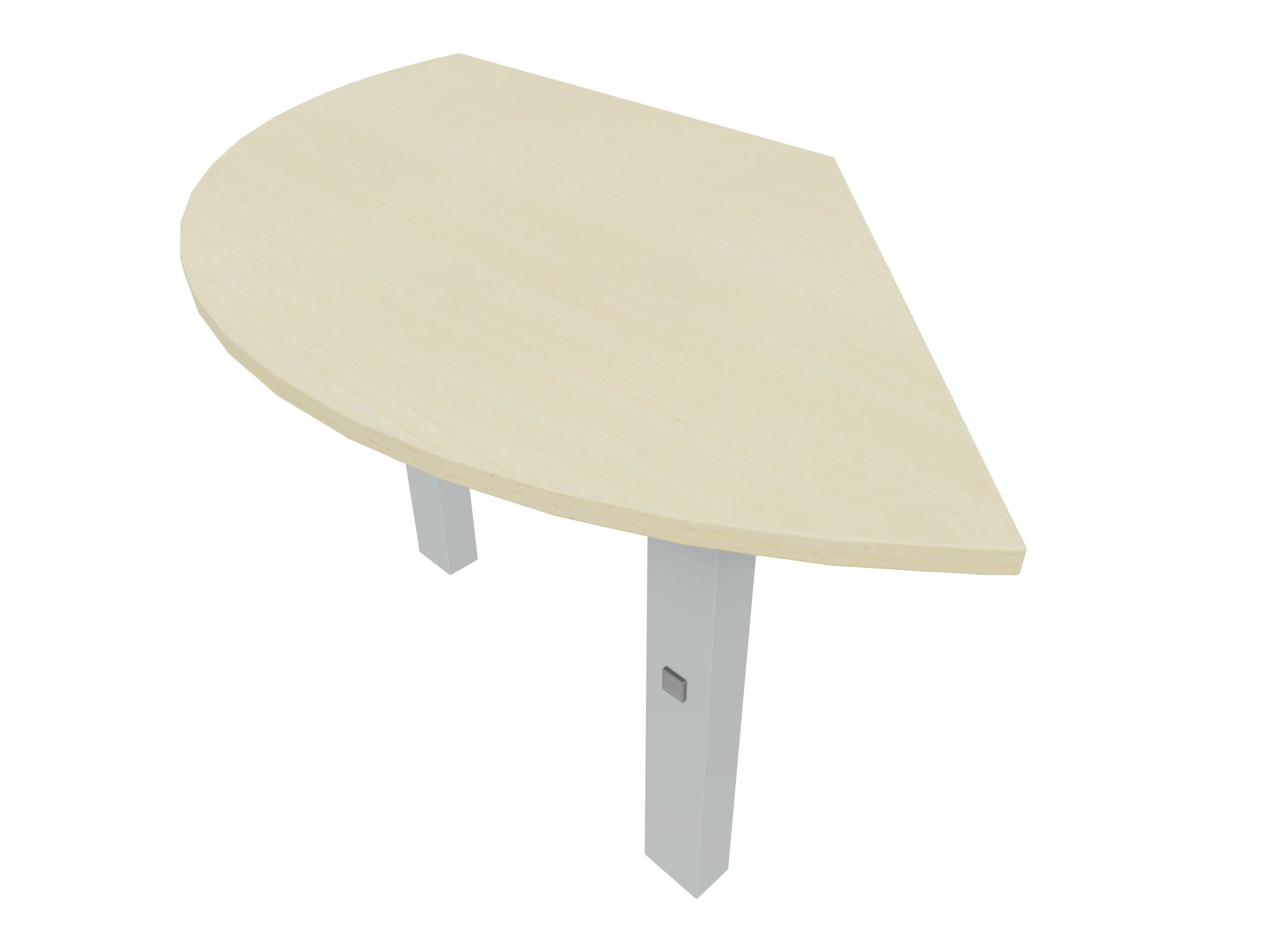 Rond aanbouwelement voor plaatsing aan zit-sta bureaus, rechts symetrisch gekoppeld. Diameter is 1200mm, koppelzijde is 800mm. Inclusief 2 koppel-steunpoten zonder hoogte verstelling