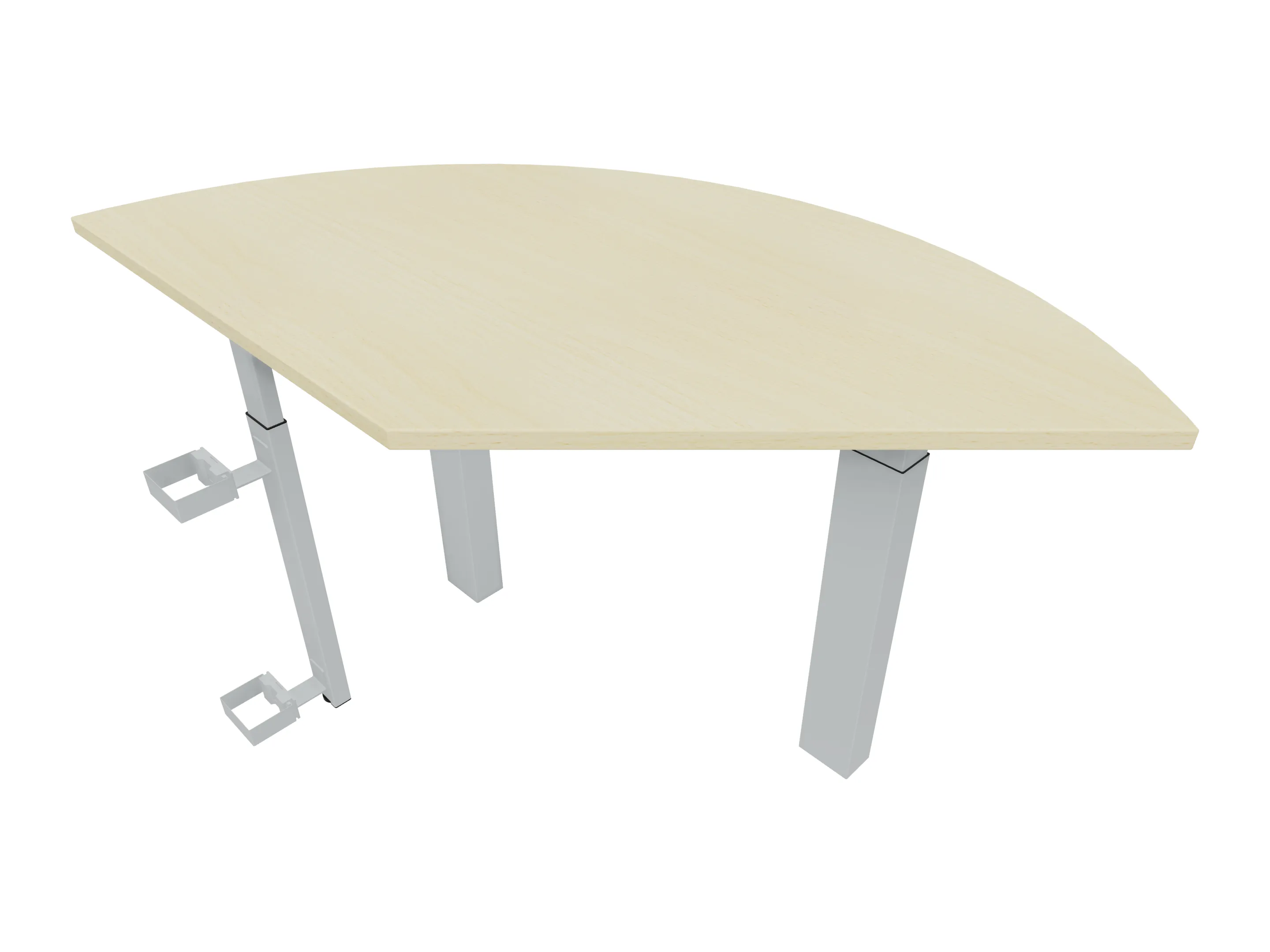 Aanbouwelement voor plaatsing aan zit-sta bureaus, in hoek van 135°, aanbouwzijde van 800mm, ,zitzijde van 800, en in radius 800mm. Links geplaatst aan het bureau. Inclusief koppel-steunpoten met hoogte verstelling (650-850mm, d.m.v. "Easy-Push").