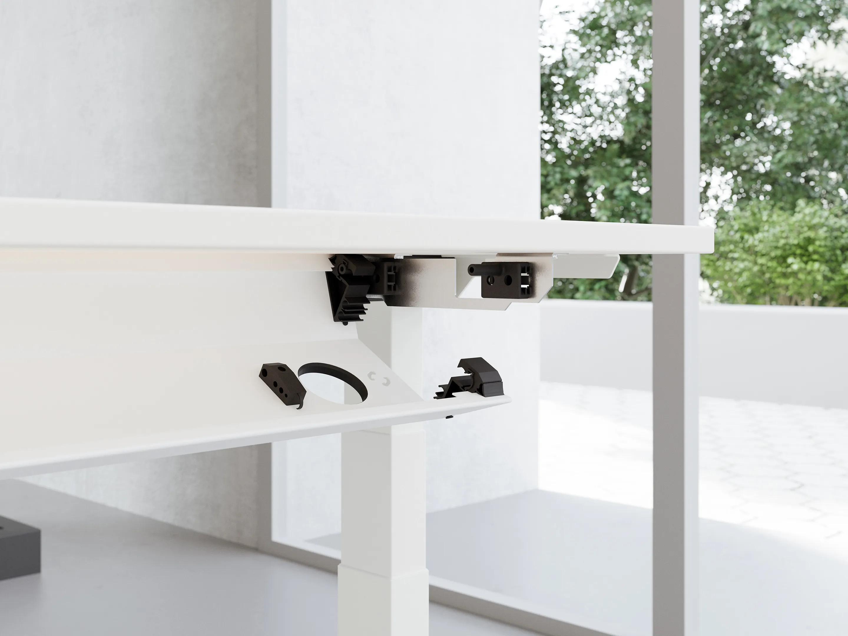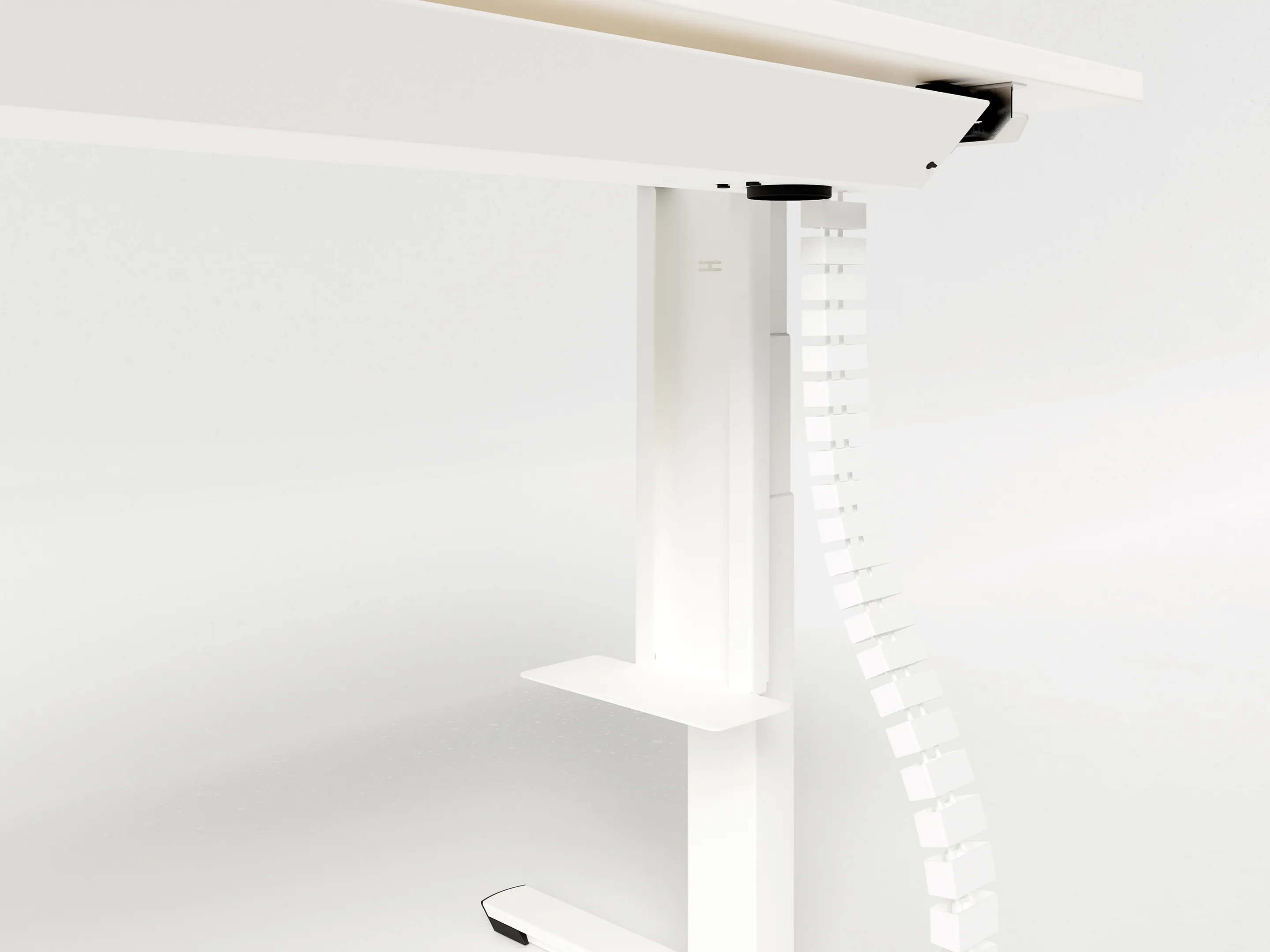 Bureau met twee eindpoten (elektrisch hoogte instelbaar tussen 650-1300mm d.m.v. bediening) en geintegreerde druppel linkssachter. Afmeting: 2200 x 800mm de druppel heeft een diameter van 1100mm. Onderstel is 400mm kleiner dan het bureau.