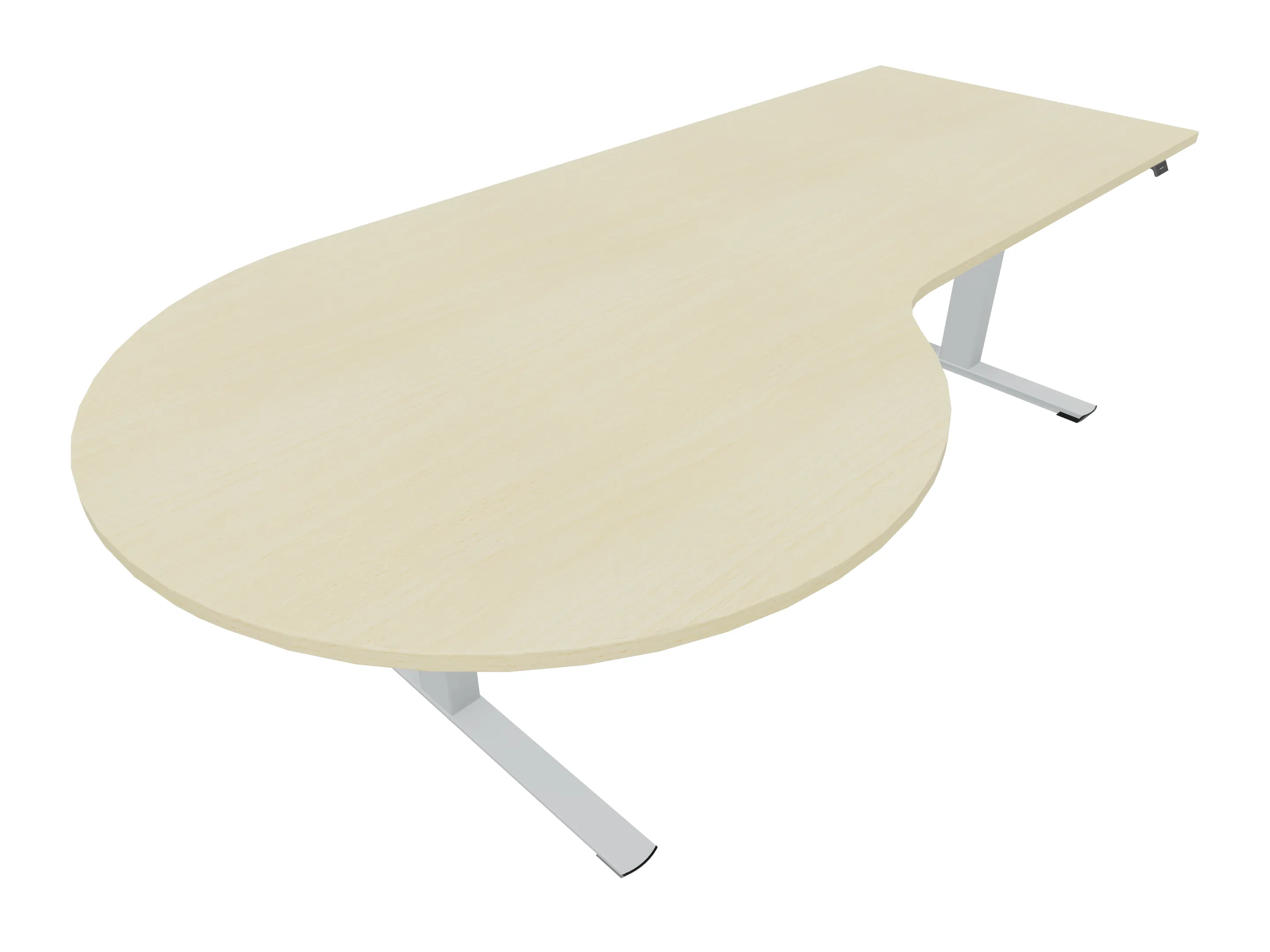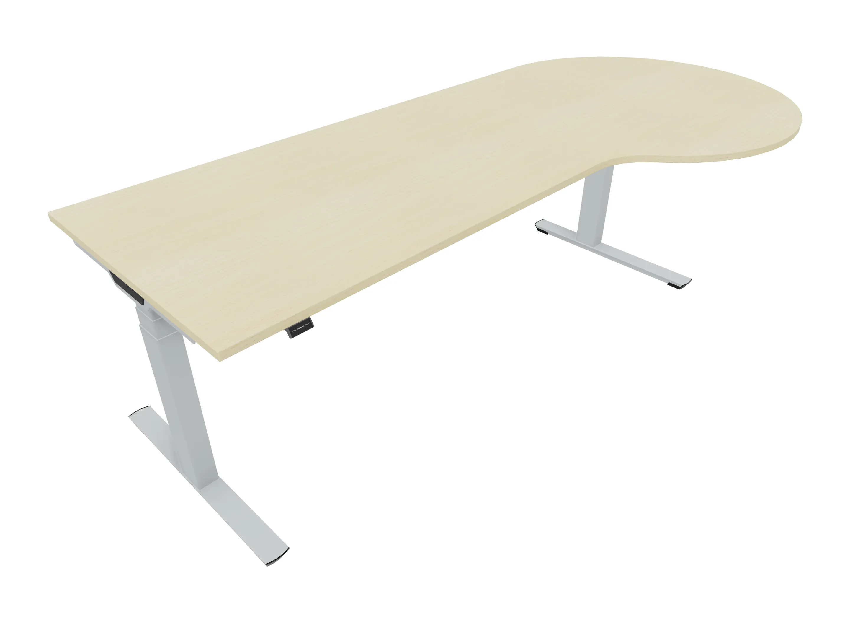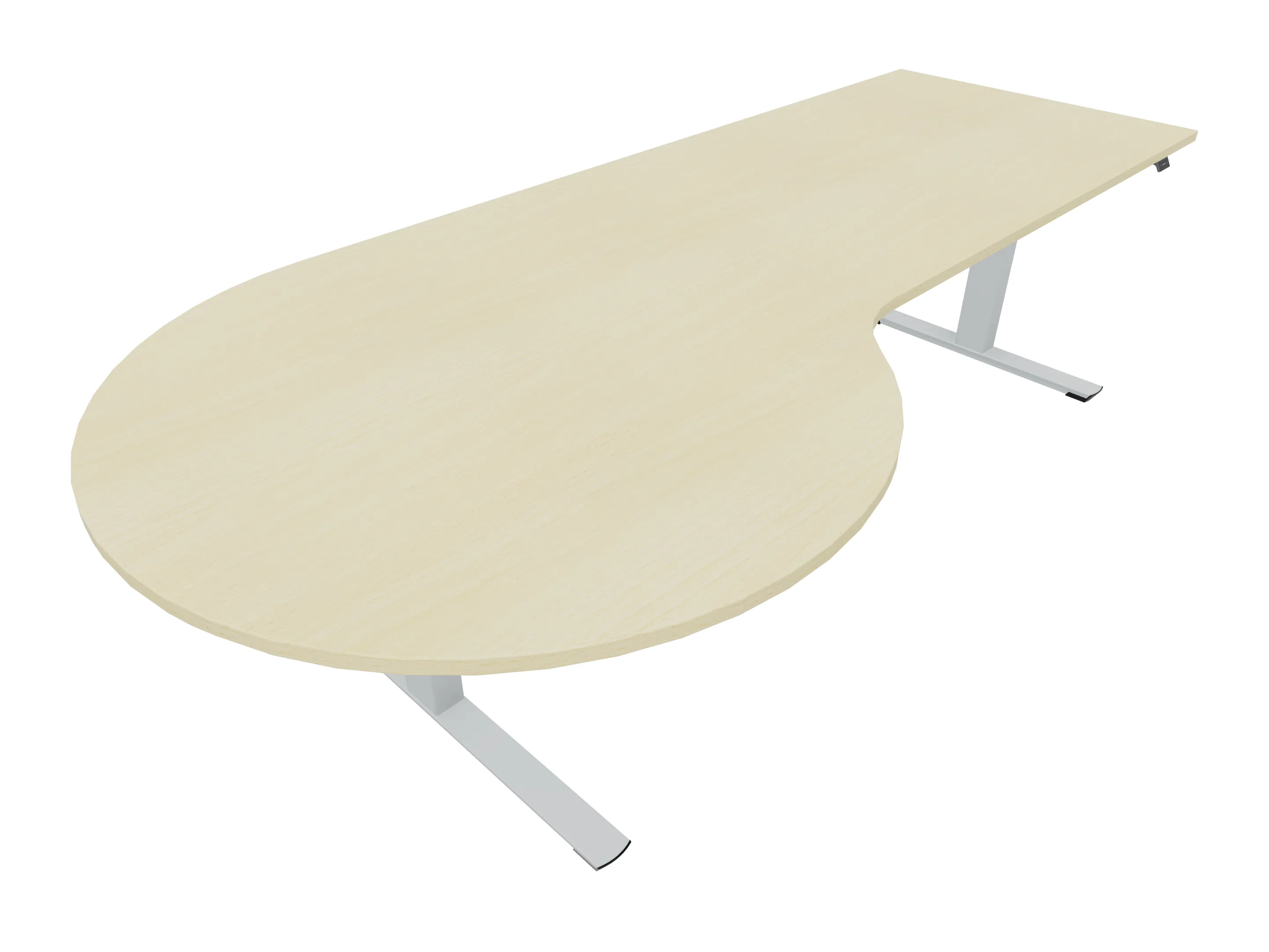 Bureau met twee eindpoten (elektrisch hoogte instelbaar tussen 650-1300mm d.m.v. bediening) en geintegreerde druppel linksvoor. Afmeting: 2400 x 800mm de druppel heeft een diameter van 1100mm. Onderstel is 400mm kleiner dan het bureau.