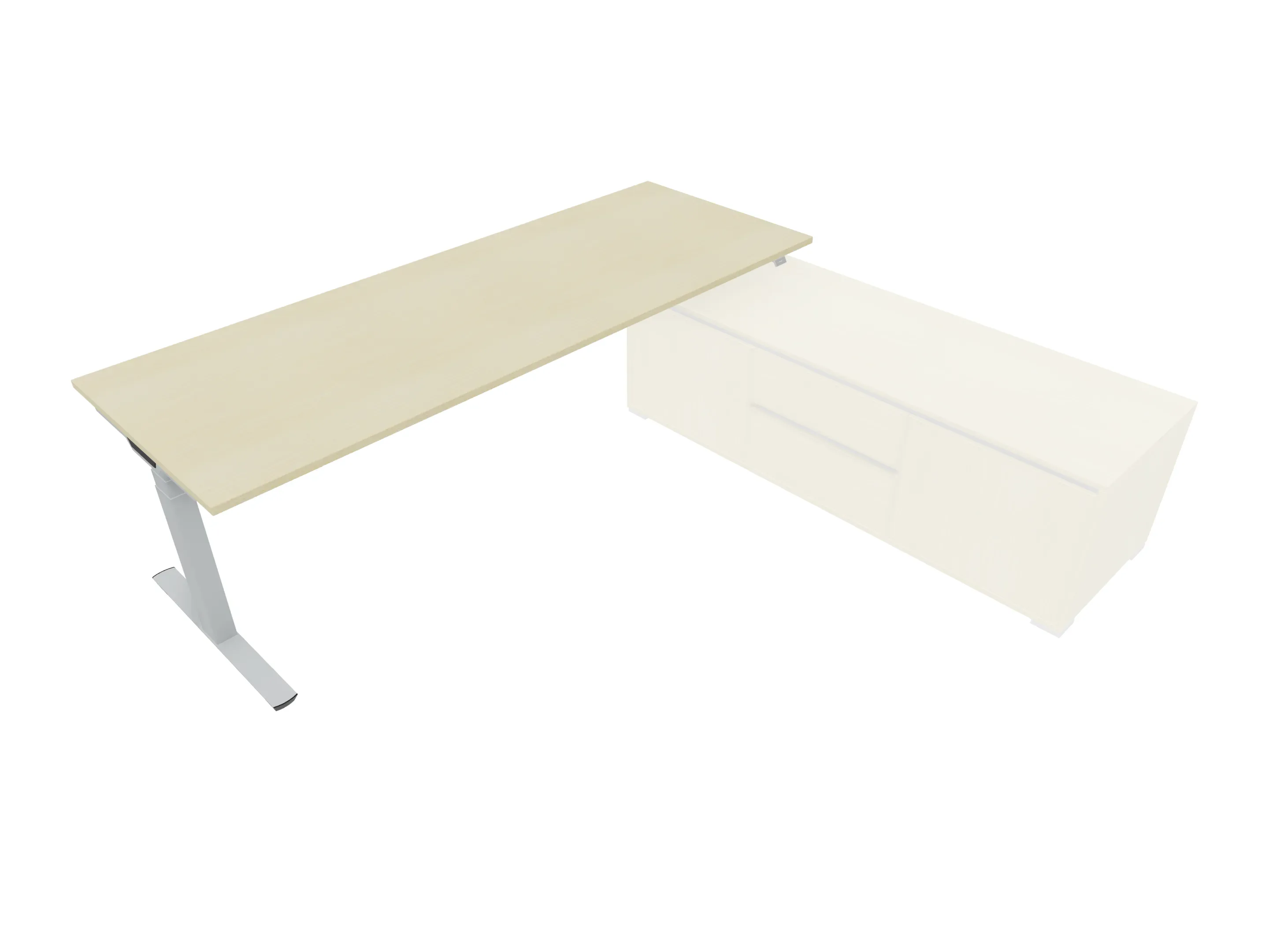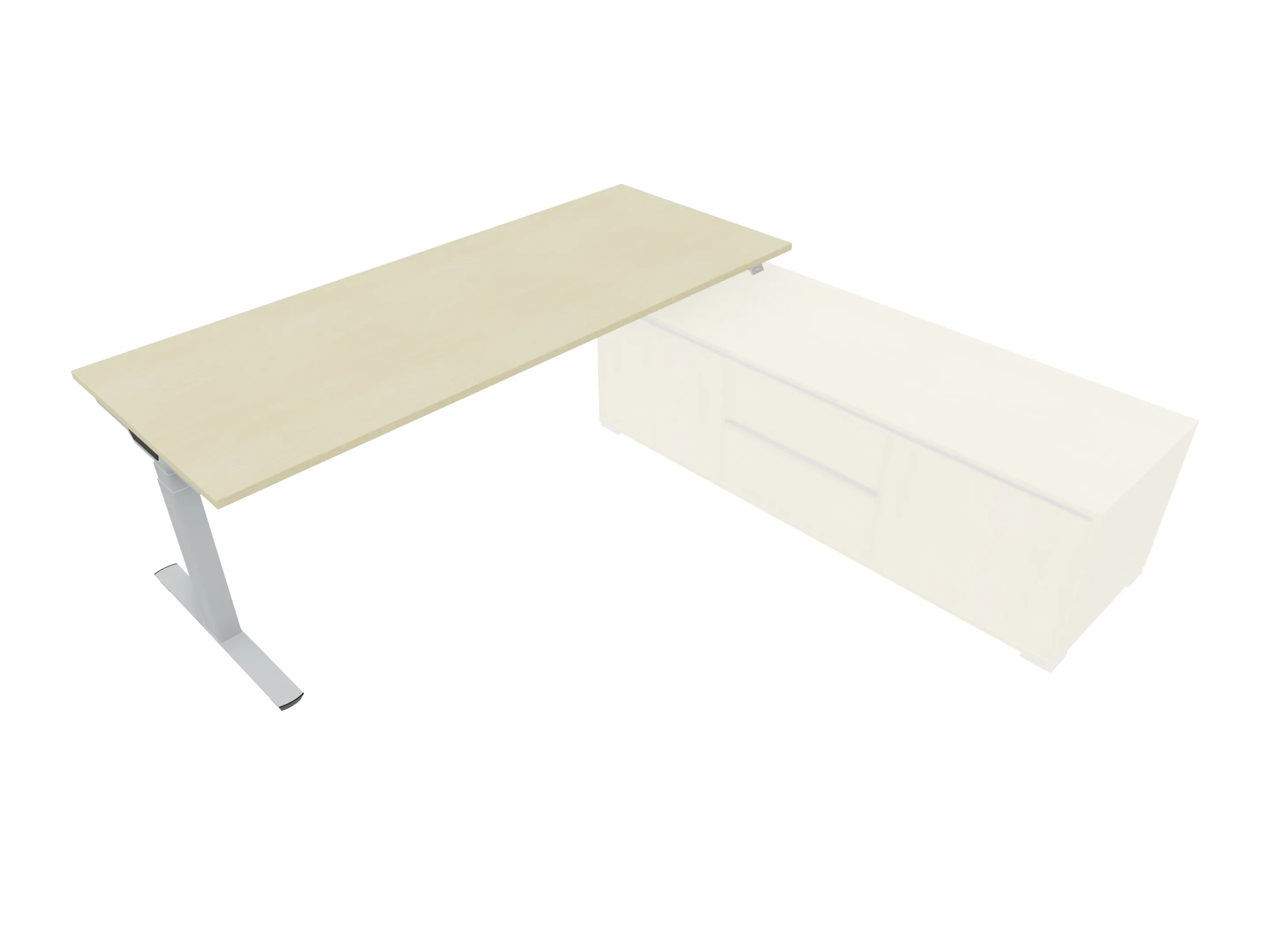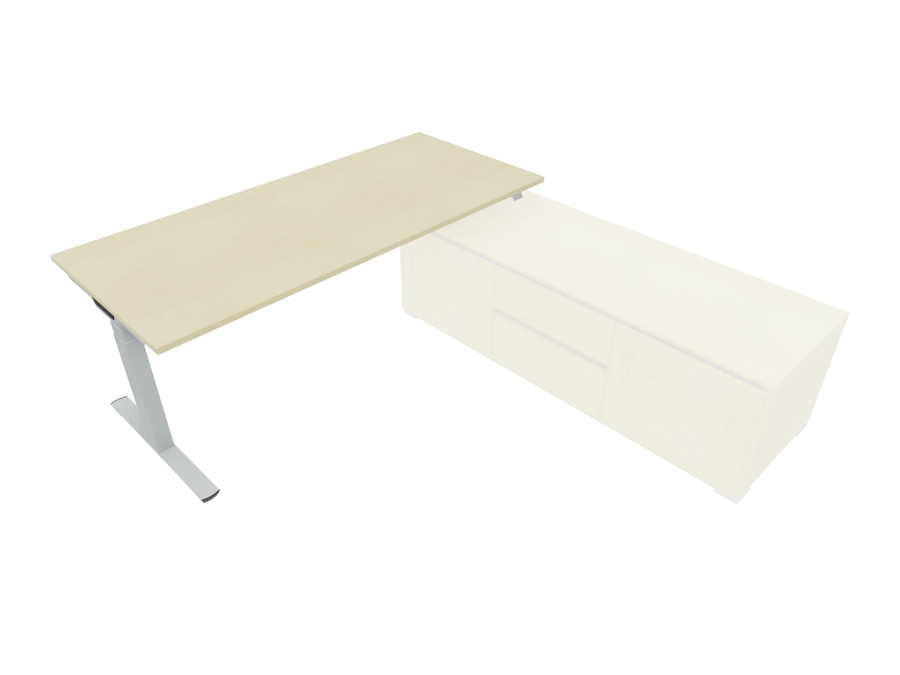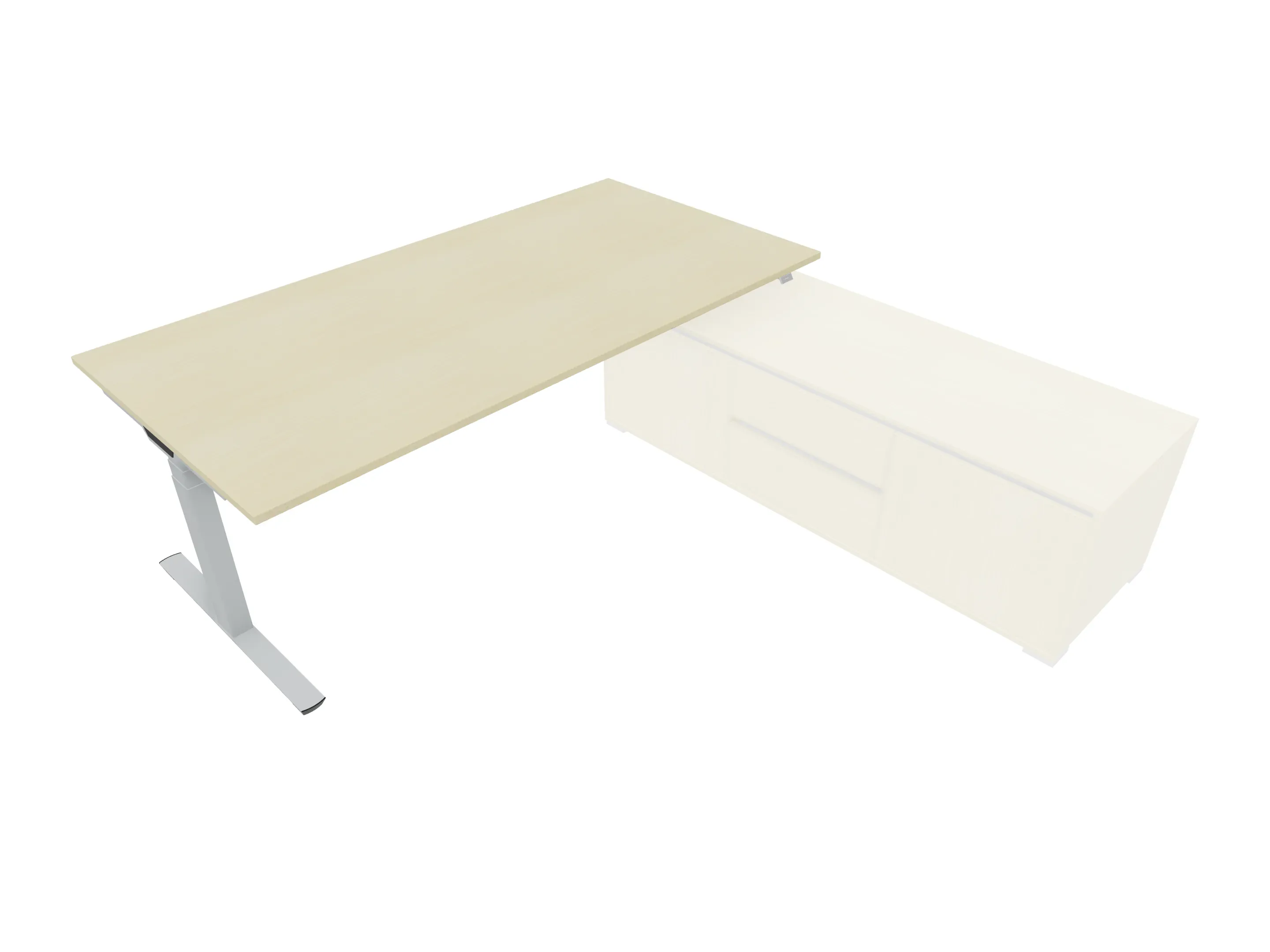 Bureau met rechts inzetdeel zonder teen t.b.v. docking in de modulekast, dwarsbalk 200 mm ingesprongen, links standaard poot, inclusief montage set. Elektrisch verstelbaar d.m.v. bediening tussen: 650-1300mm