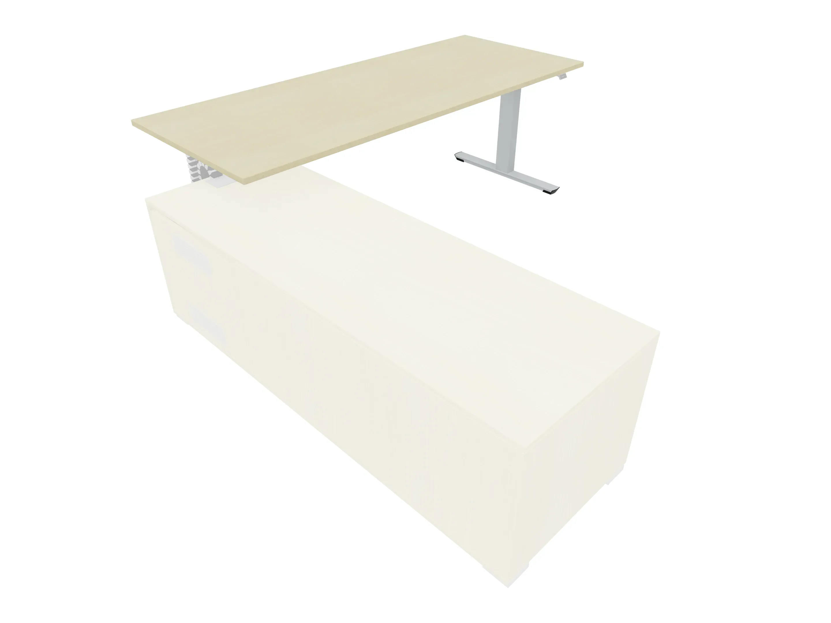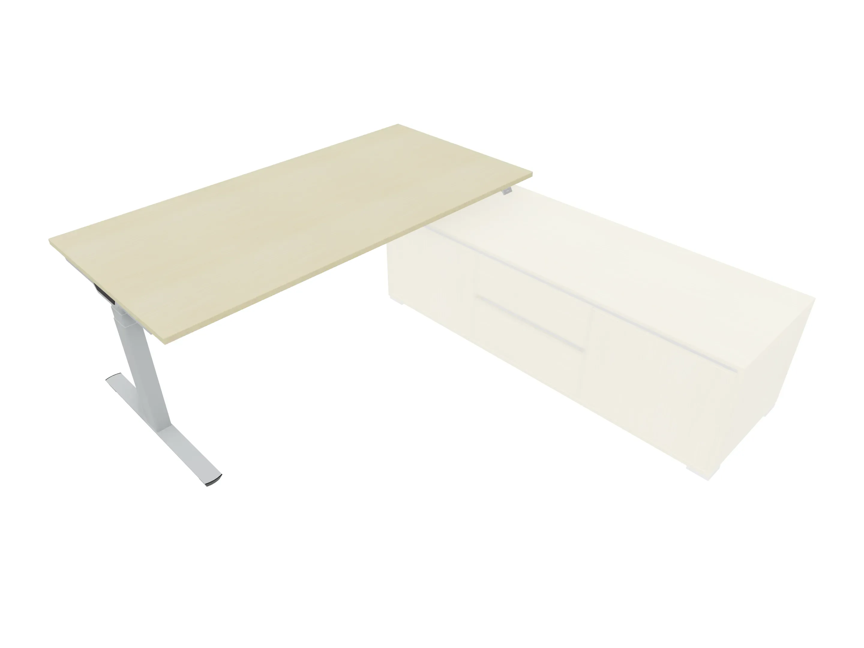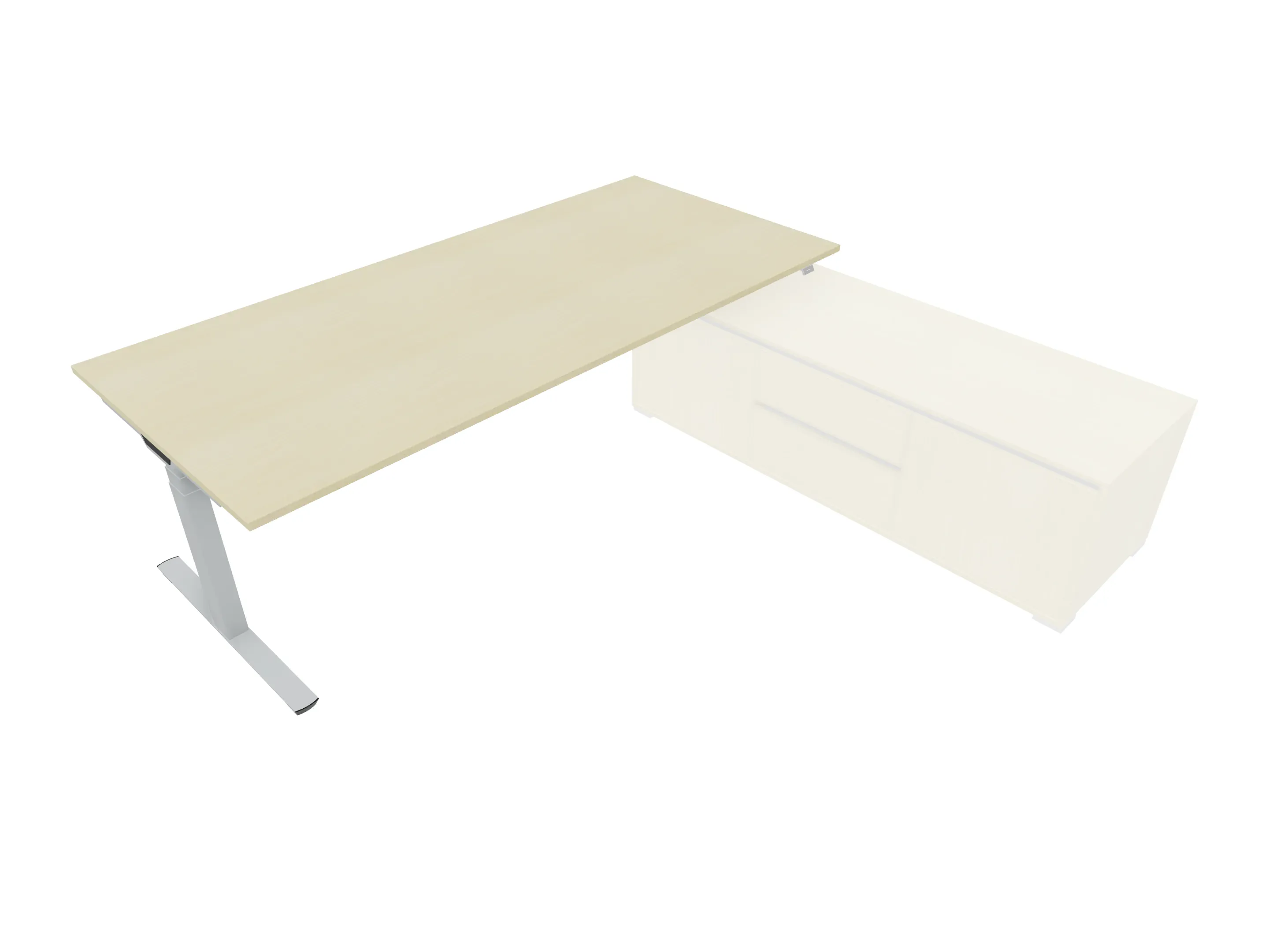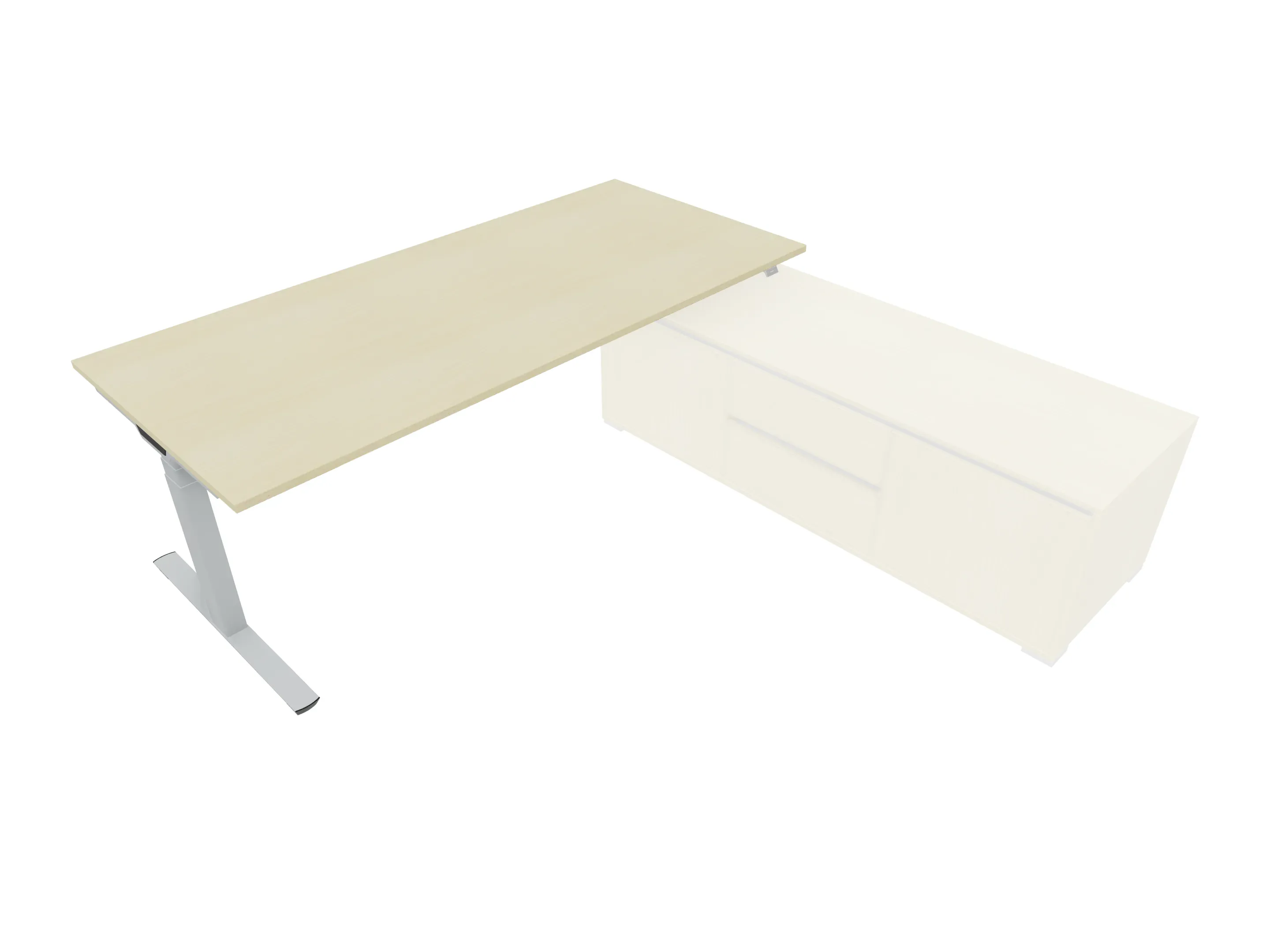 Bureau met rechts inzetdeel zonder teen t.b.v. docking in de modulekast, dwarsbalk 200 mm ingesprongen, links standaard poot, inclusief montage set. Elektrisch verstelbaar d.m.v. bediening tussen: 650-1300mm