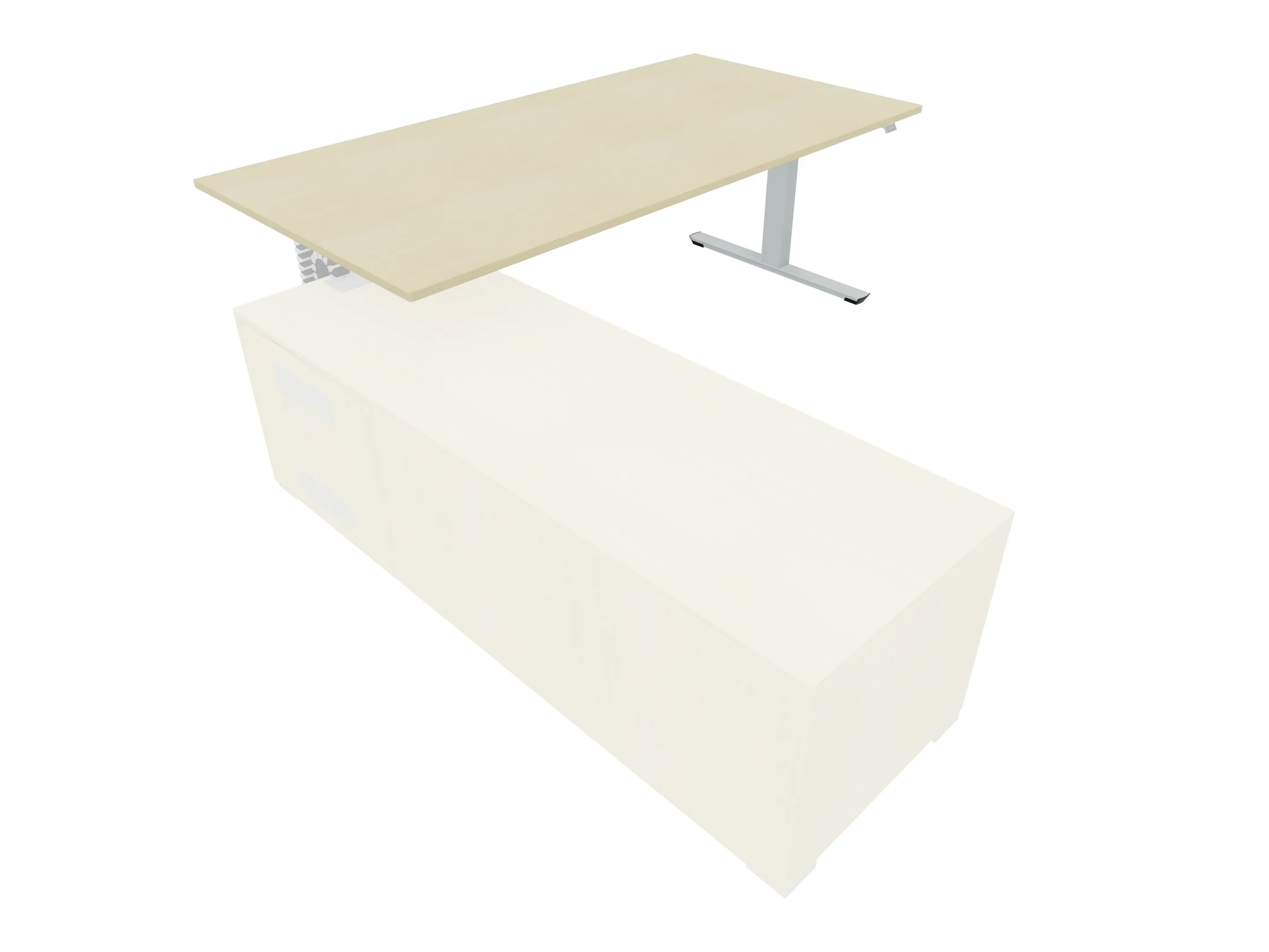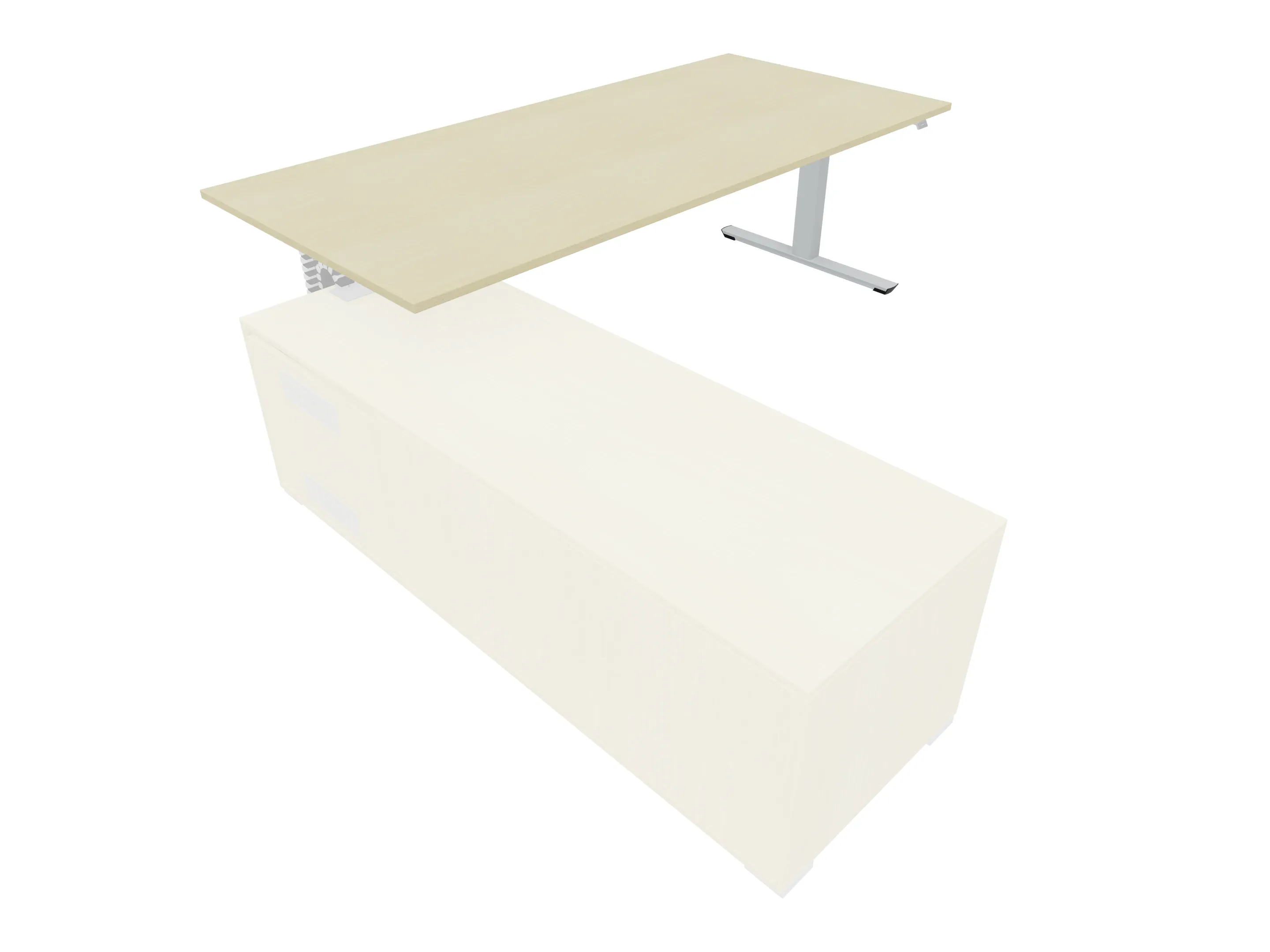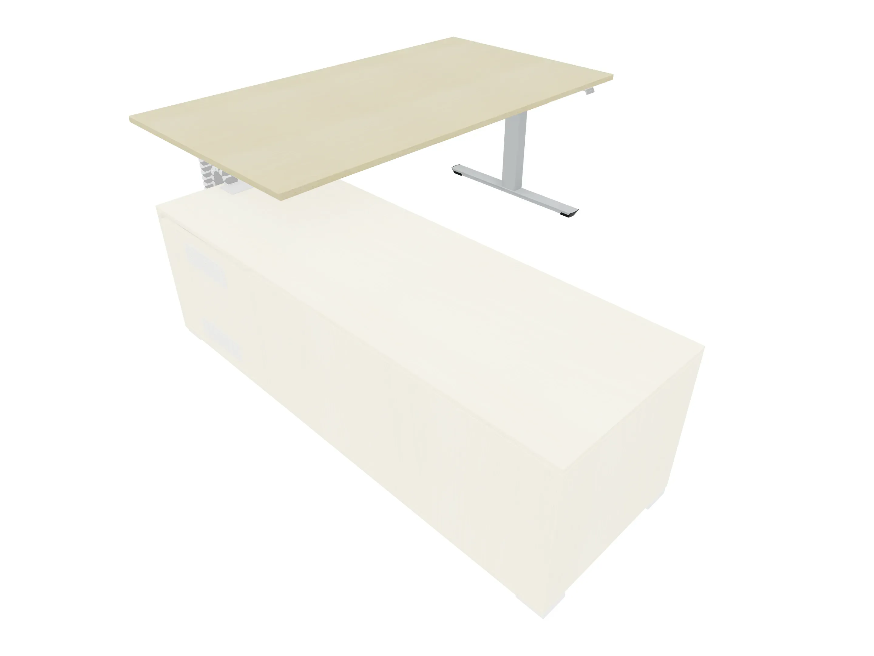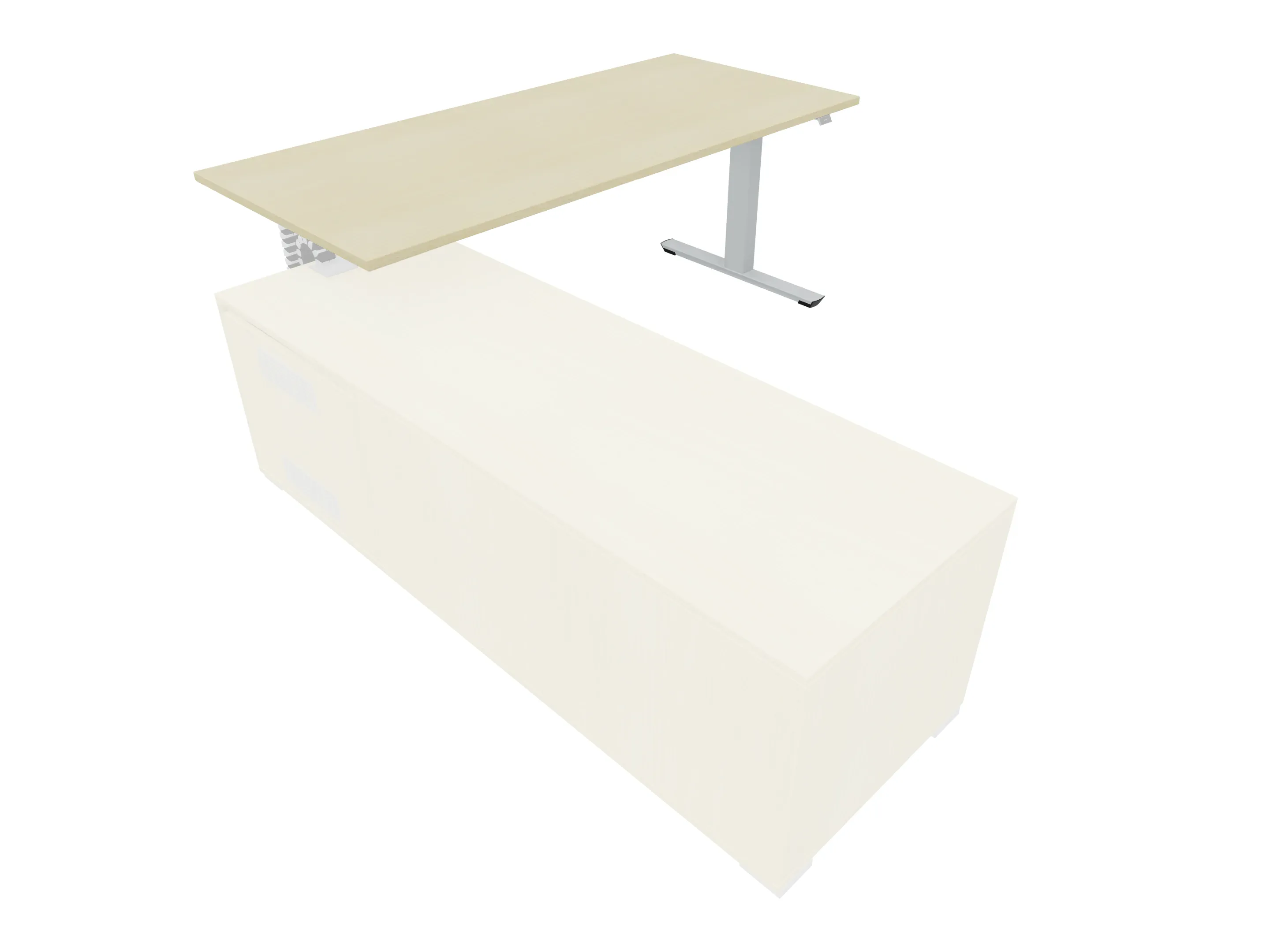Bureau met rechts inzetdeel zonder teen t.b.v. docking in de modulekast, dwarsbalk 200 mm ingesprongen, links standaard poot, inclusief montage set. Elektrisch verstelbaar d.m.v. bediening tussen: 650-1300mm