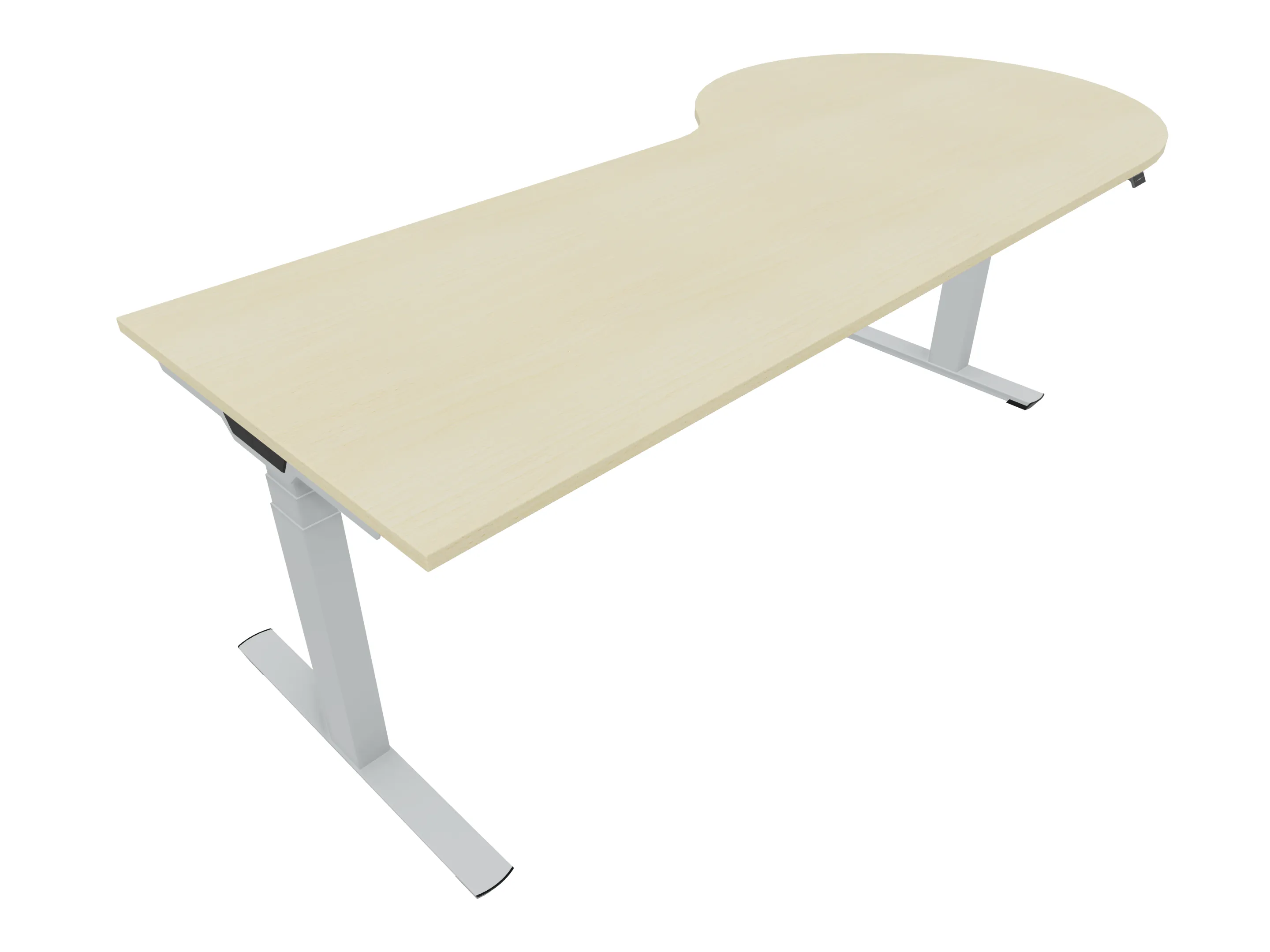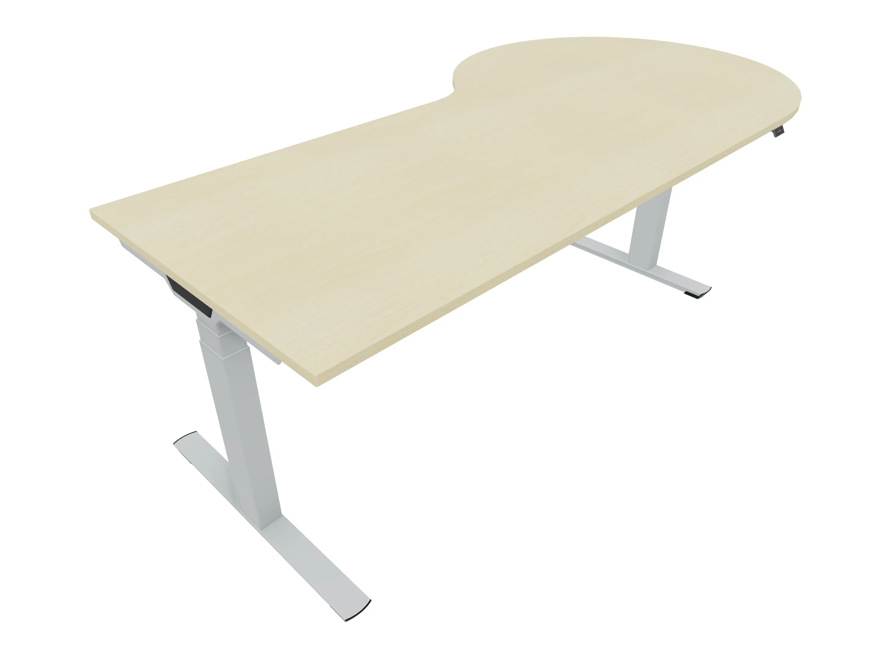 Bureau met links bureaudiepte 800mm, inzetdeel zonder teen t.b.v. docking in de modulekast, dwarsbalk 200 mm ingesprongen, rechts standaard poot met aanbouwdruppel 1100mm, inclusief montage set. Elektrisch verstelbaar d.m.v. bediening tussen: 650-1300mm