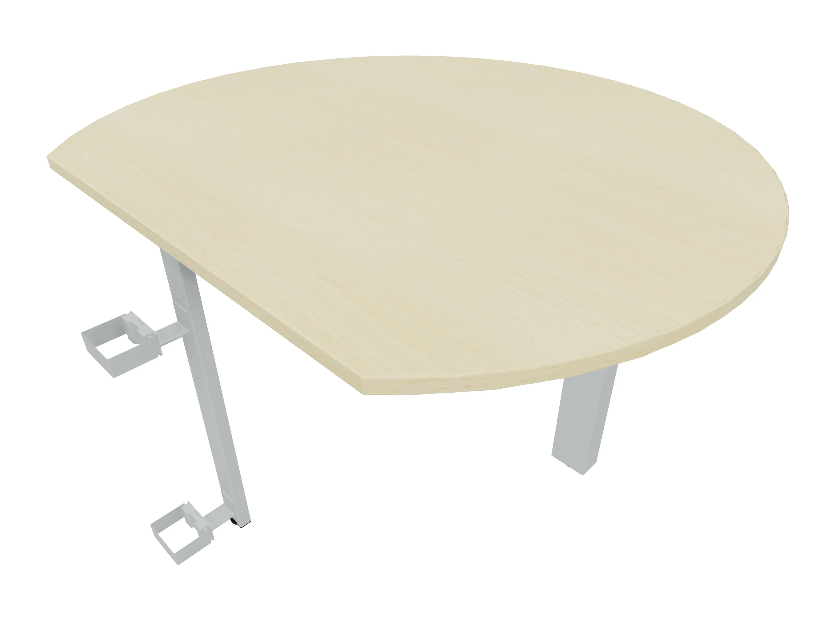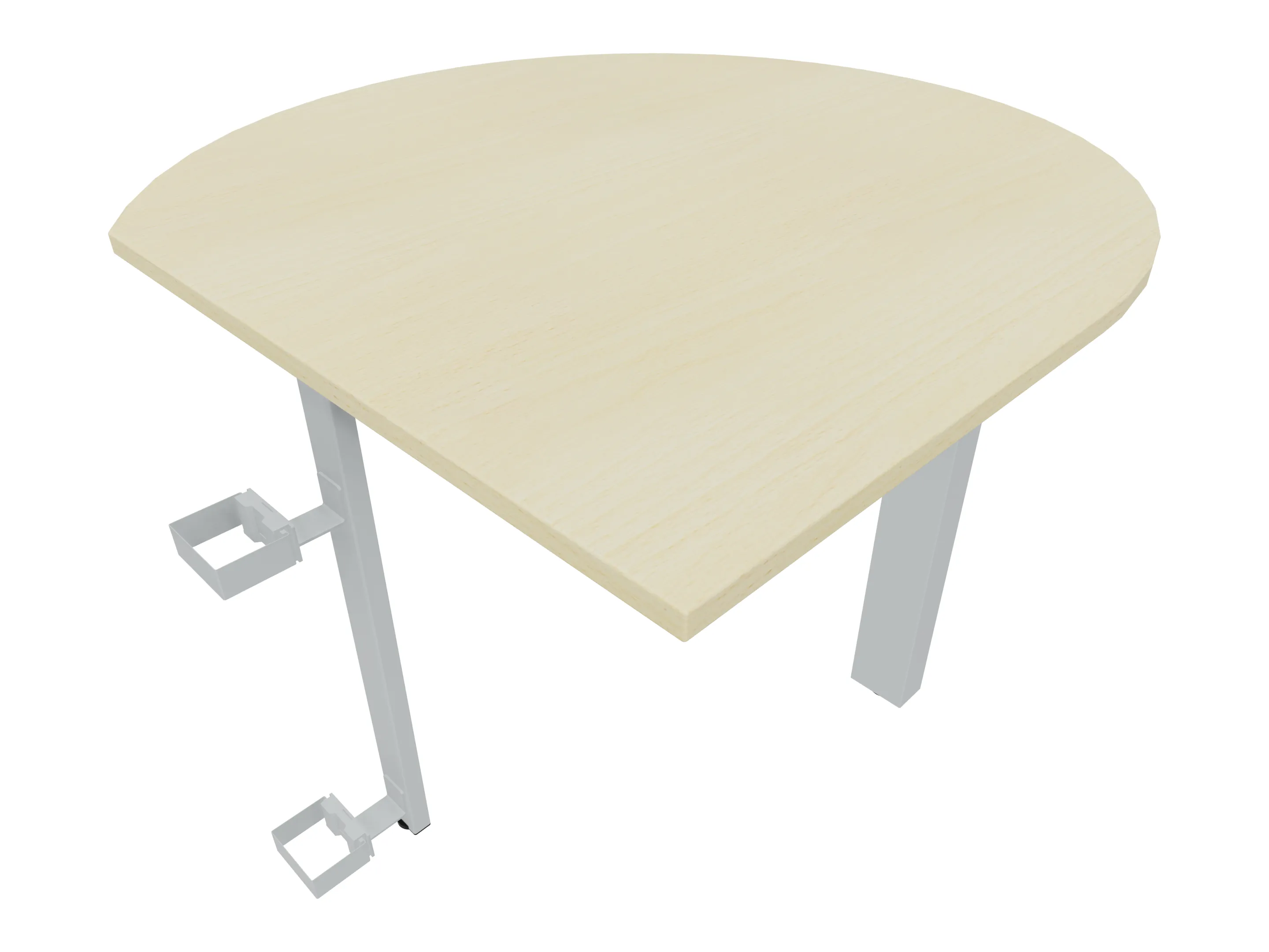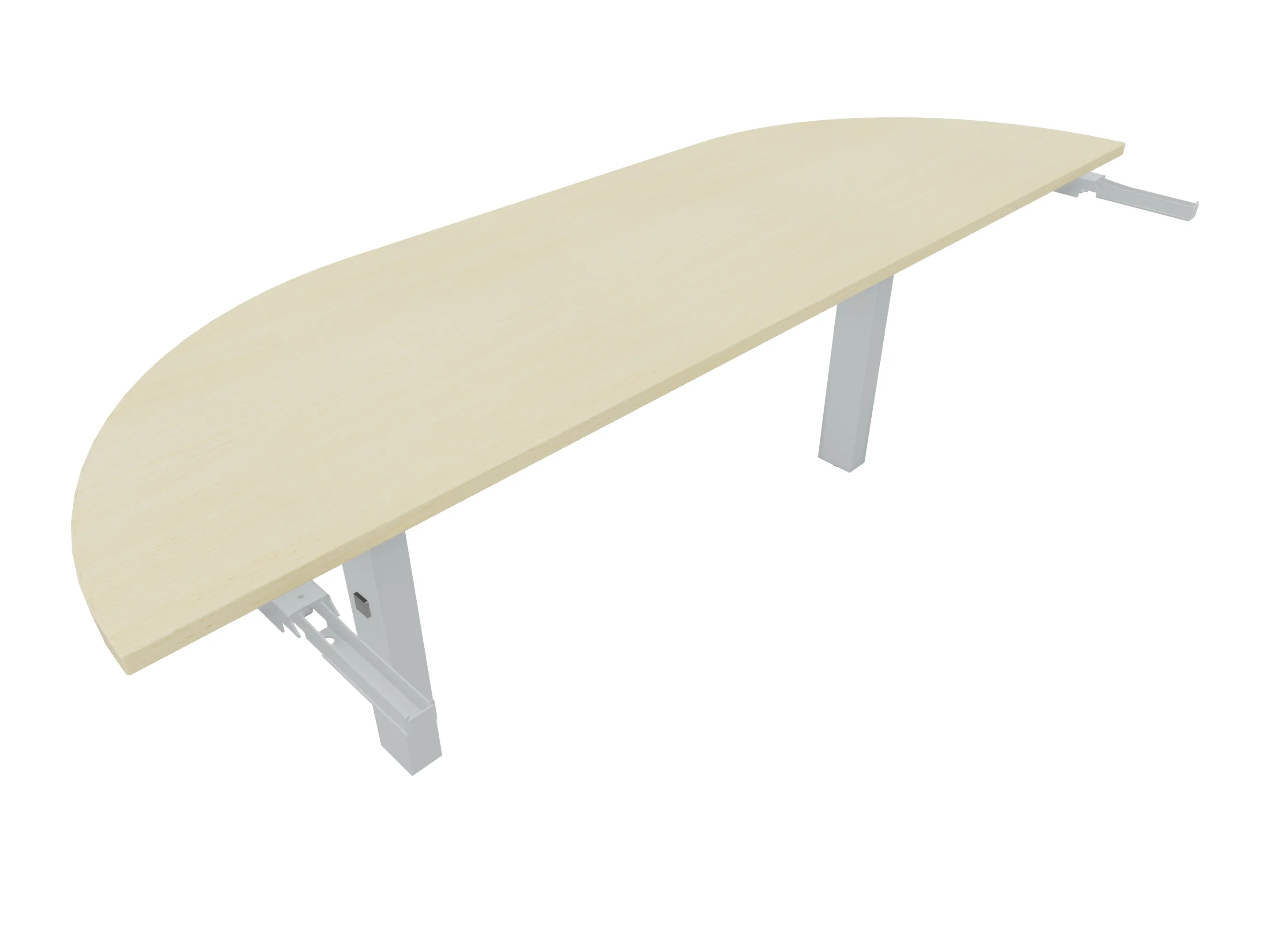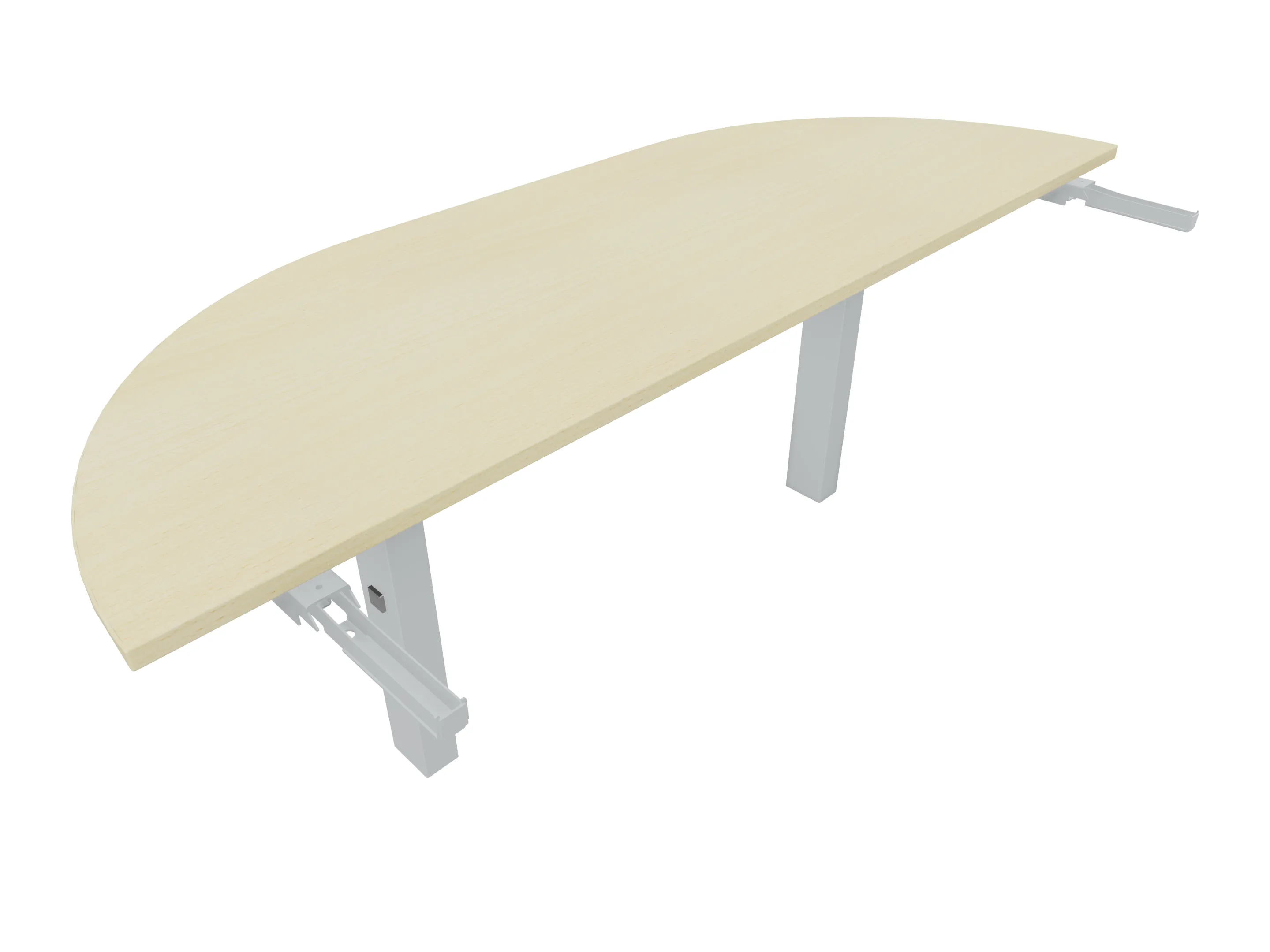 Aanbouwelement voor plaatsing aan zit-sta bureaus, van 1625mm breed en 800mm diep. Blad is voorzien van een doorlopende ronding, diameter 800mm. Inclusief twee koppel-steunpoten met hoogte verstelling (650-850mm, d.m.v. "Easy-Push").