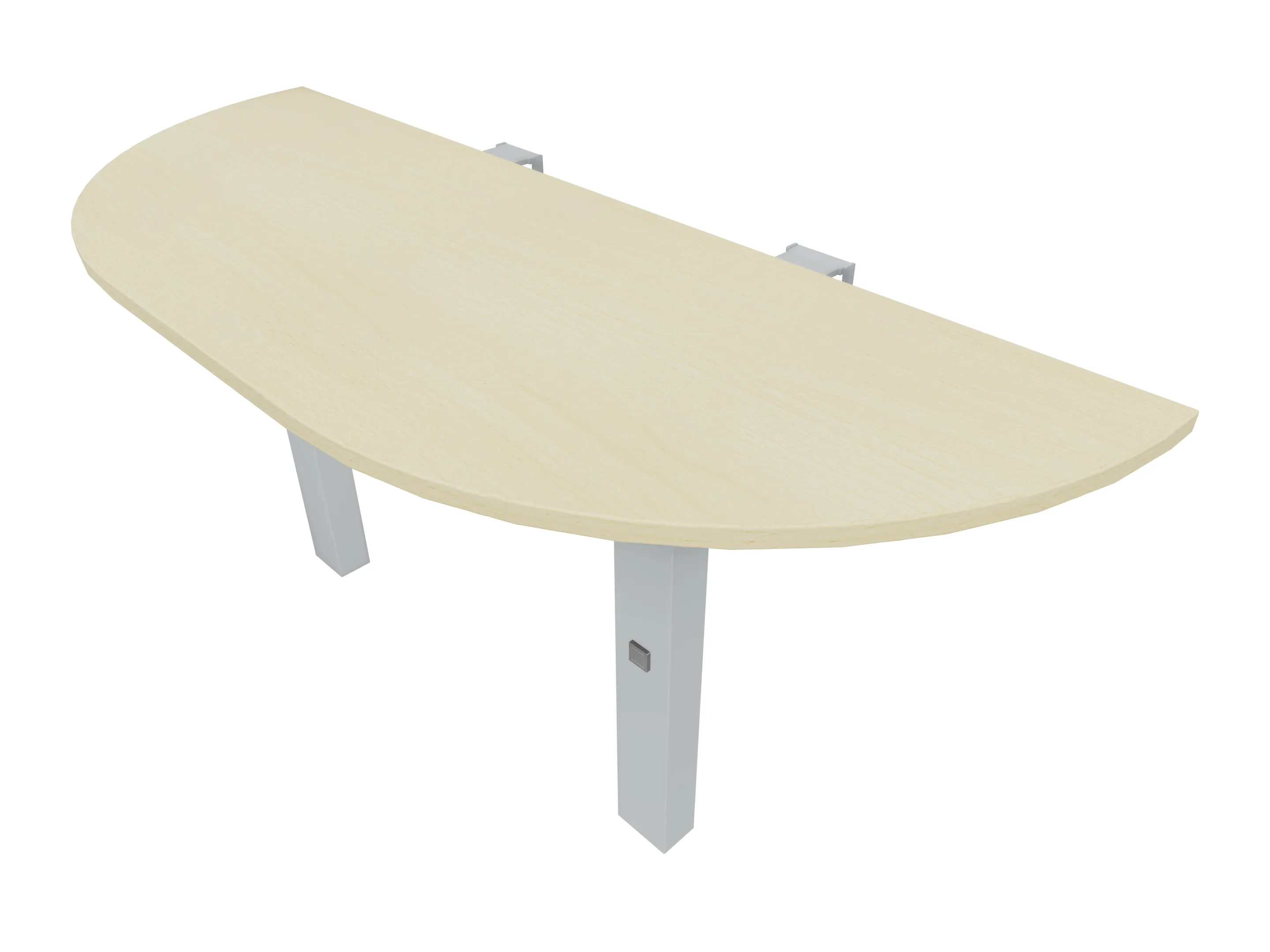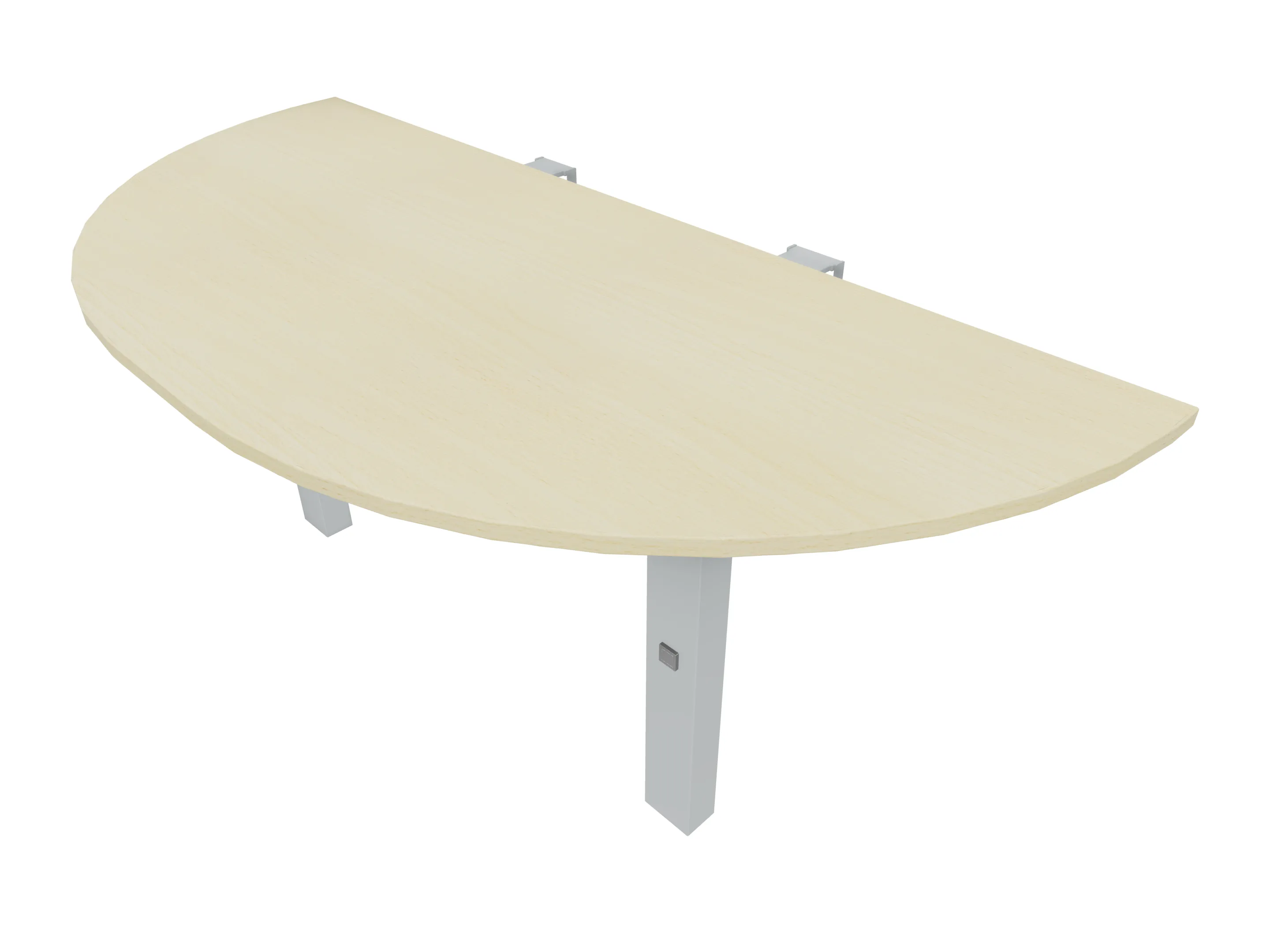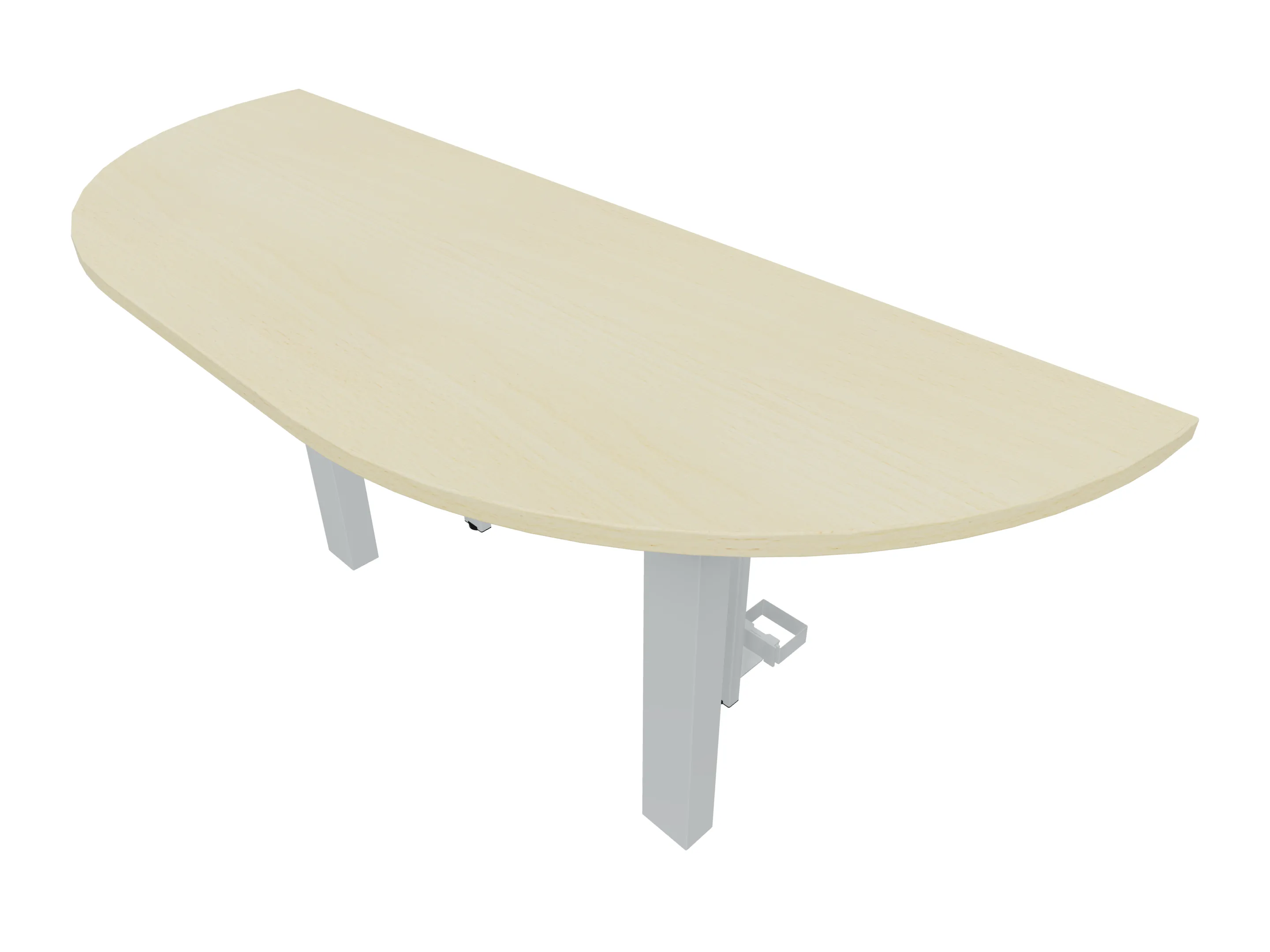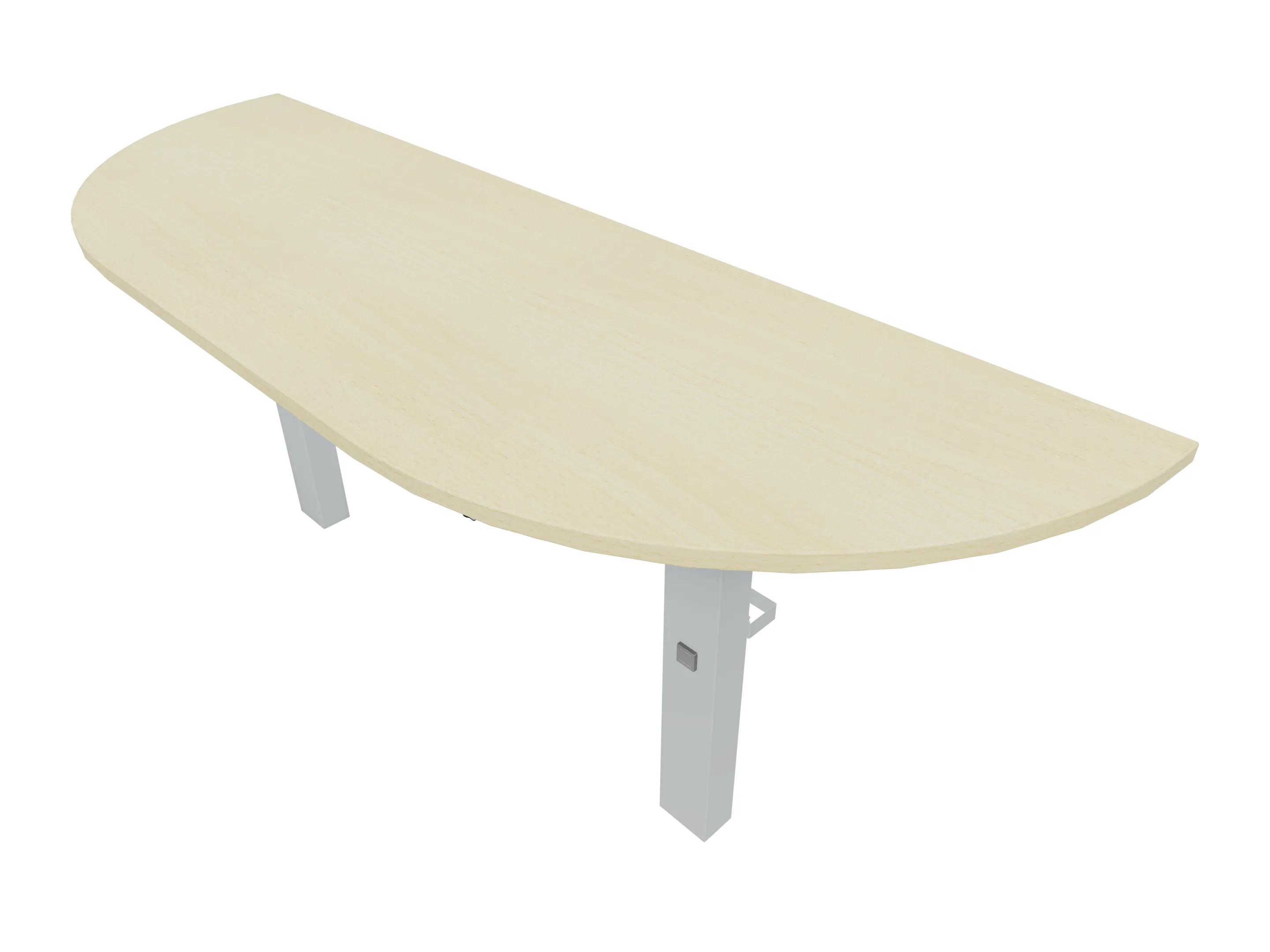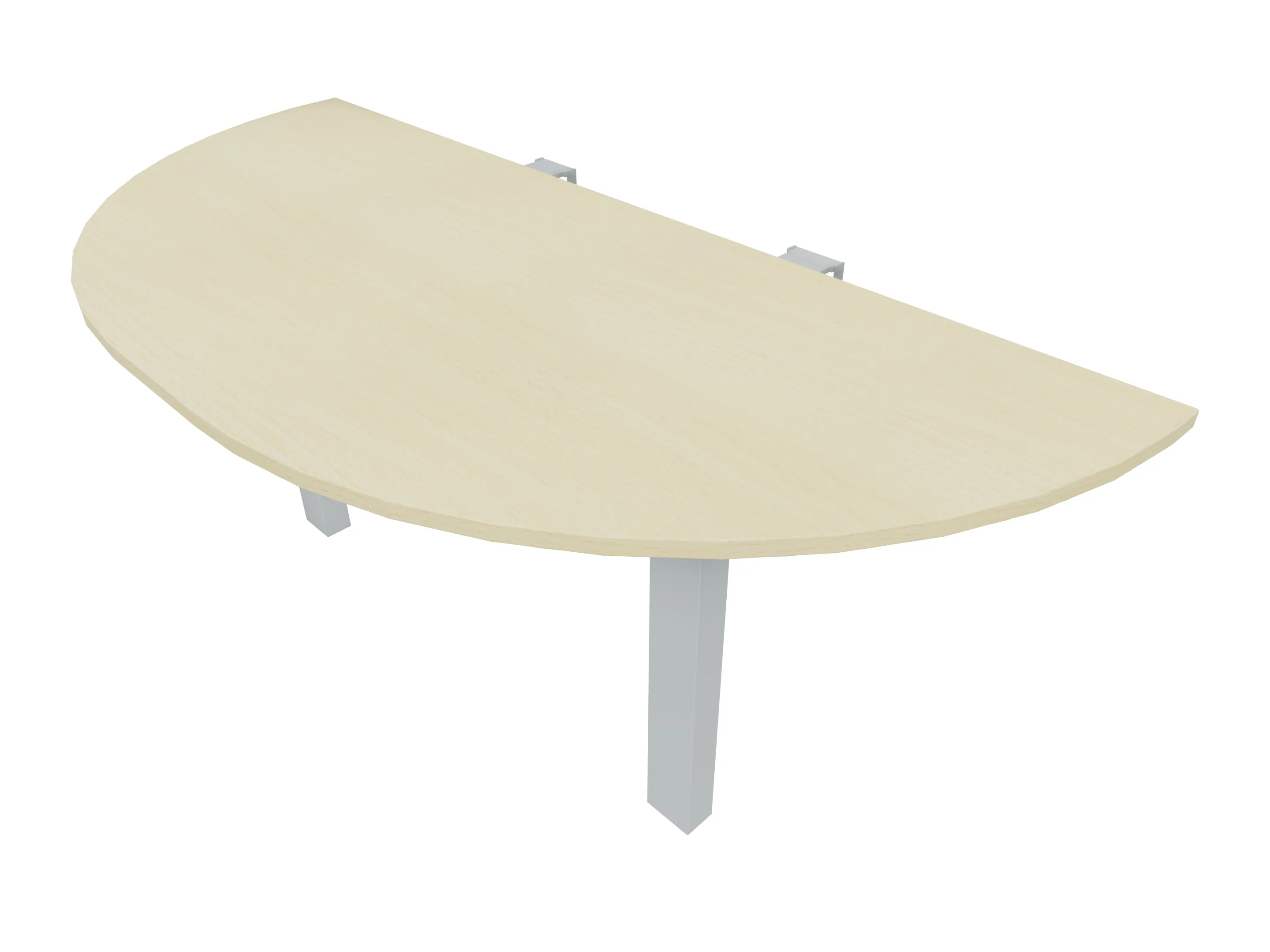 Voorzetelement voor plaatsing aan voorzijde van het bureau, van 1600mm breed en 800mm diep. Blad is voorzien van een doorlopende ronding, diameter 800mm. Inclusief twee steunpoten met hoogte verstelling.