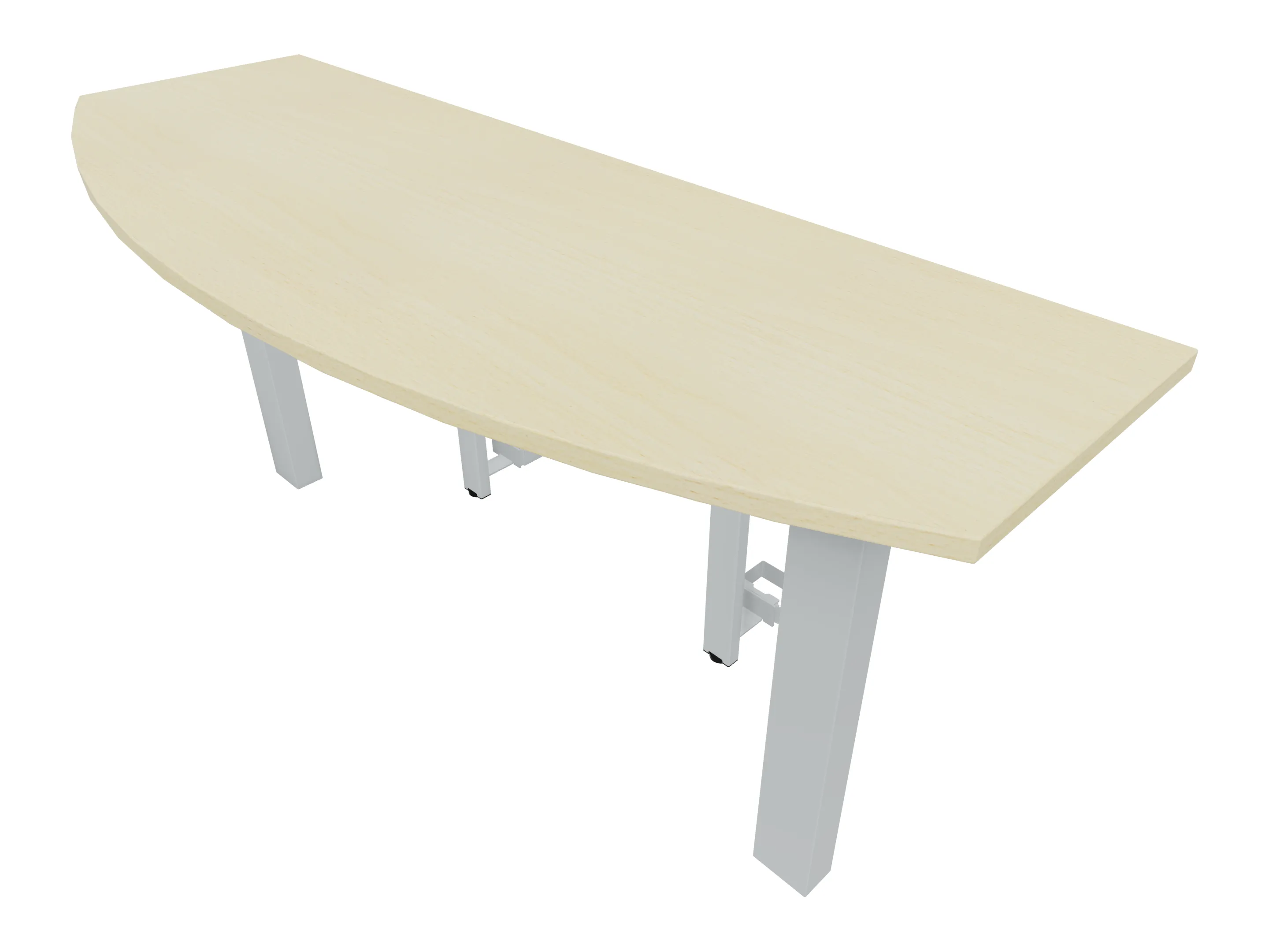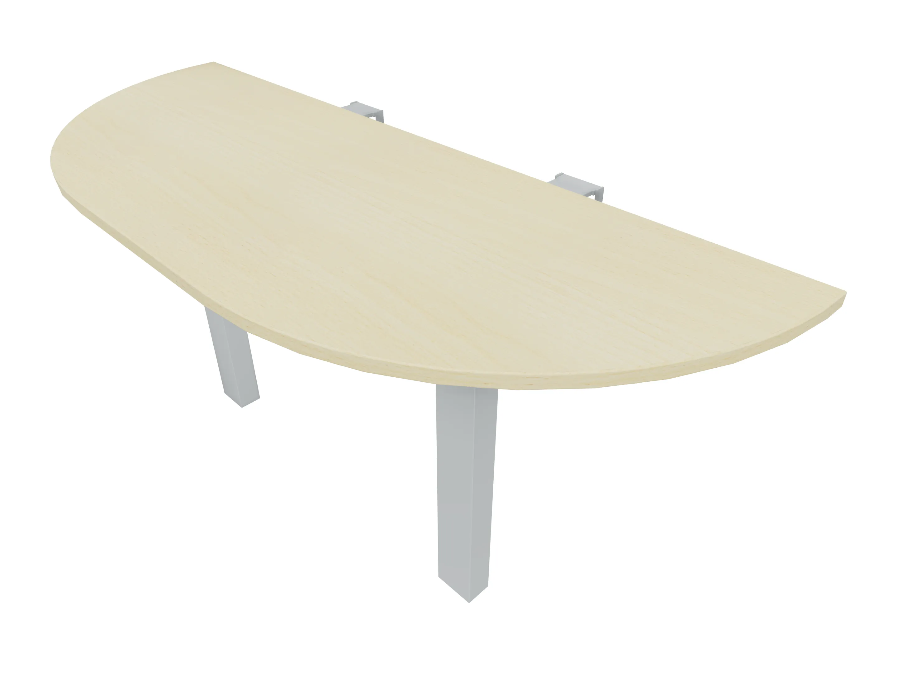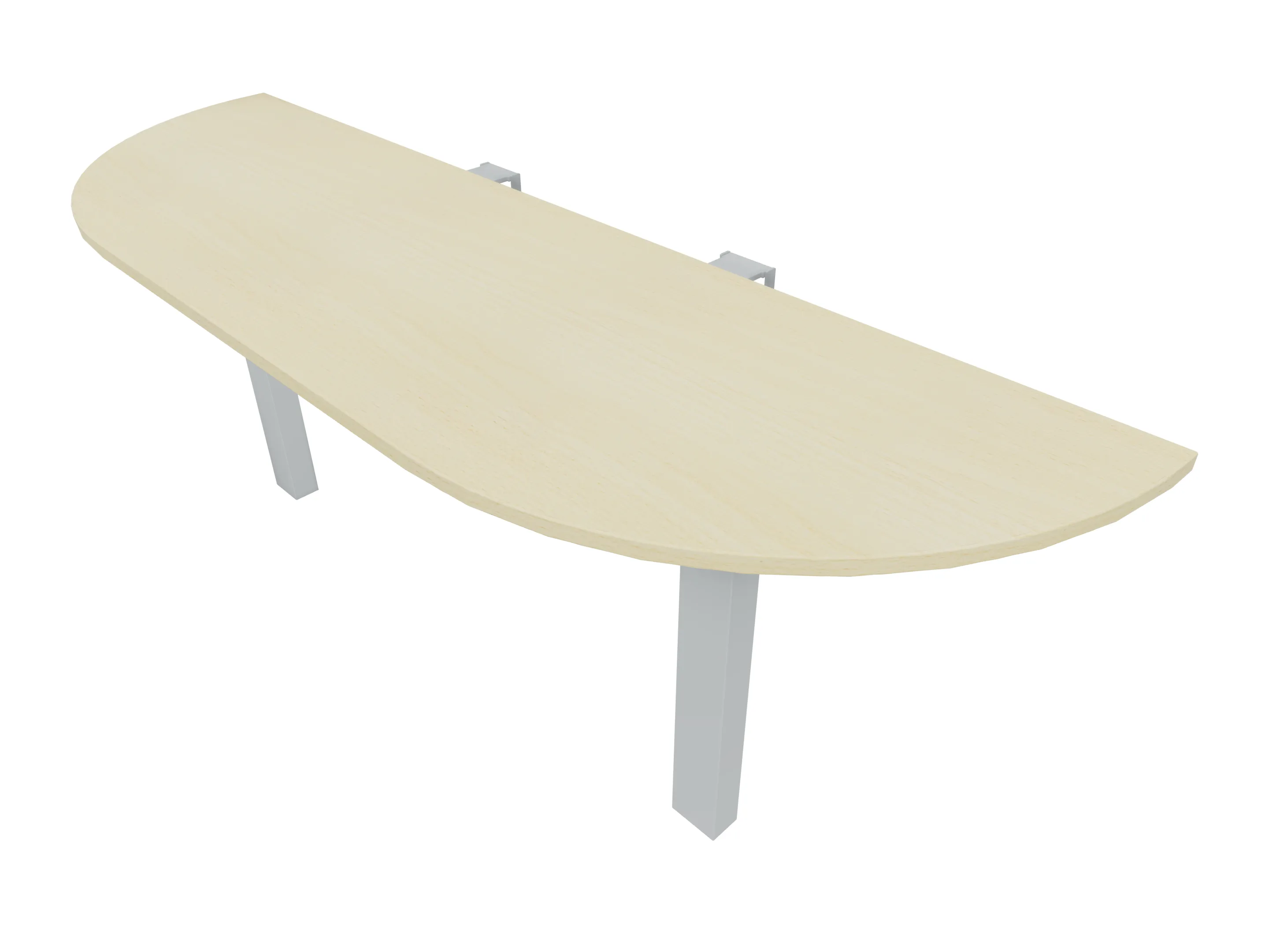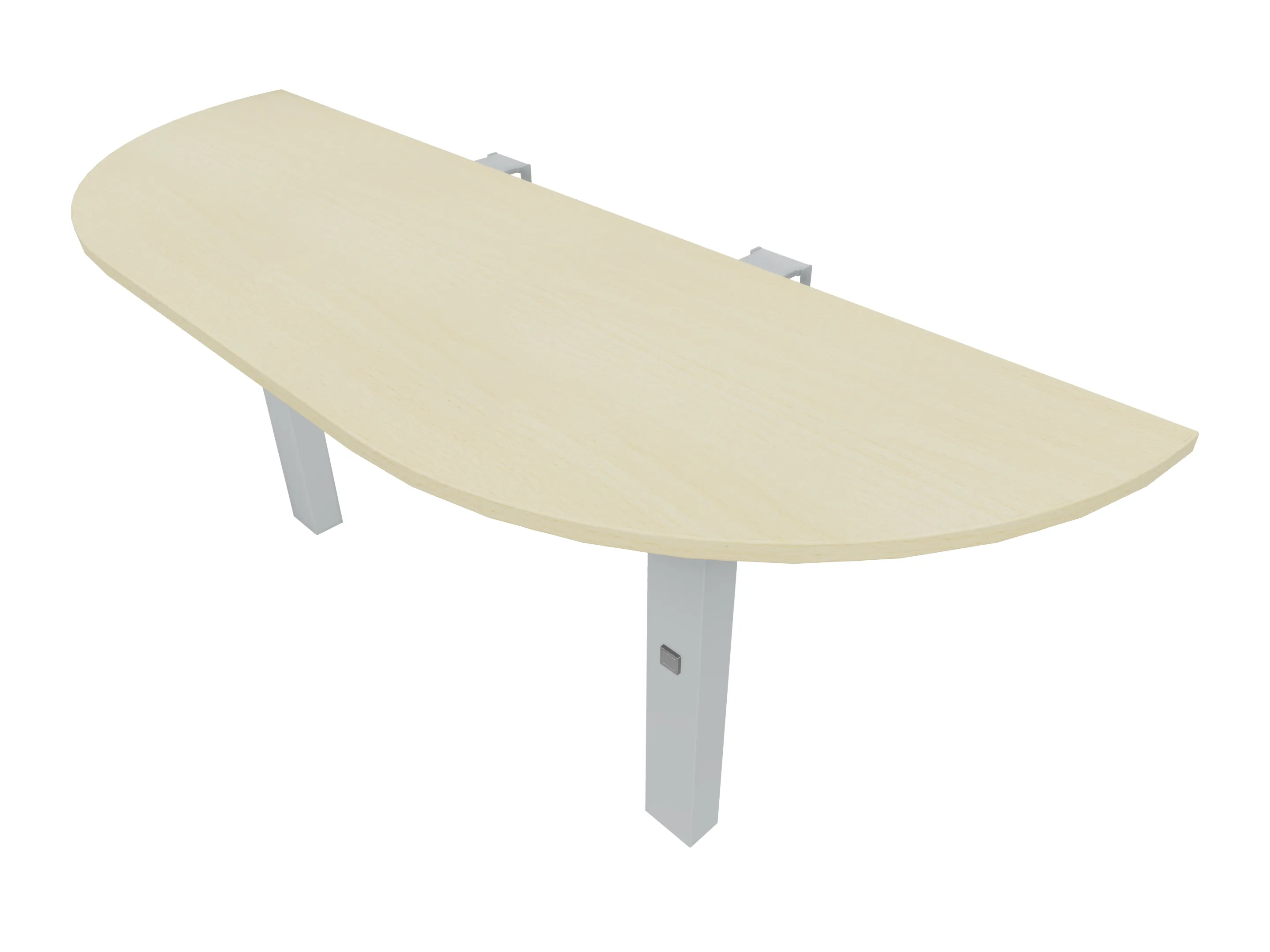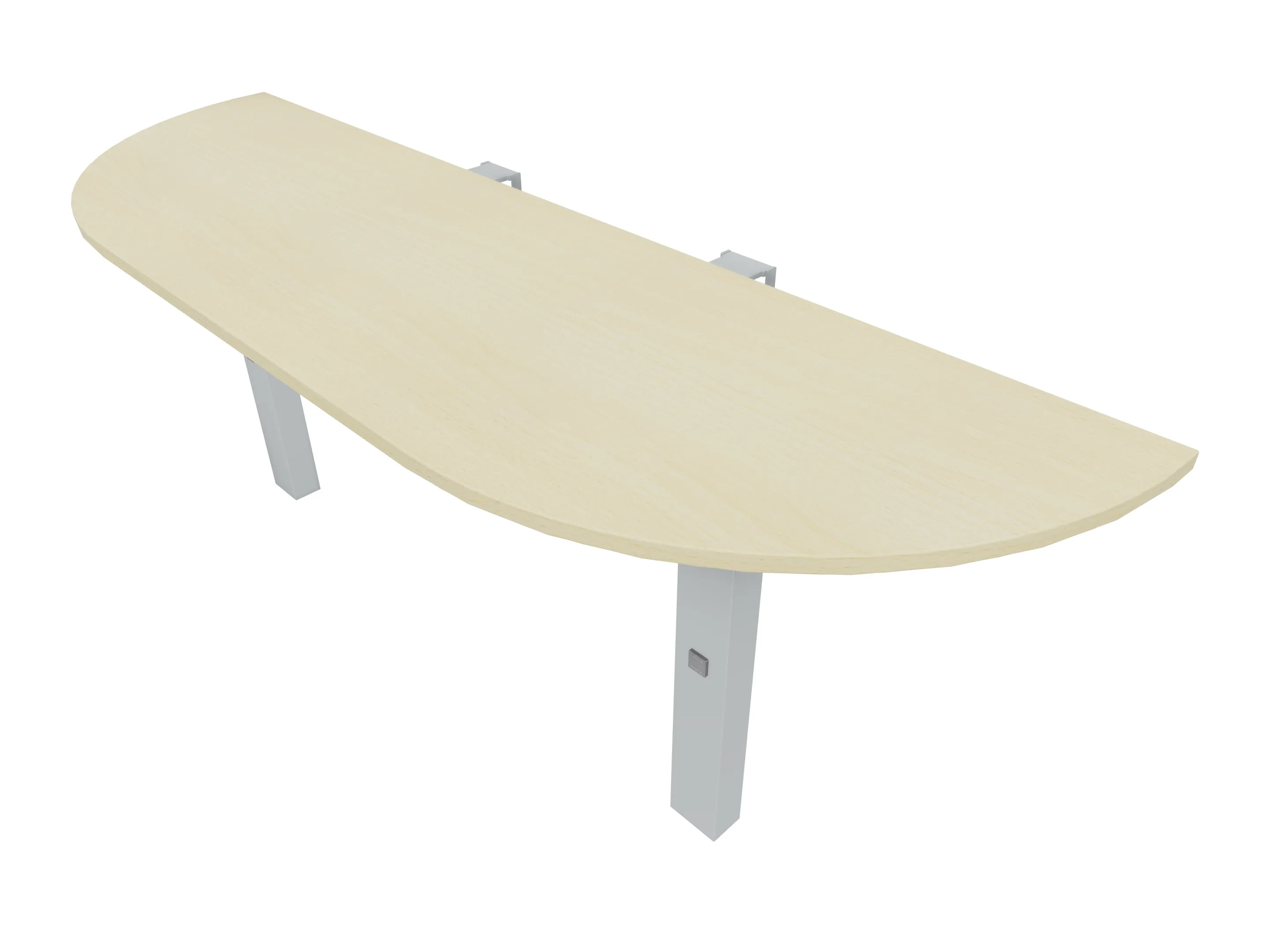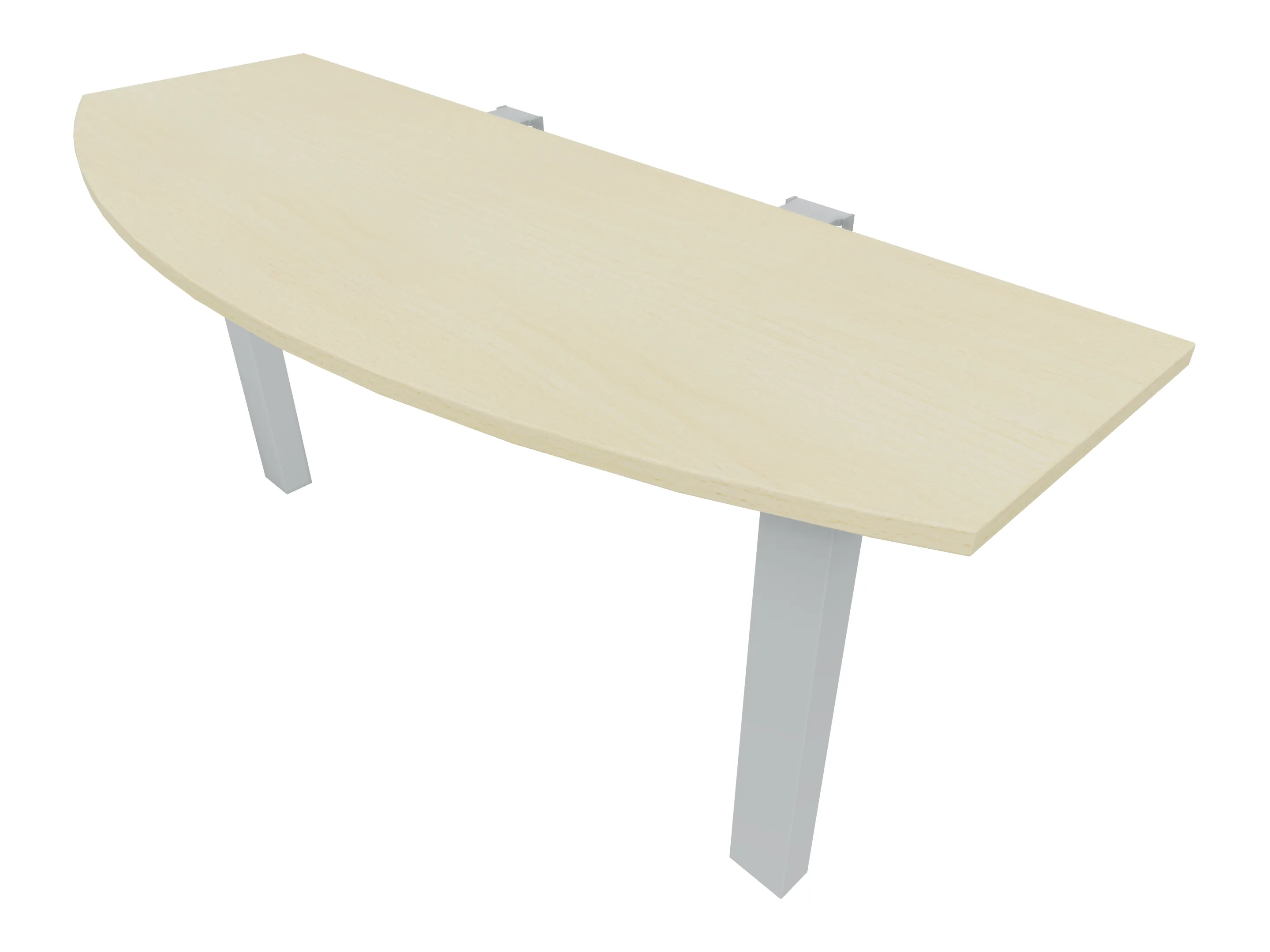 Voorzetelement voor plaatsing aan voorzijde van het bureau, van 1600mm breed en 800mm diep. Blad is voorzien van een doorlopende ronding, diameter 800mm. Inclusief twee steunpoten met hoogte verstelling.