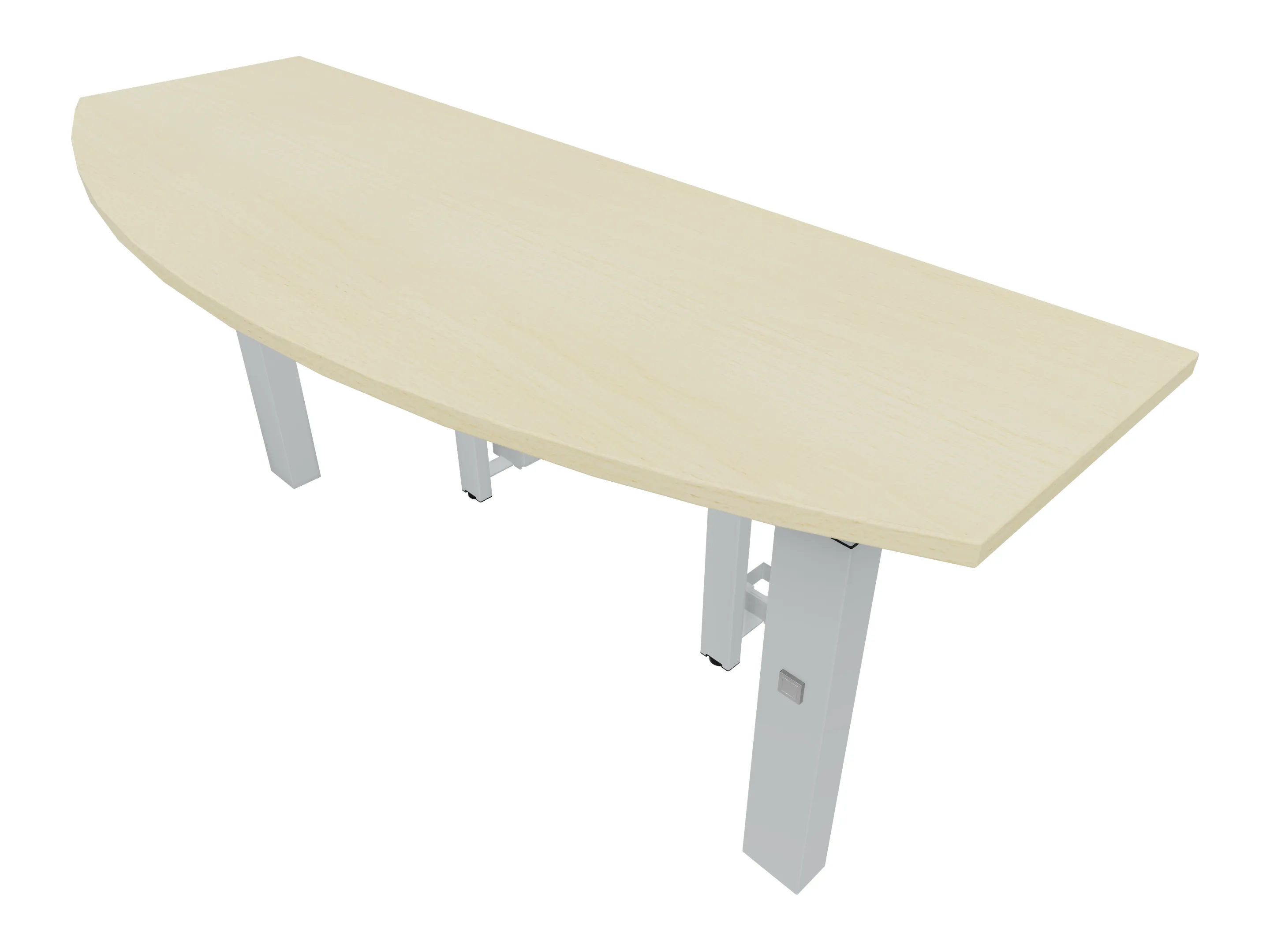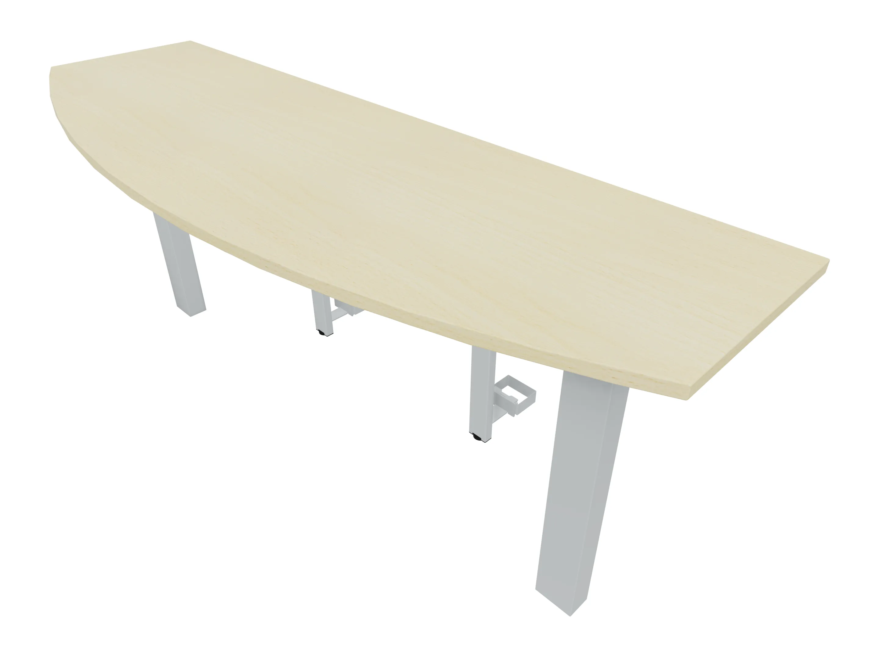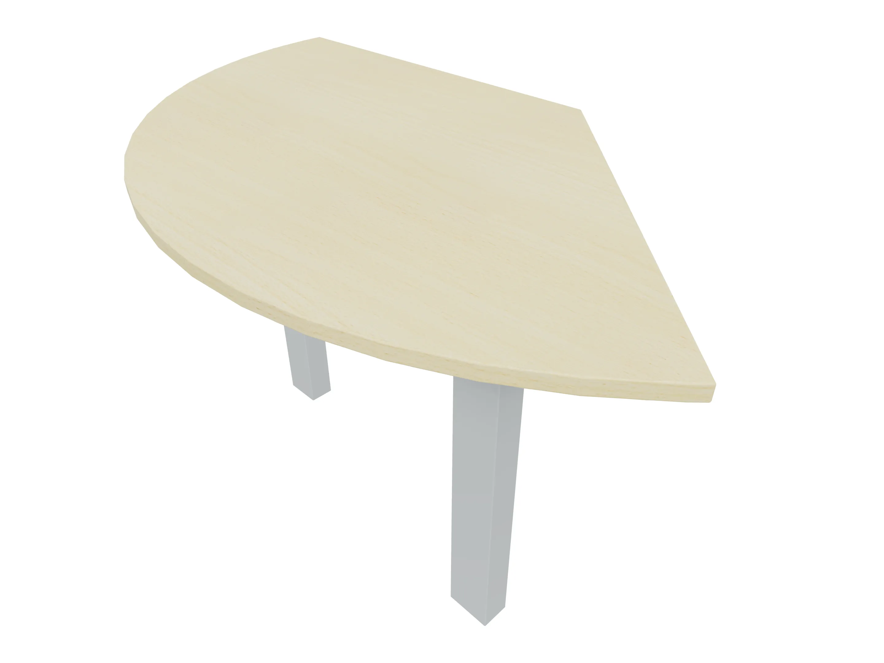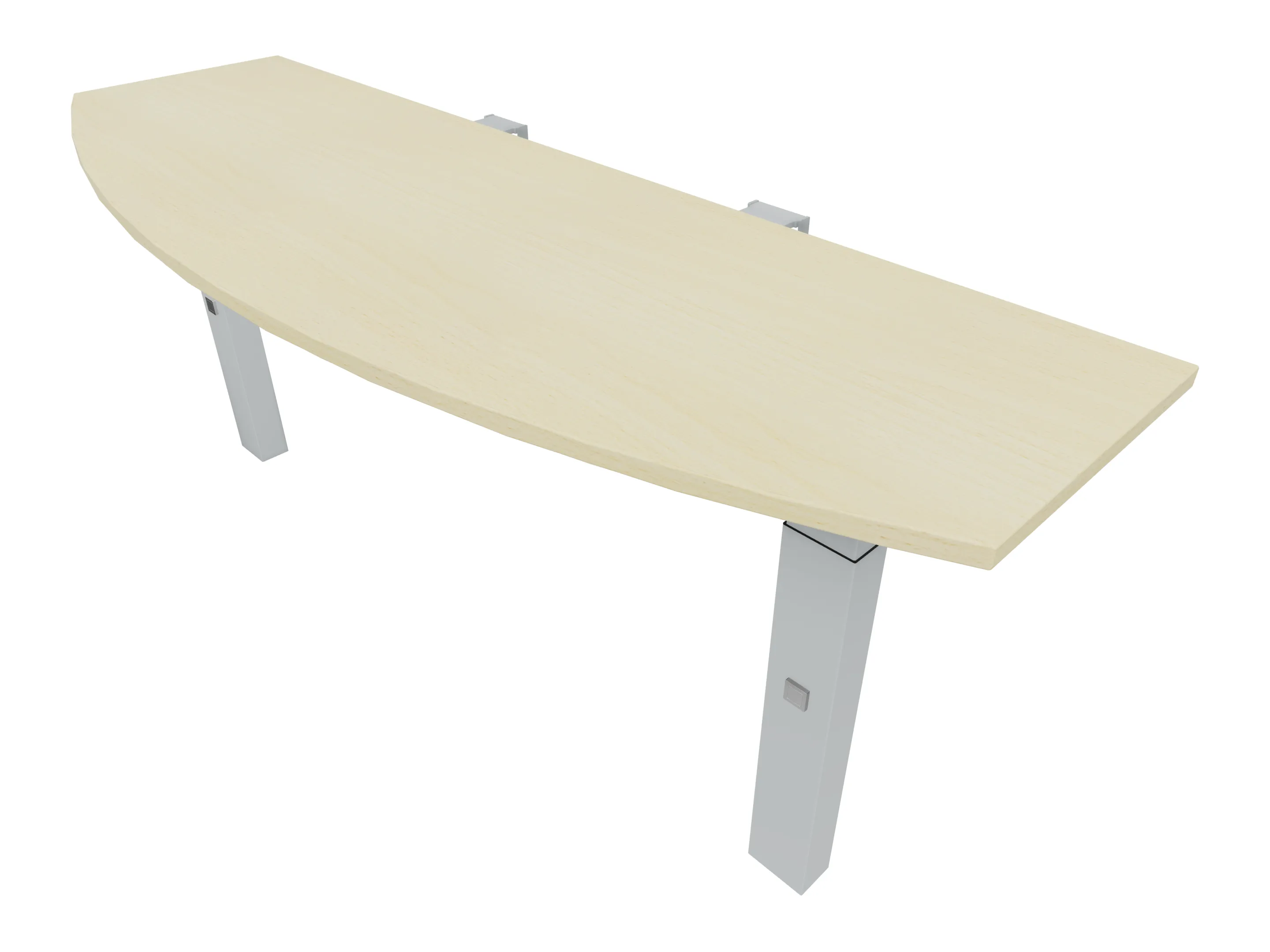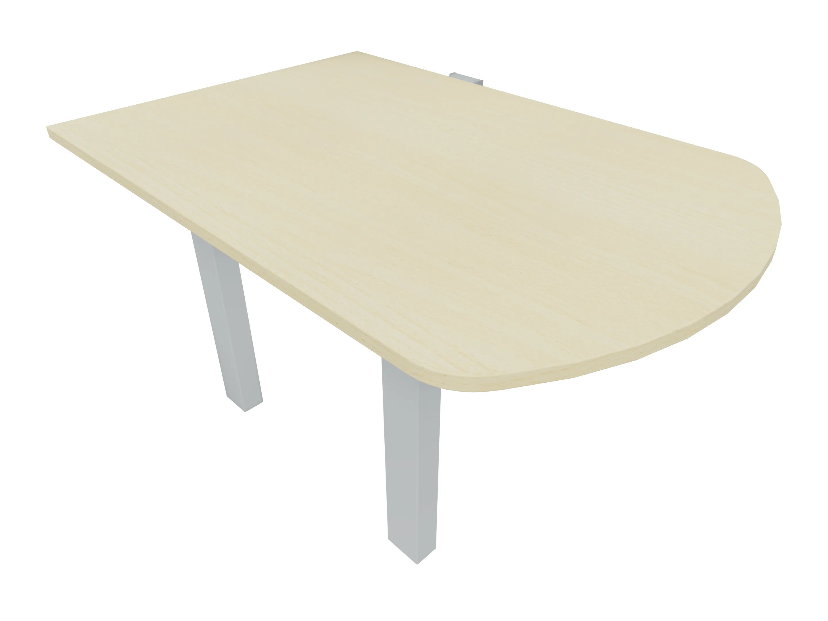 Voorzetelement voor plaatsing aan voorzijde van het bureau, van 1600mm breed en 800mm diep. Blad is voorzien van een doorlopende ronding, diameter 800mm. Inclusief twee steunpoten met hoogte verstelling.