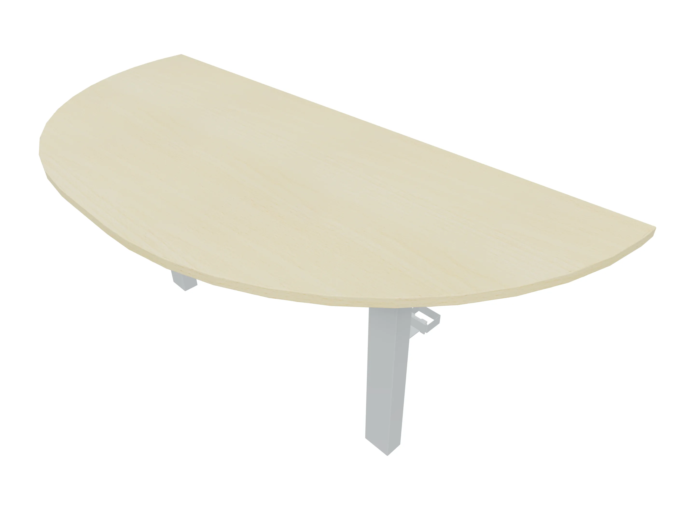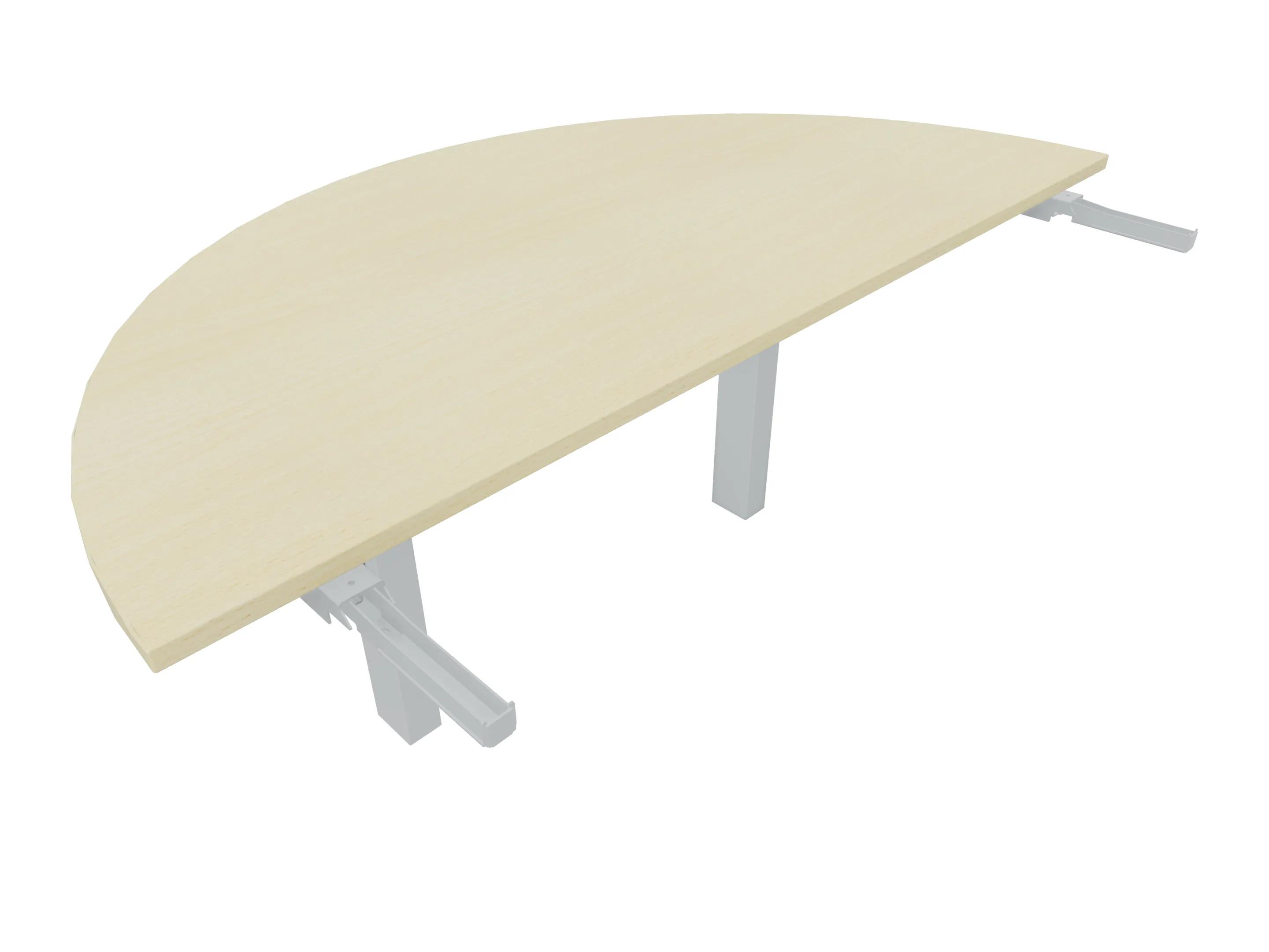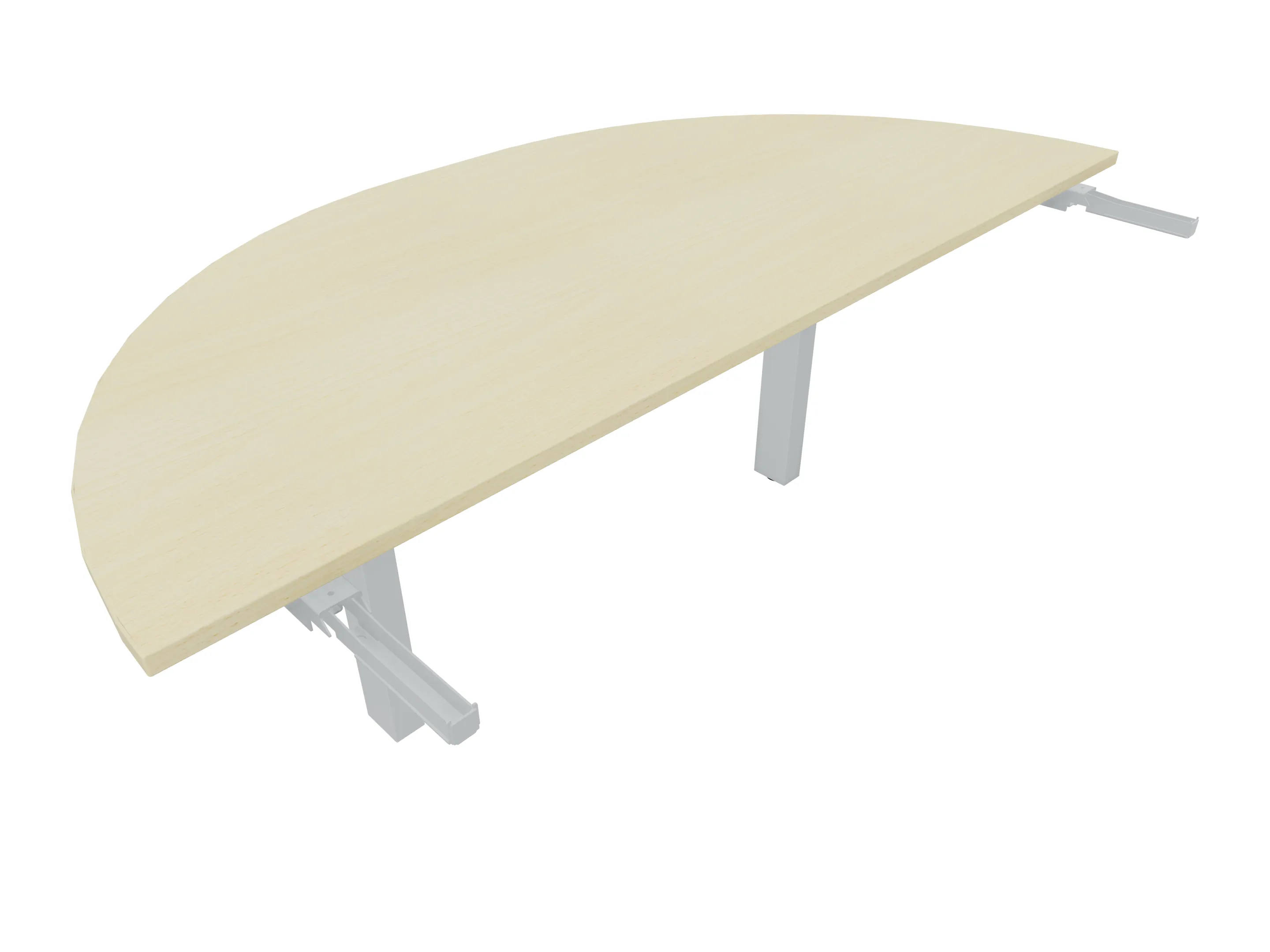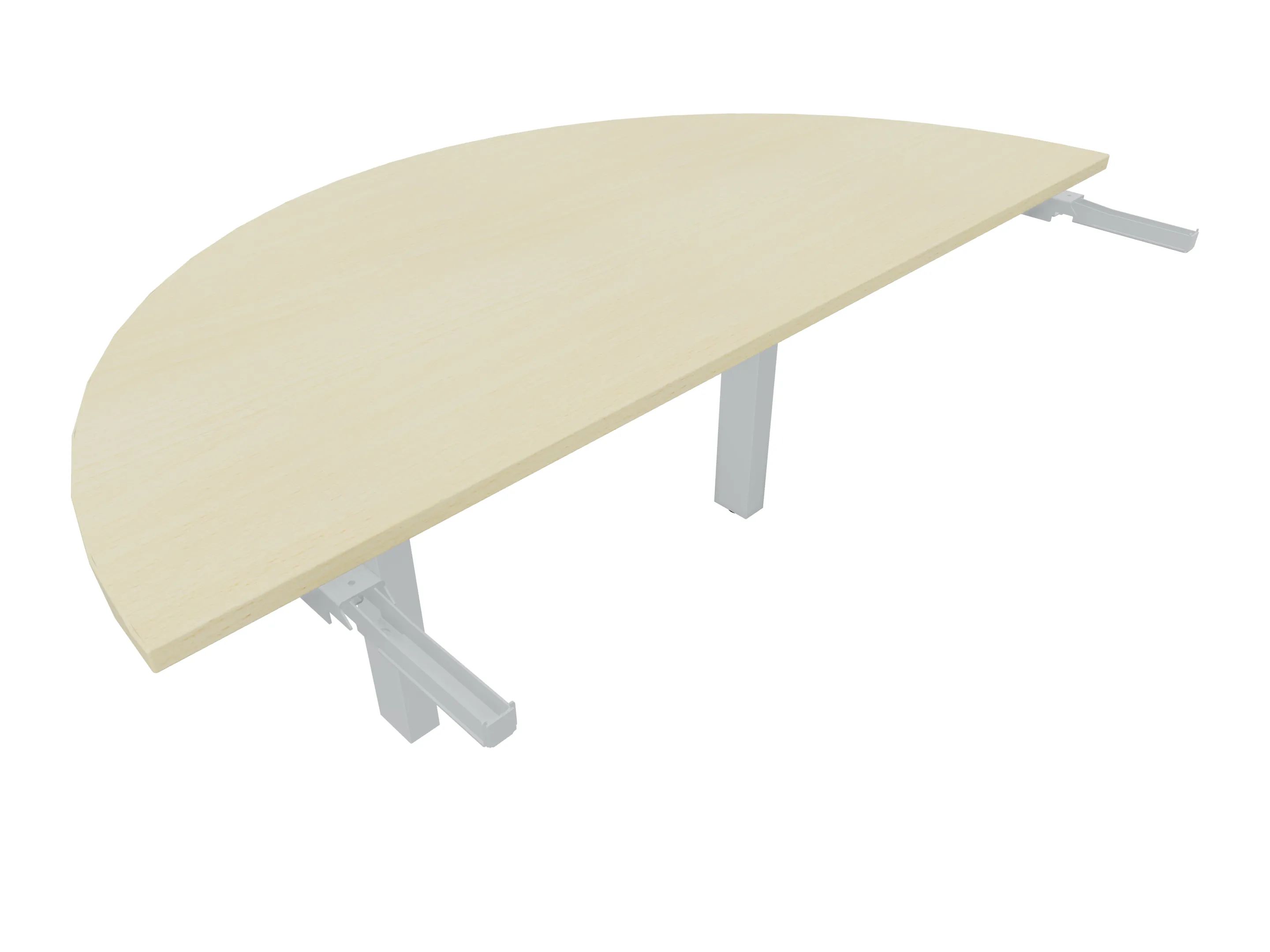 Aanbouwelement voor plaatsing aan zit-sta bureaus, van 1625mm breed en 800mm diep. Blad is voorzien van een doorlopende ronding, diameter 800mm. Inclusief twee koppel-steunpoten zonder hoogte verstelling.