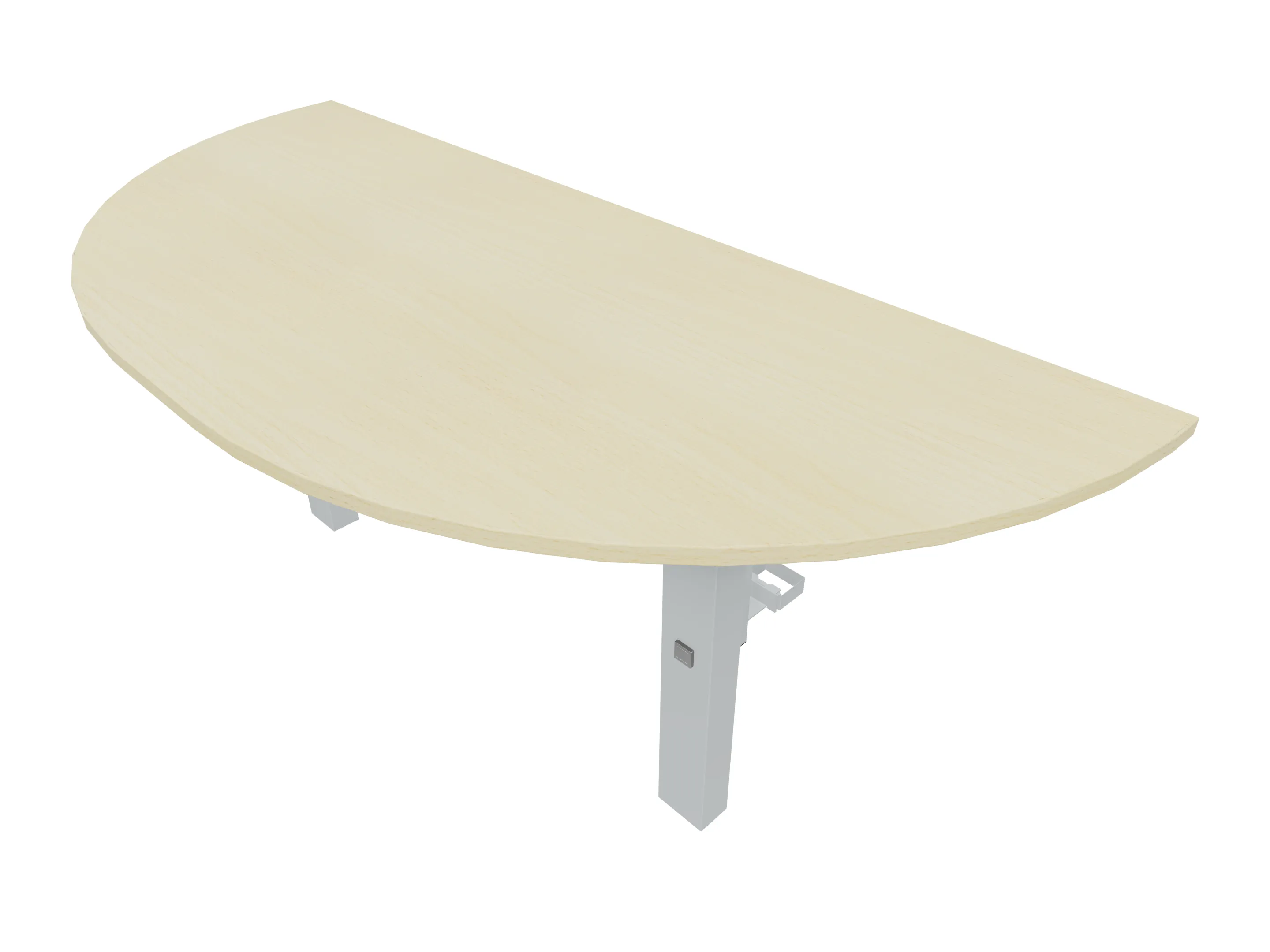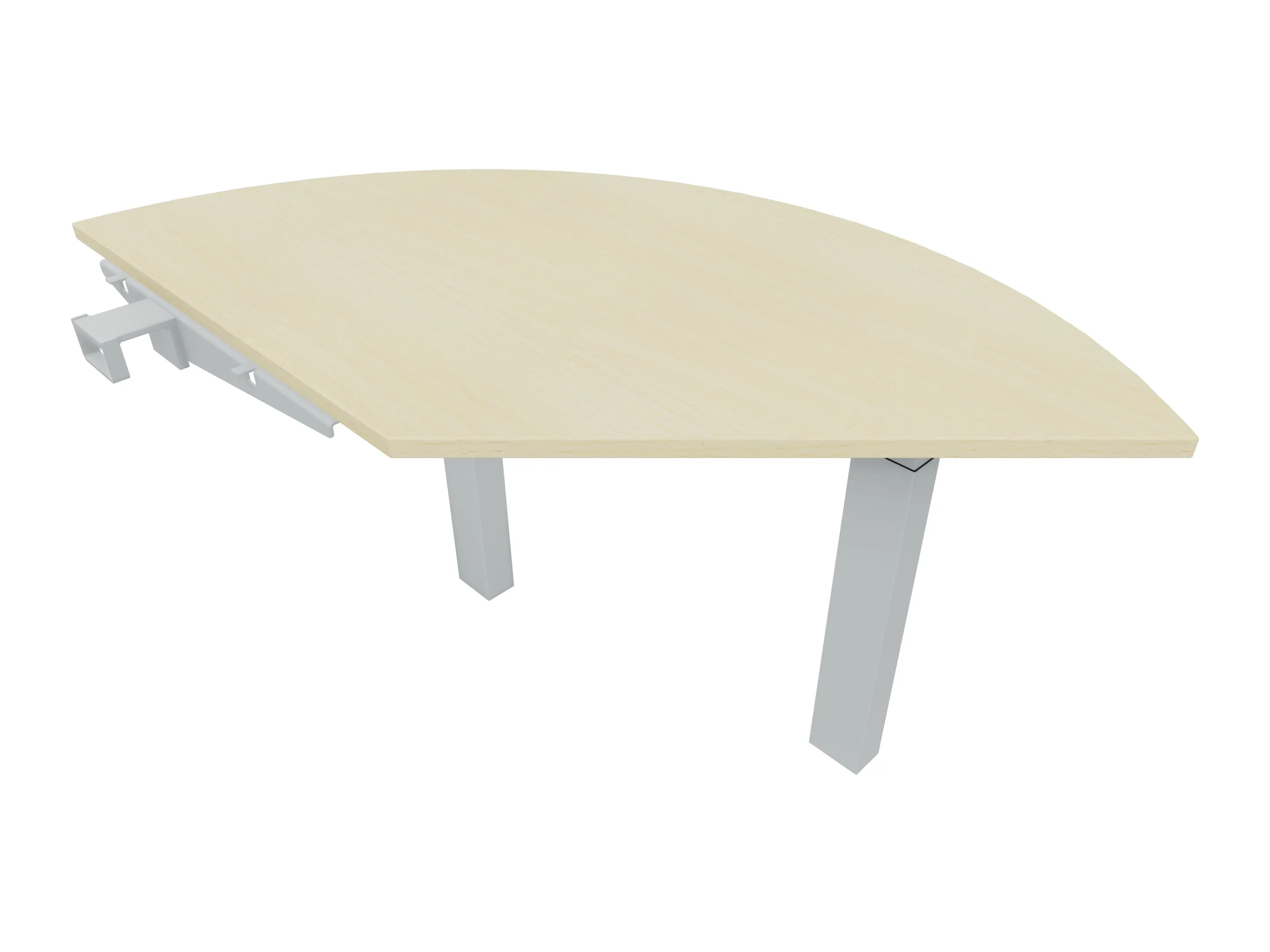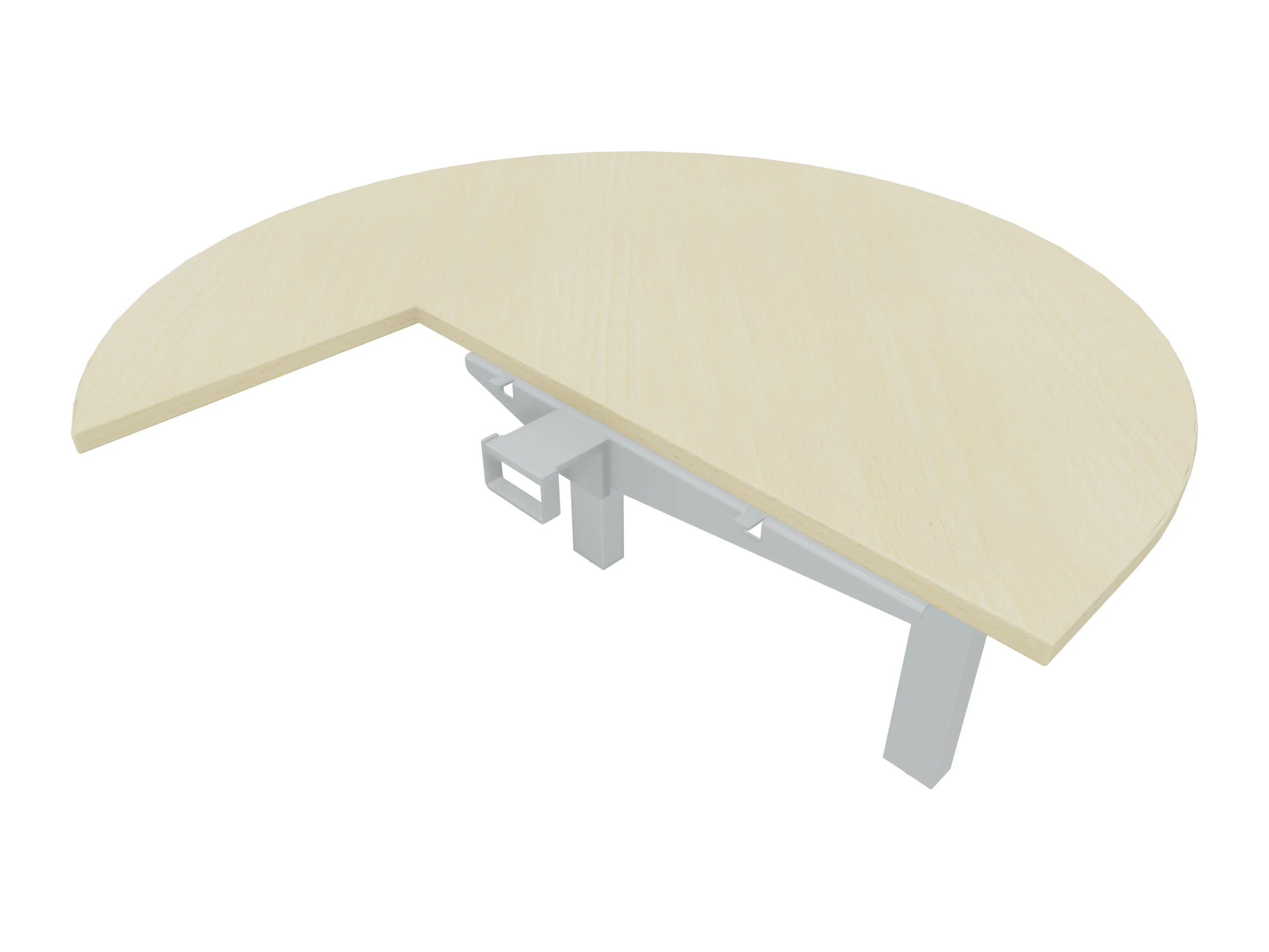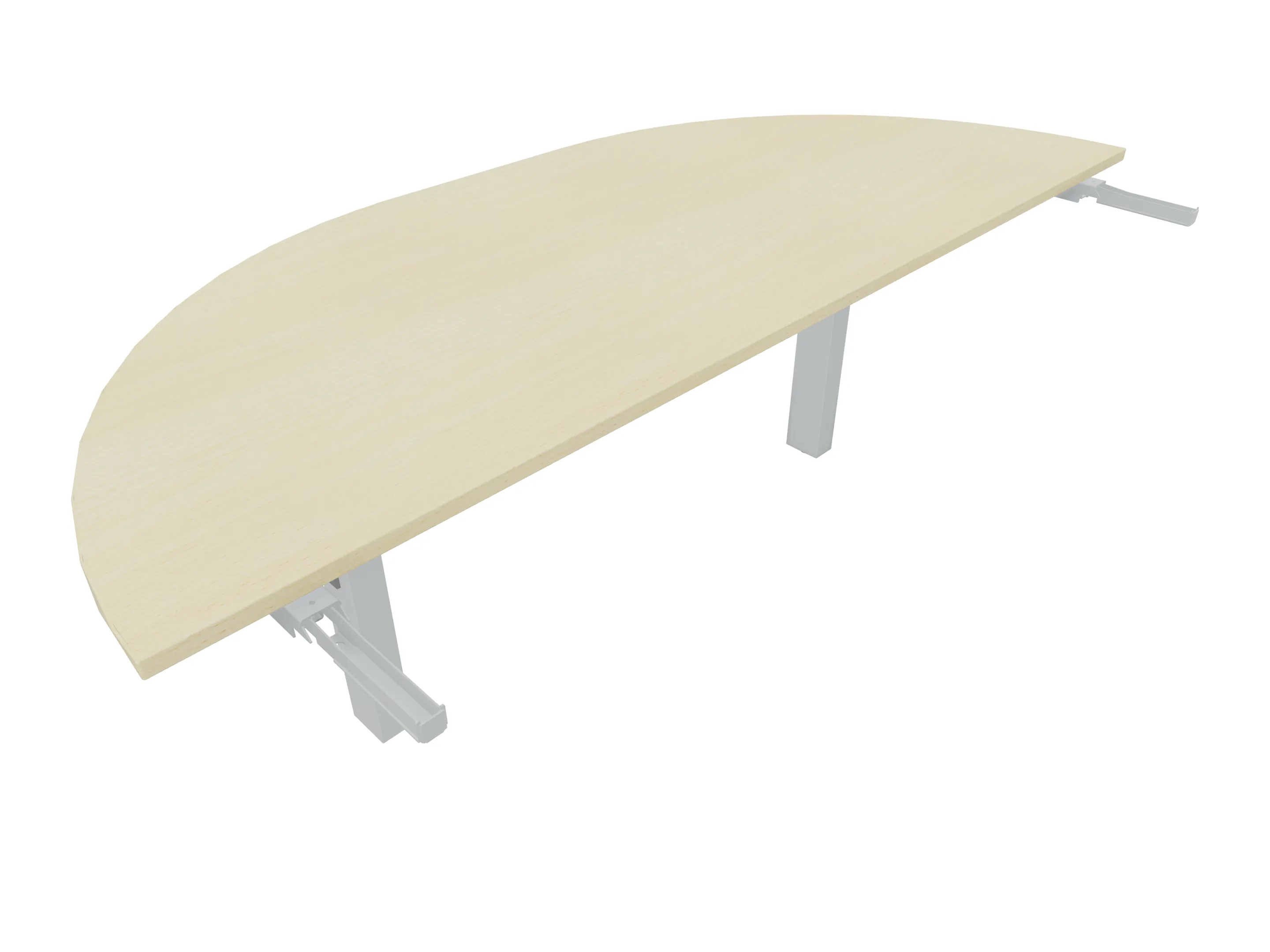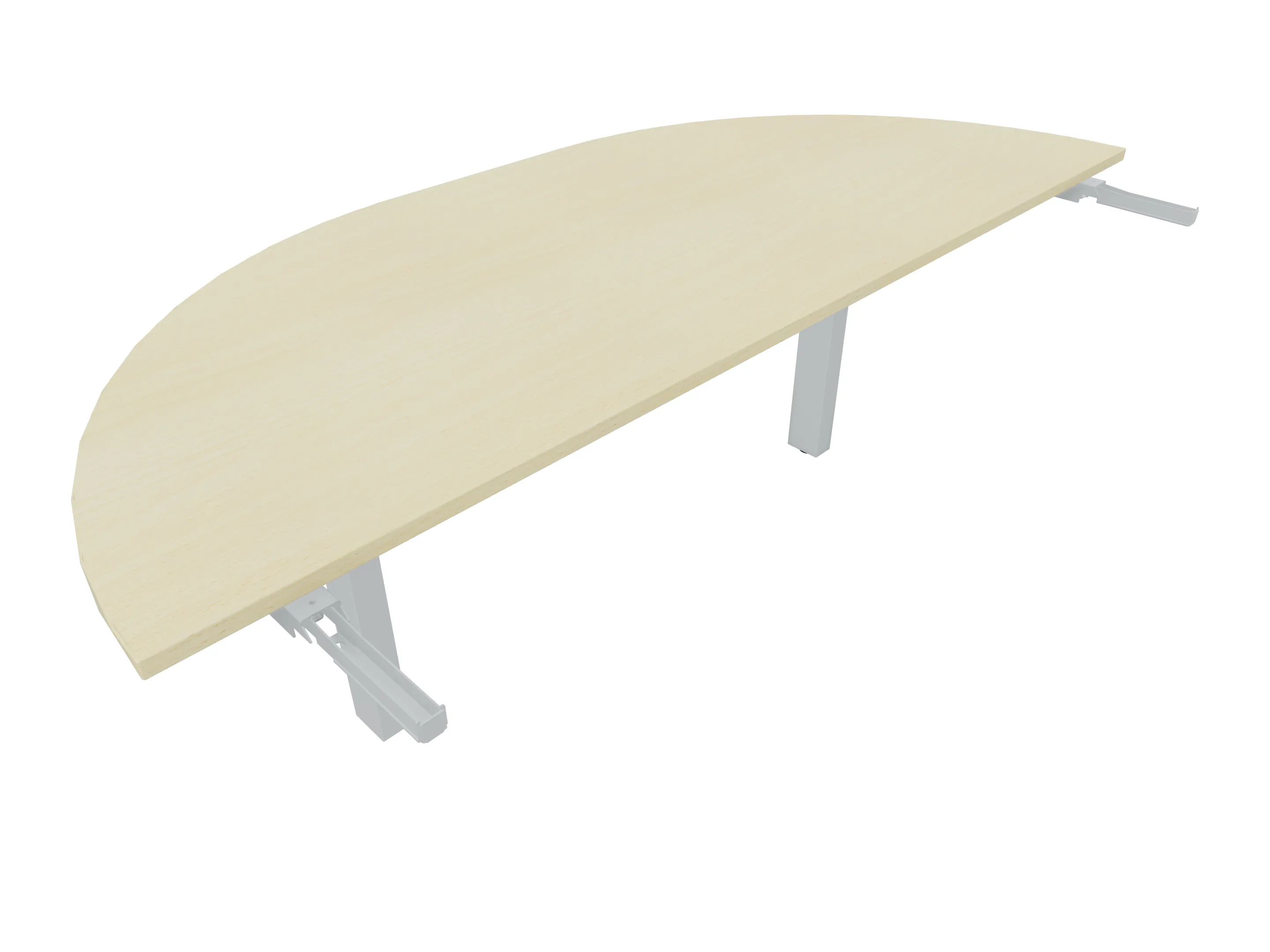 Aanbouwelement voor plaatsing aan zit-sta bureaus, van 1625mm breed en 800mm diep. Blad is voorzien van een doorlopende ronding, diameter 800mm. Inclusief twee koppel-steunpoten zonder hoogte verstelling.