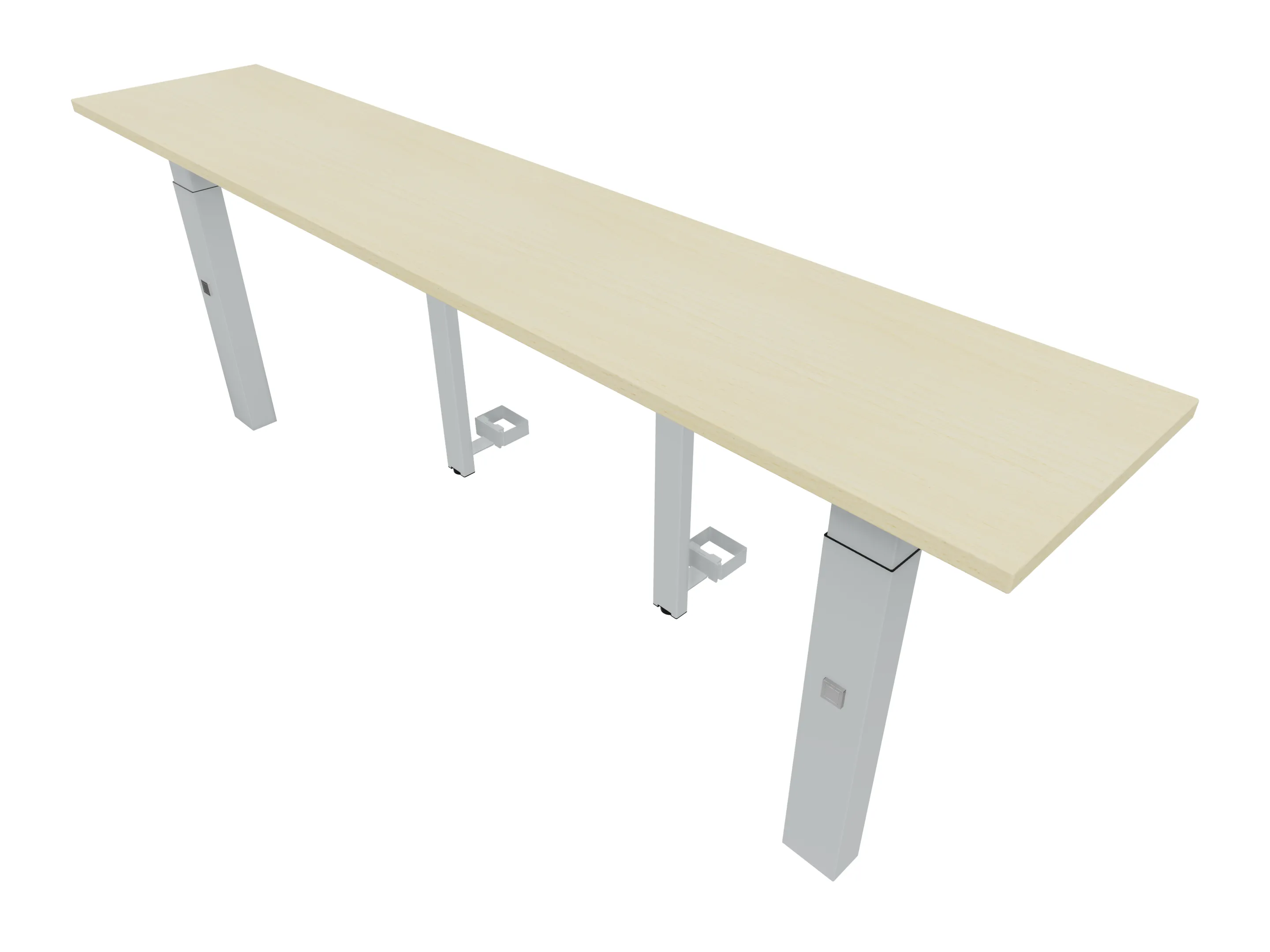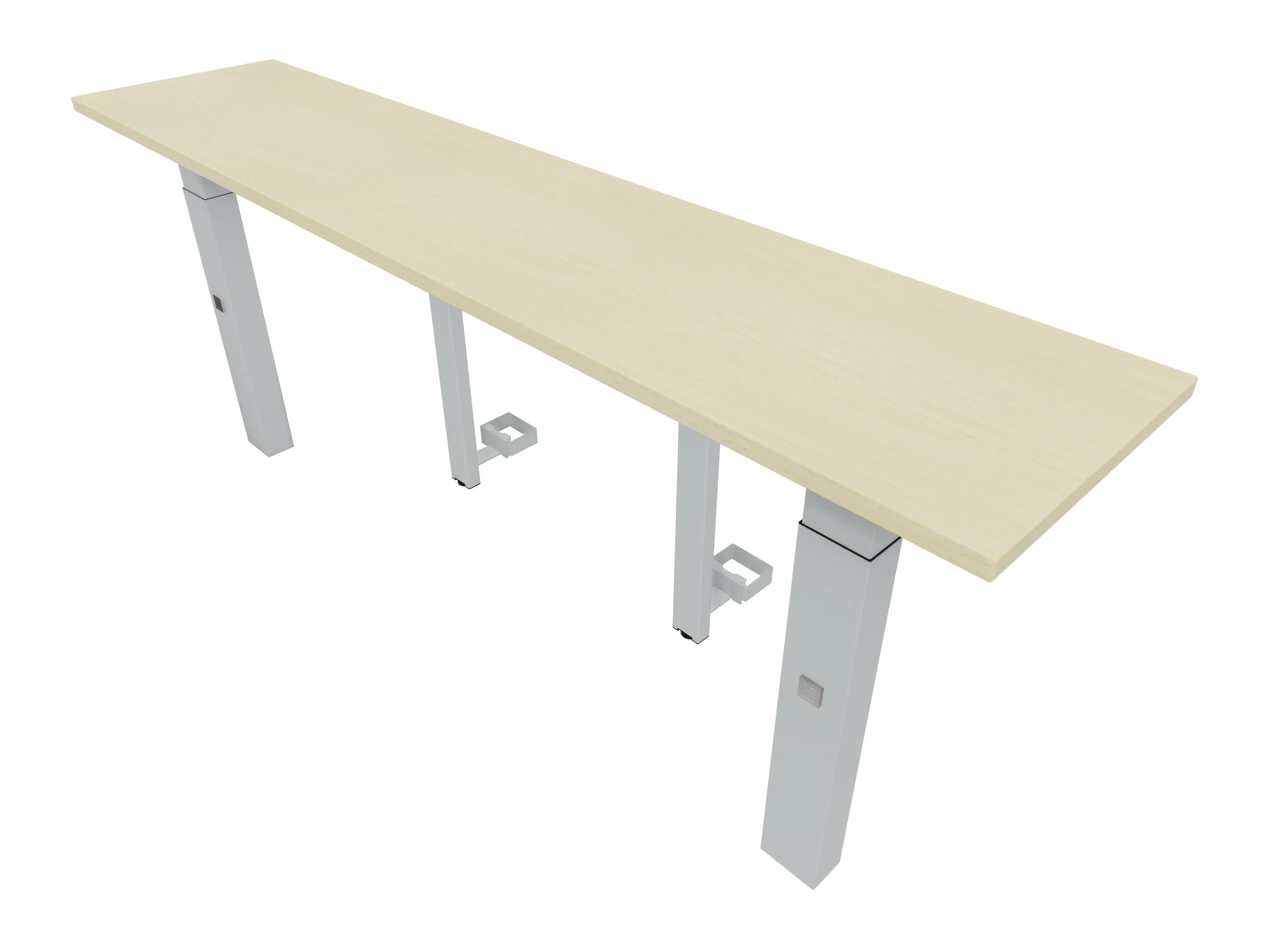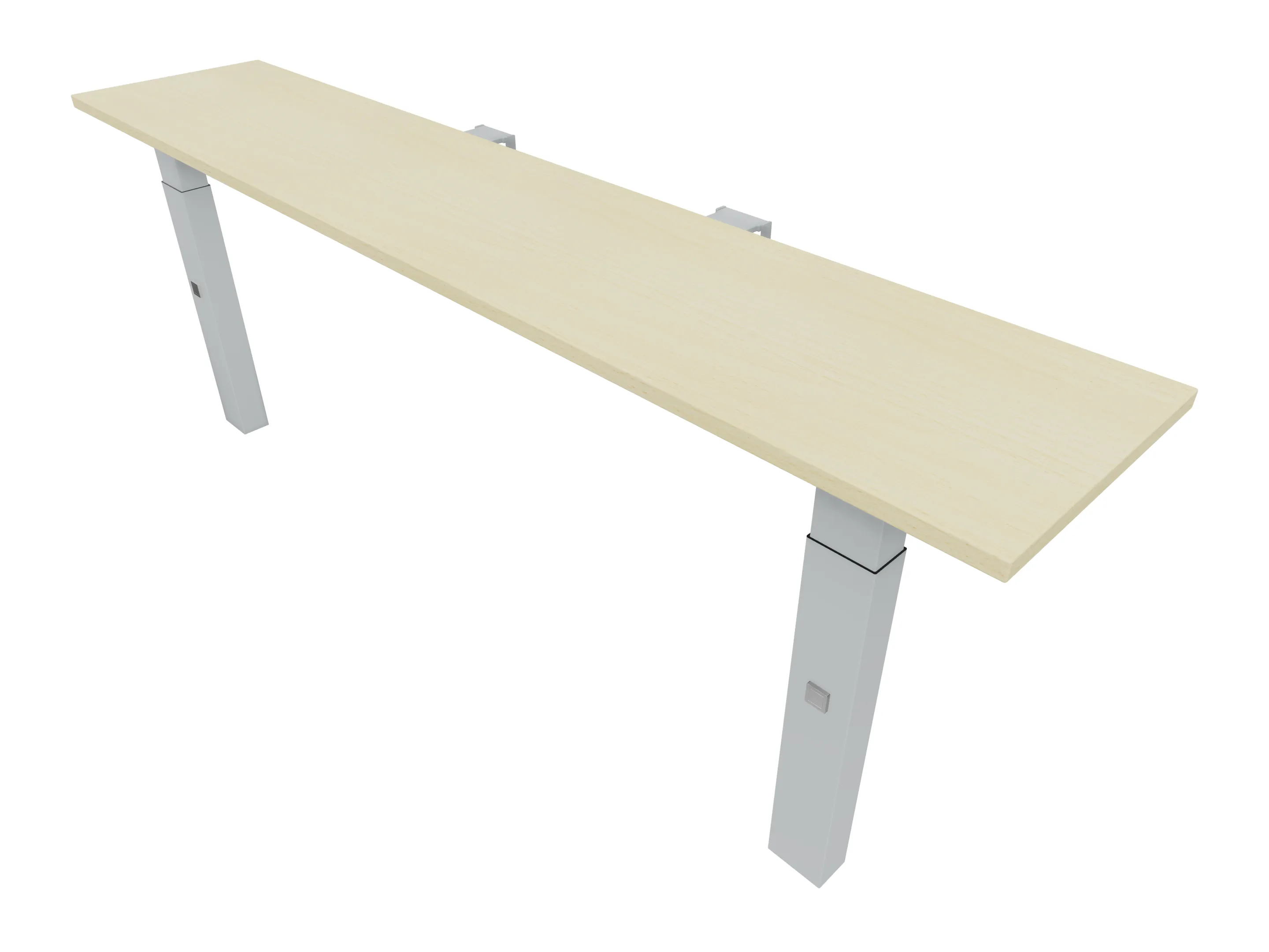 Aanbouwelement voor plaatsing aan zit-sta bureaus, van 2025mm breed en 400mm diep, voor koppeling aan poten. Inclusief twee koppel-steunpoten met hoogte verstelling (650-850mm, d.m.v. "Easy-Push").