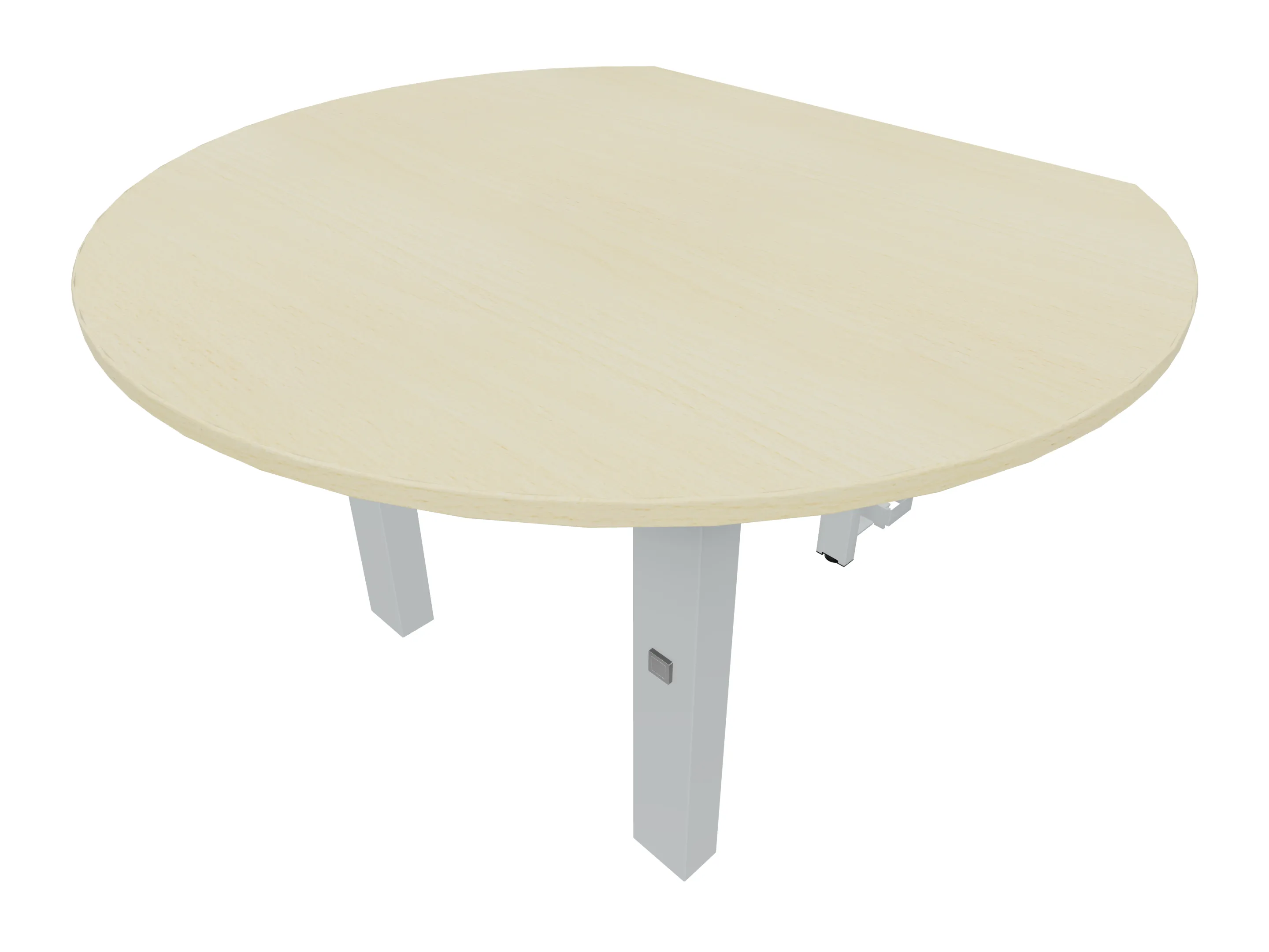 Rond aanbouwelement voor plaatsing aan zit-sta bureaus, links asymetrisch gekoppeld. Diameter is 1100mm, koppelzijde is 800mm. Inclusief 2 koppel-steunpoten zonder hoogte verstelling