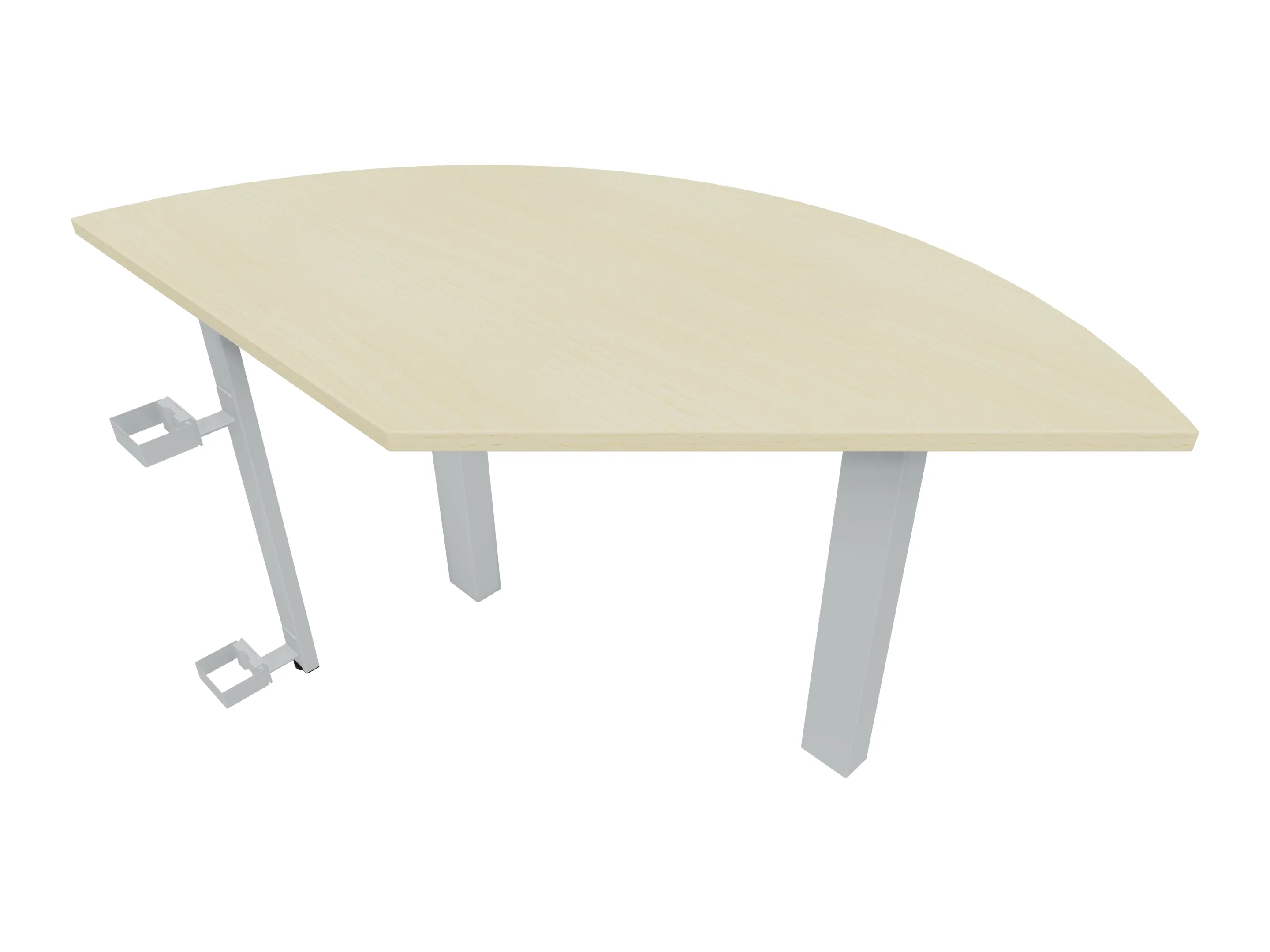 Aanbouwelement voor plaatsing aan zit-sta bureaus, in hoek van 135° geplaatst met een aanbouwzijde van 800mm, een zitzijde van 800, en in radius 800mm. Links geplaatst aan het bureau. Inclusief koppel-steunpoten zonder hoogte verstelling.
