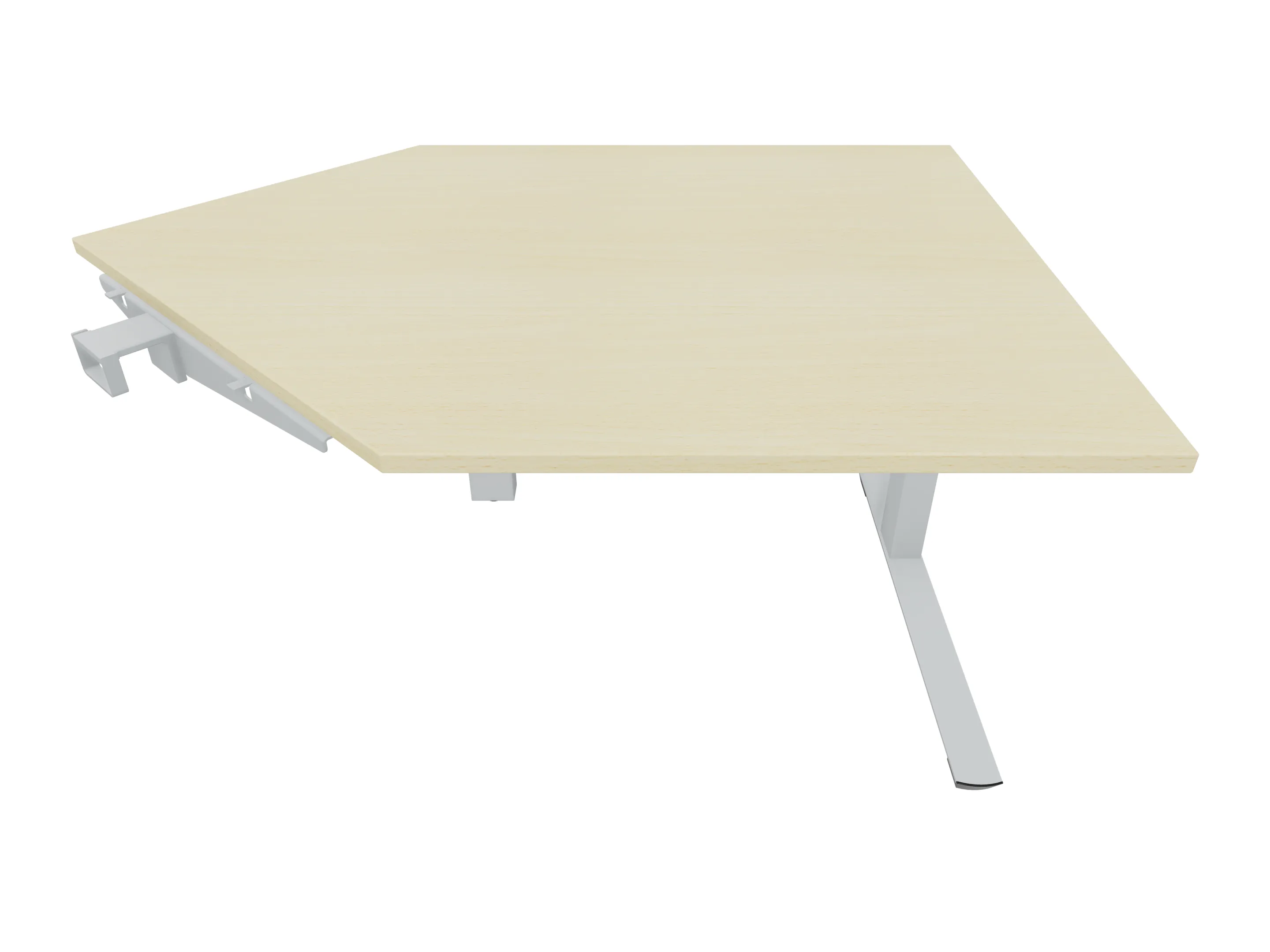 Eindelement in 135° met een aanbouwzijde van 1000mm, een zitzijde van 1000, en lengte 990mm. Rechts geplaatst aan het bureau. Inclusief steunpoten zonder hoogte verstelling.
