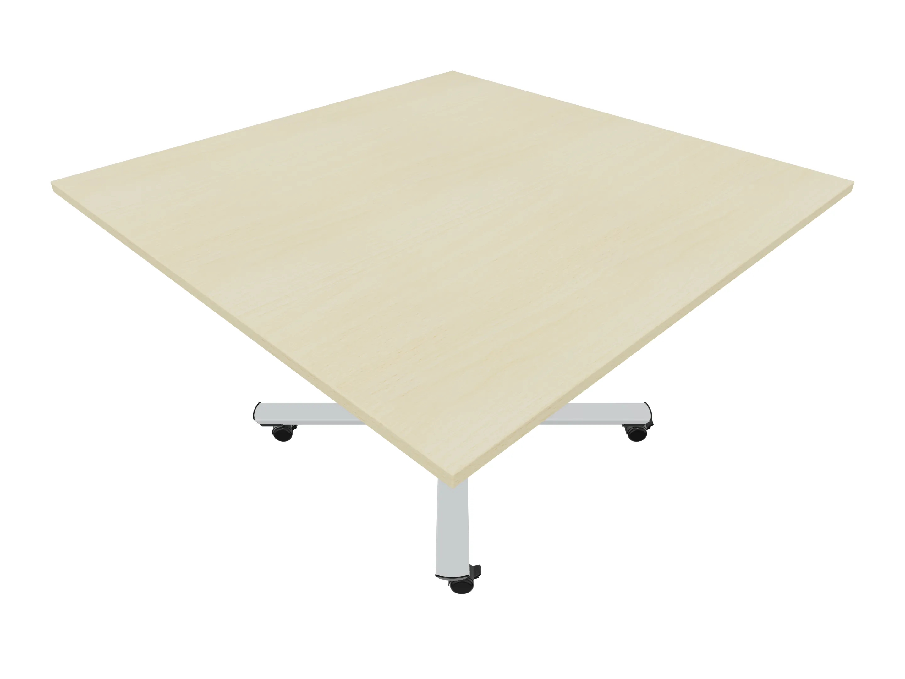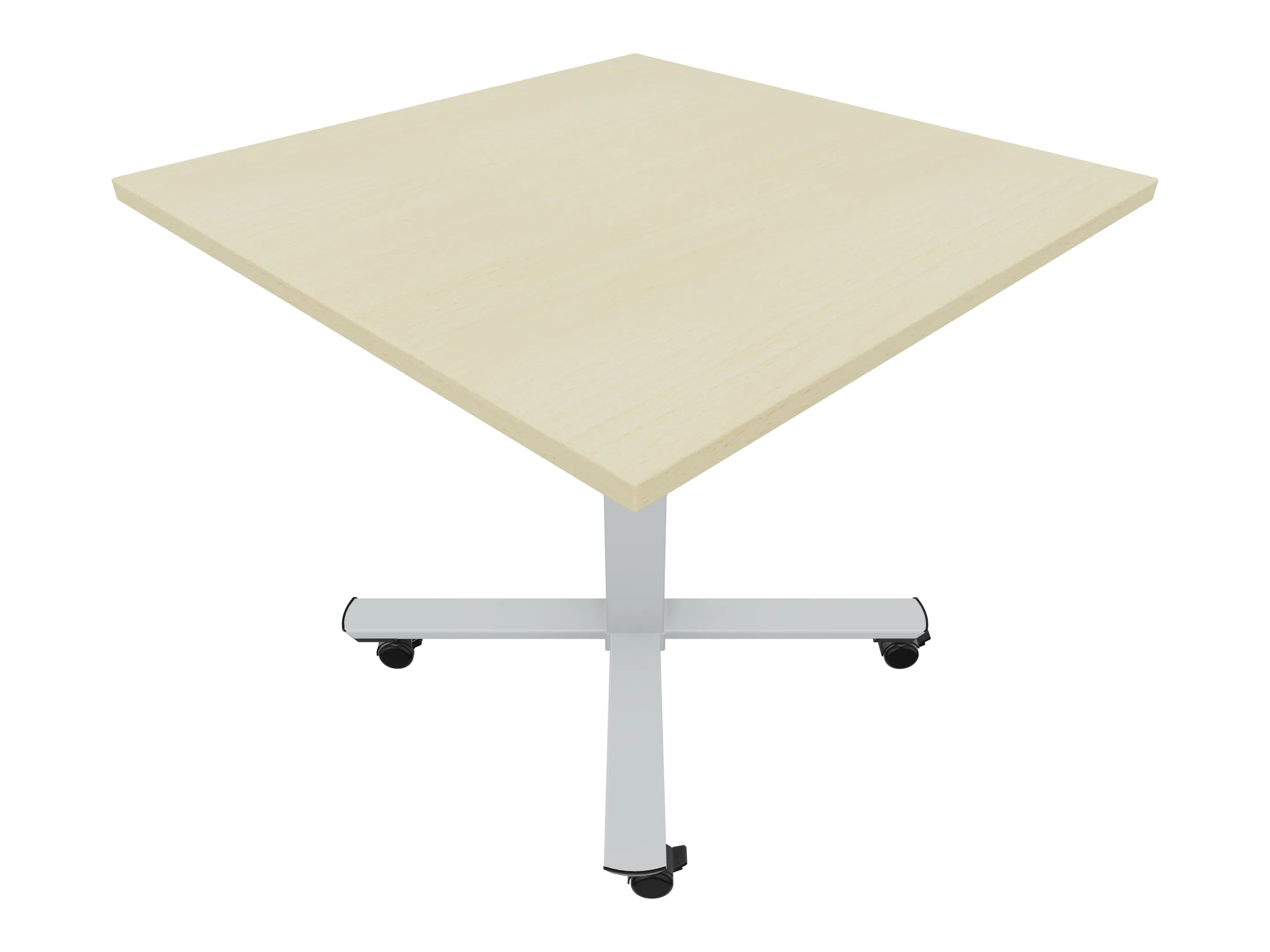 Bijzettafel met een kruisvoet op een kolom van 80 x 80mm, vierkant blad in de afmeting 1200 x 1200mm en een hoogte van 726mm, verrijdbaar.
