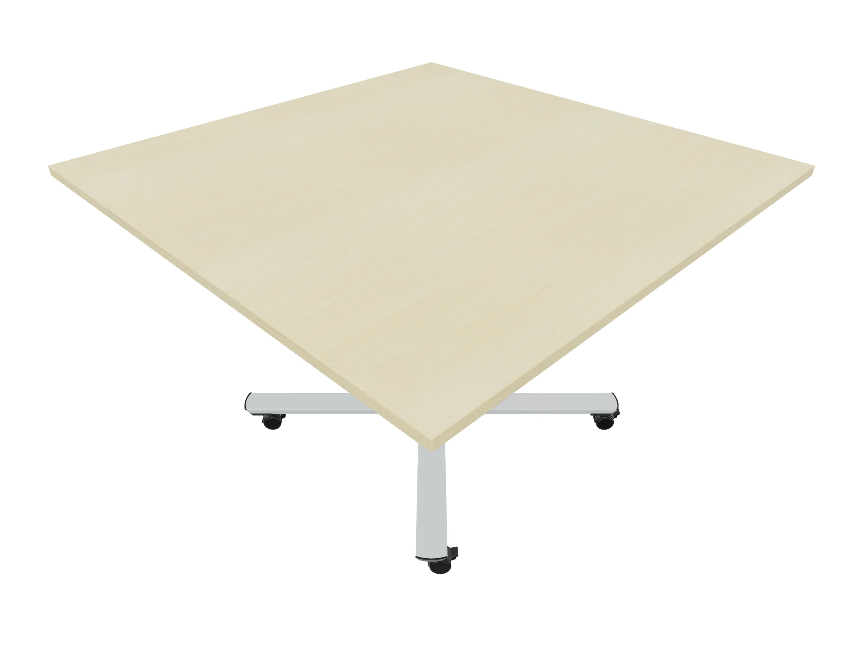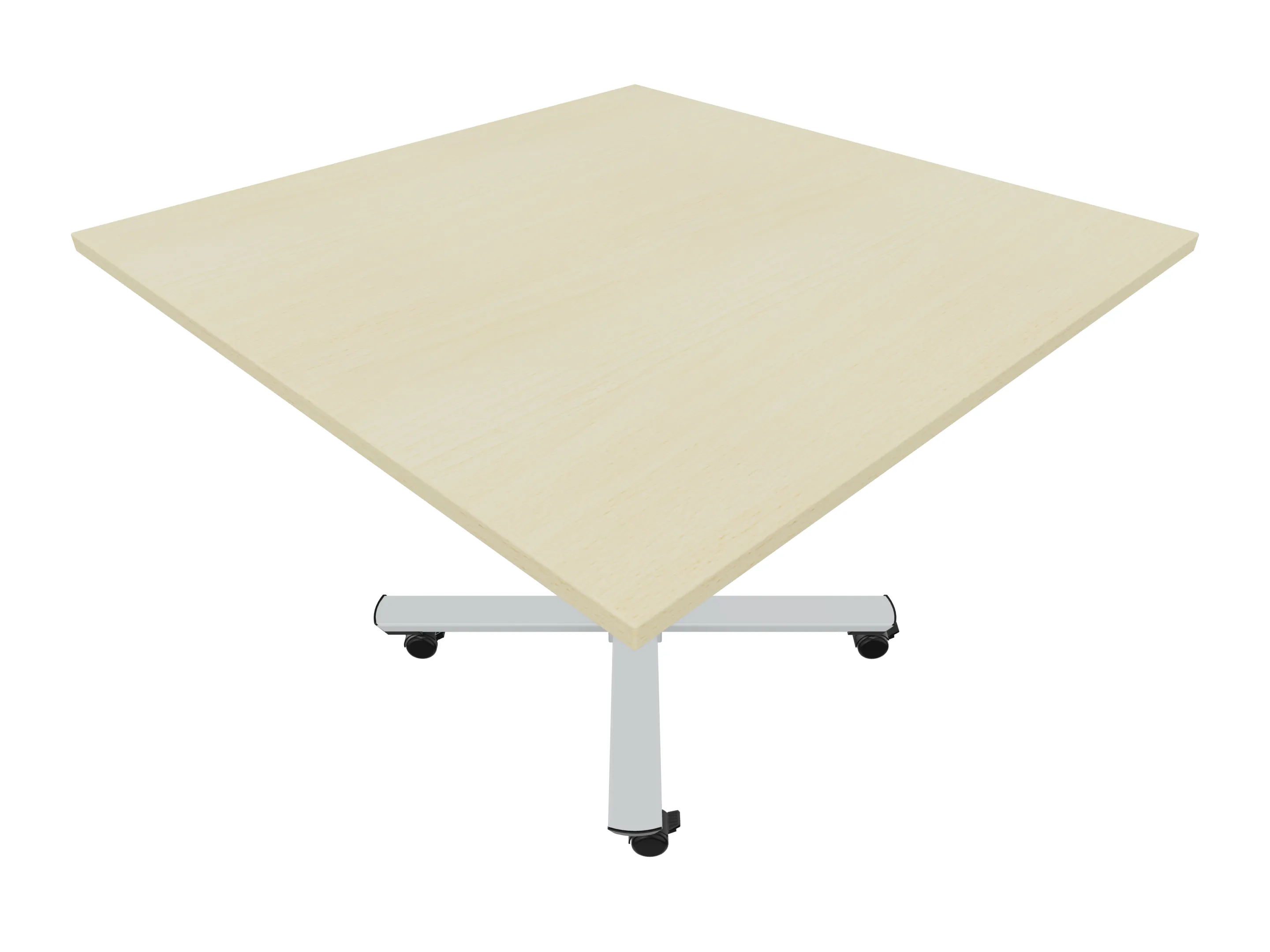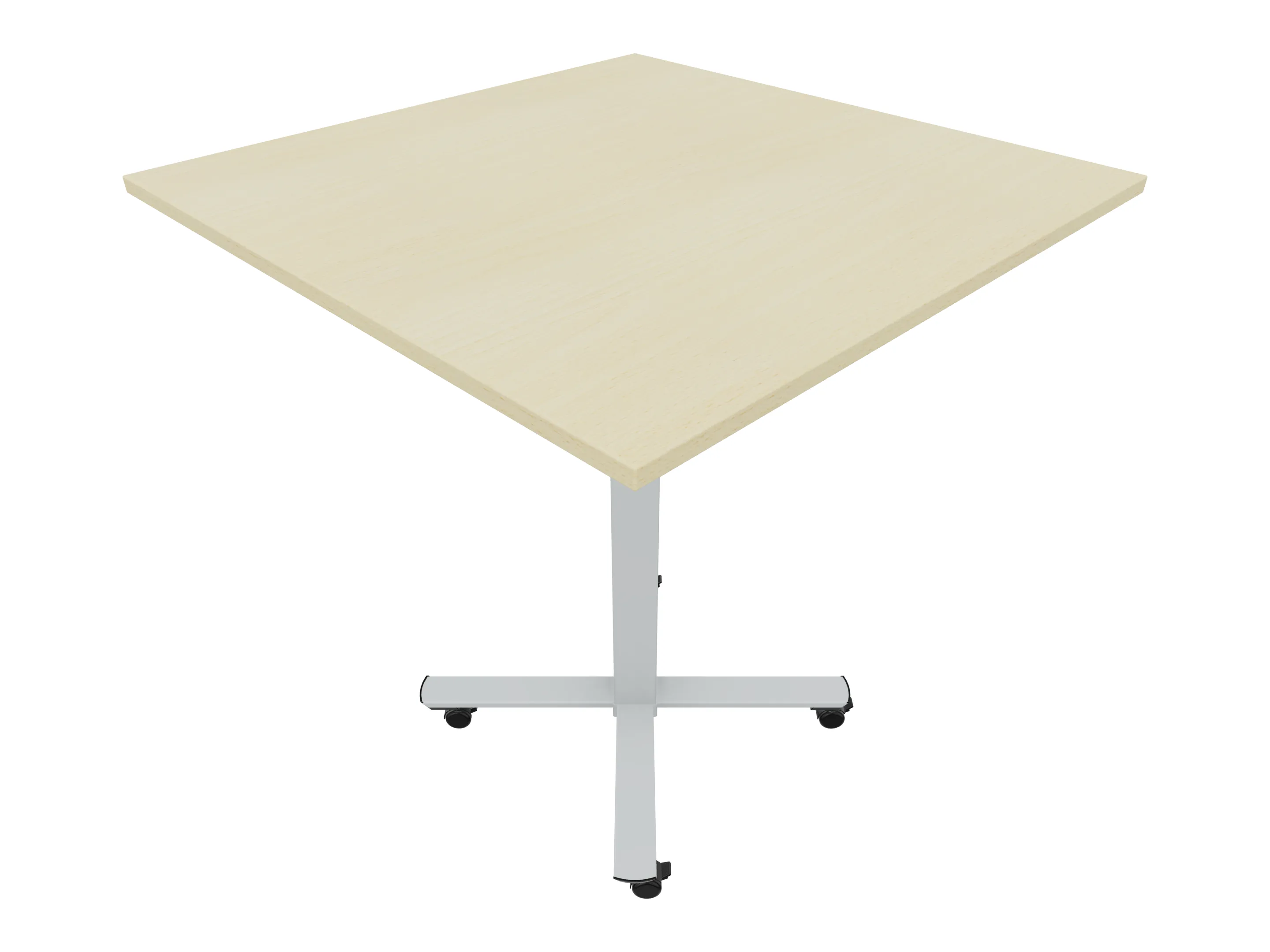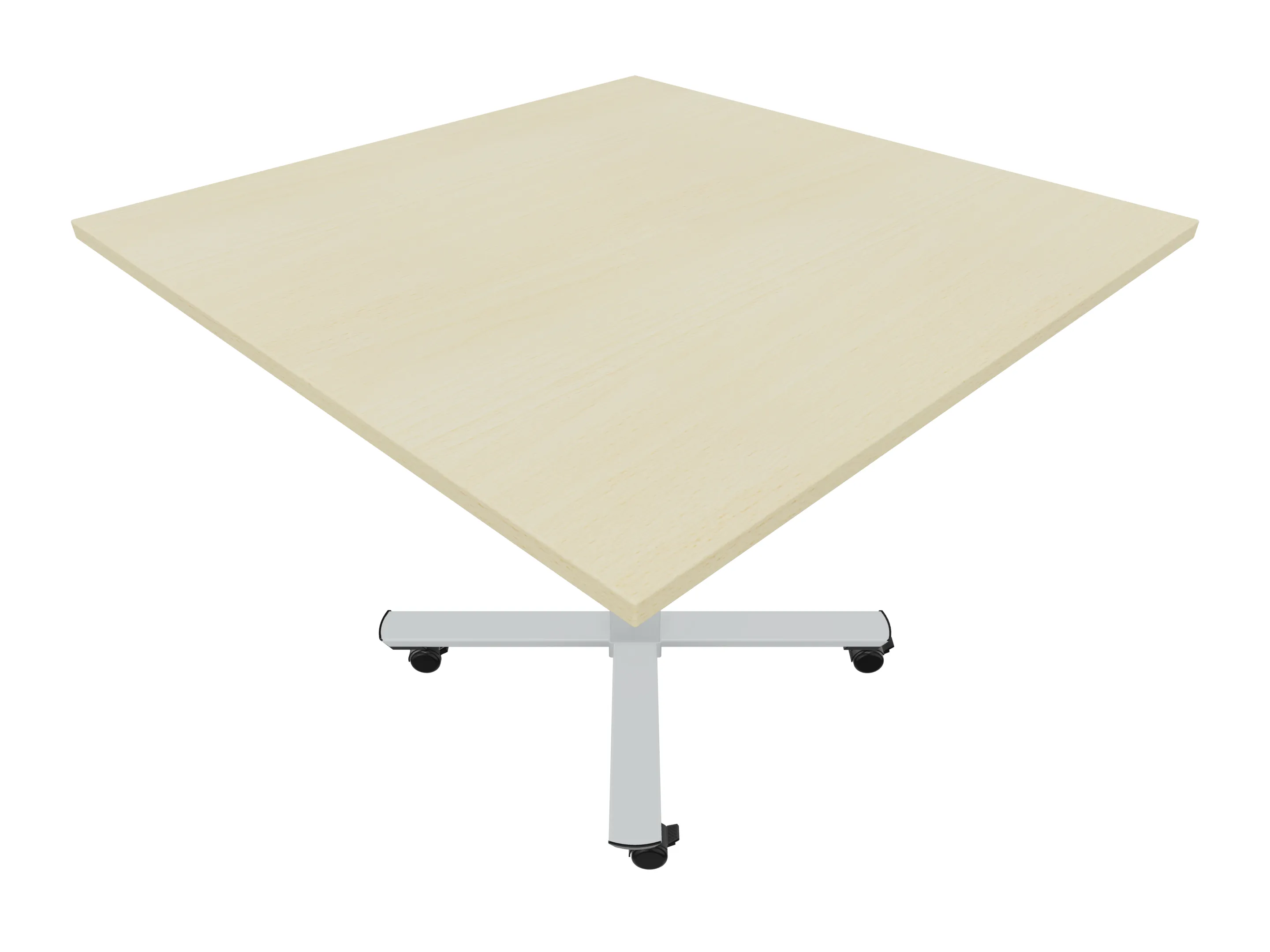 Bijzettafel met een kruisvoet op een kolom van Ø80mm, vierkant blad in de diameter Ø1200mm en een hoogte van 1050mm, verrijdbaar.