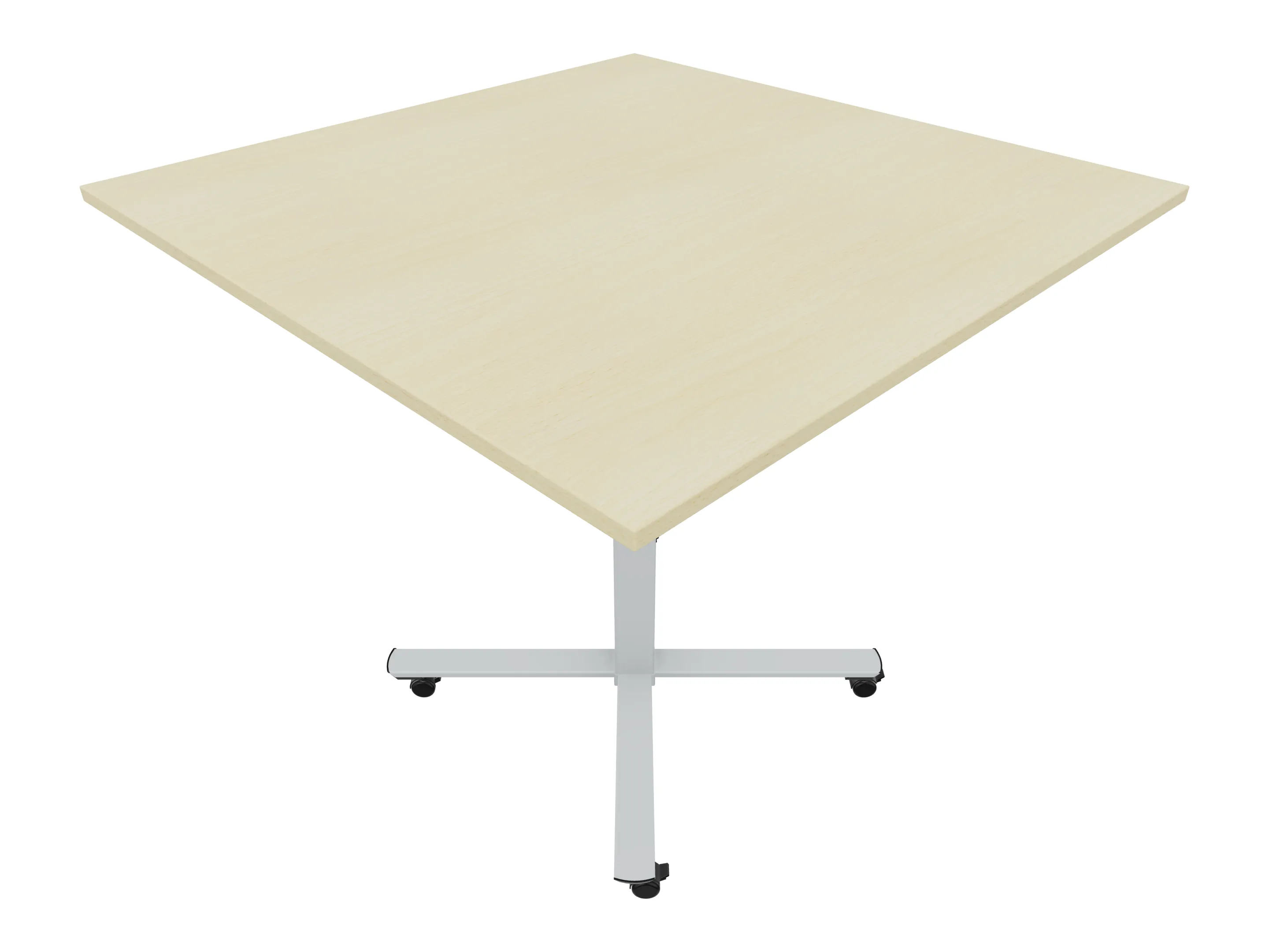 Bijzettafel met een kruisvoet op een kolom van 80 x 80mm, vierkant blad in de afmeting 1200 x 1200mm en een hoogte van 1050mm, verrijdbaar.