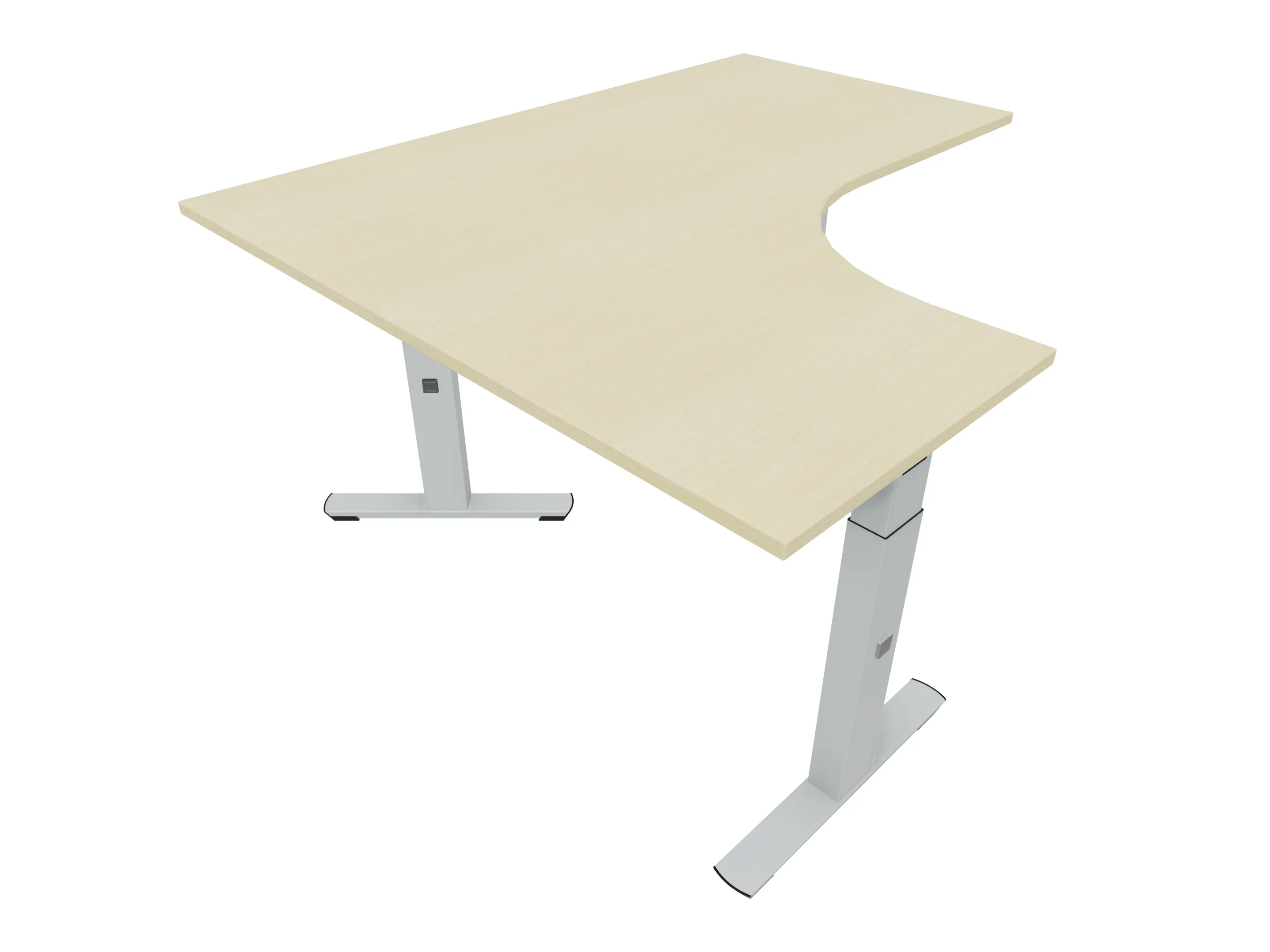 Bureau met 2 poten (elektrisch hoogte instelbaar tussen 650-1250mm d.m.v. bediening), waarvan de rechter 1000mm diep, de linker 800mm diep. Bureau heeft een rechte zitzijde, met een ronding en aanbouw zijde van 441mm. Afmeting: 1600 x 1000mm (BxD).