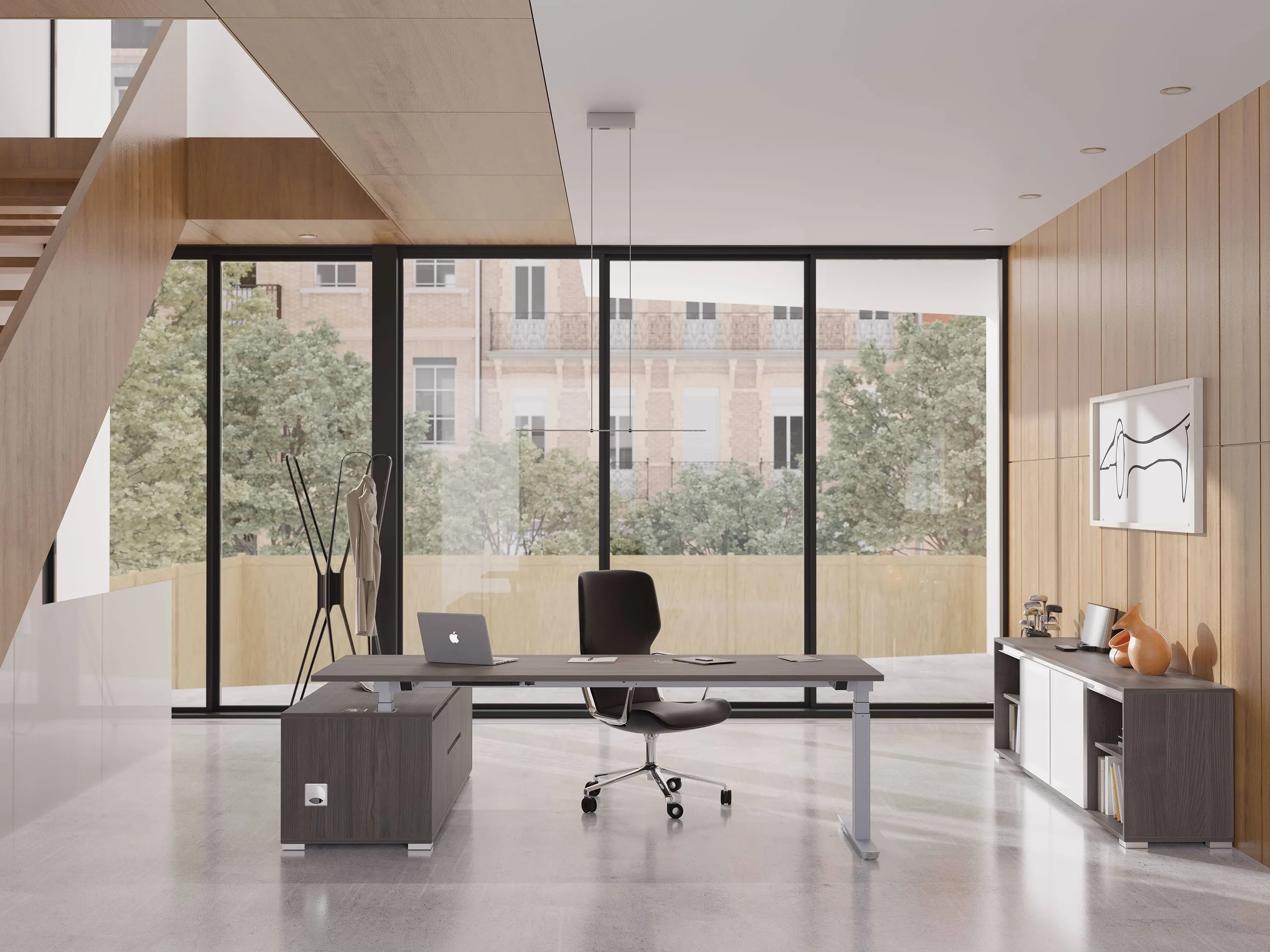 Rechts: 1 draaideur, 1 kabeldoorvoer in Chroom Mat, 1 kabelketting, kleur Zwart/Zilver, inzet voor Crew frame rechts. Midden: Twee laden met uittrekvergrendeling. Links: 1 x draaideur met 1 legbord, extra achterwand, op hoeksokkels