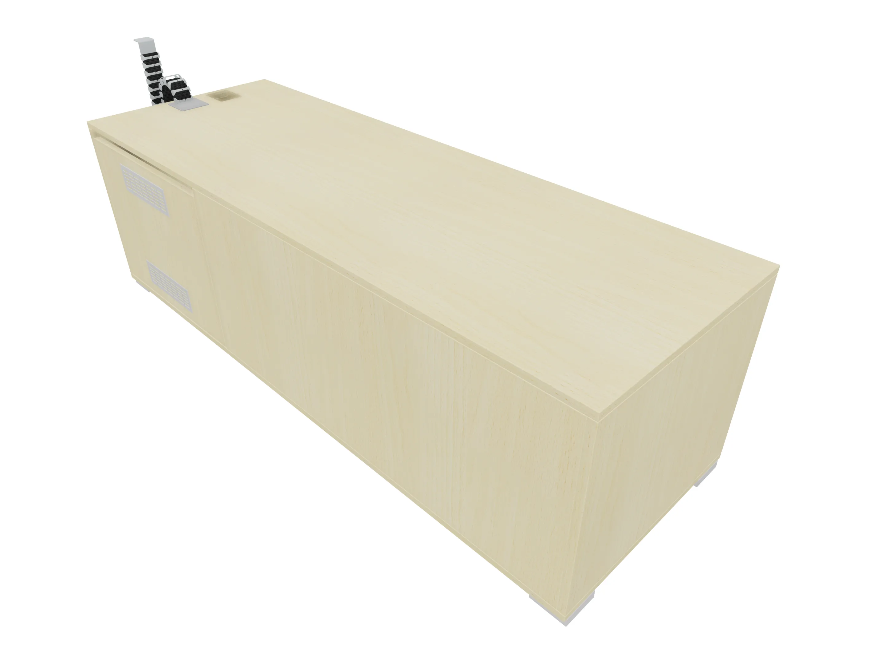 Links: 1 draaideur, ventilatierooster, 1 kabeldoorvoer in Chroom Mat, 1 kabelketting, kleur Zwart/Zilver, inzet voor Crew frame links. Midden: Twee laden met uittrekvergrendeling. Rechts: 1 x draaideur met 1 legbord, extra achterwand, op hoeksokkels.