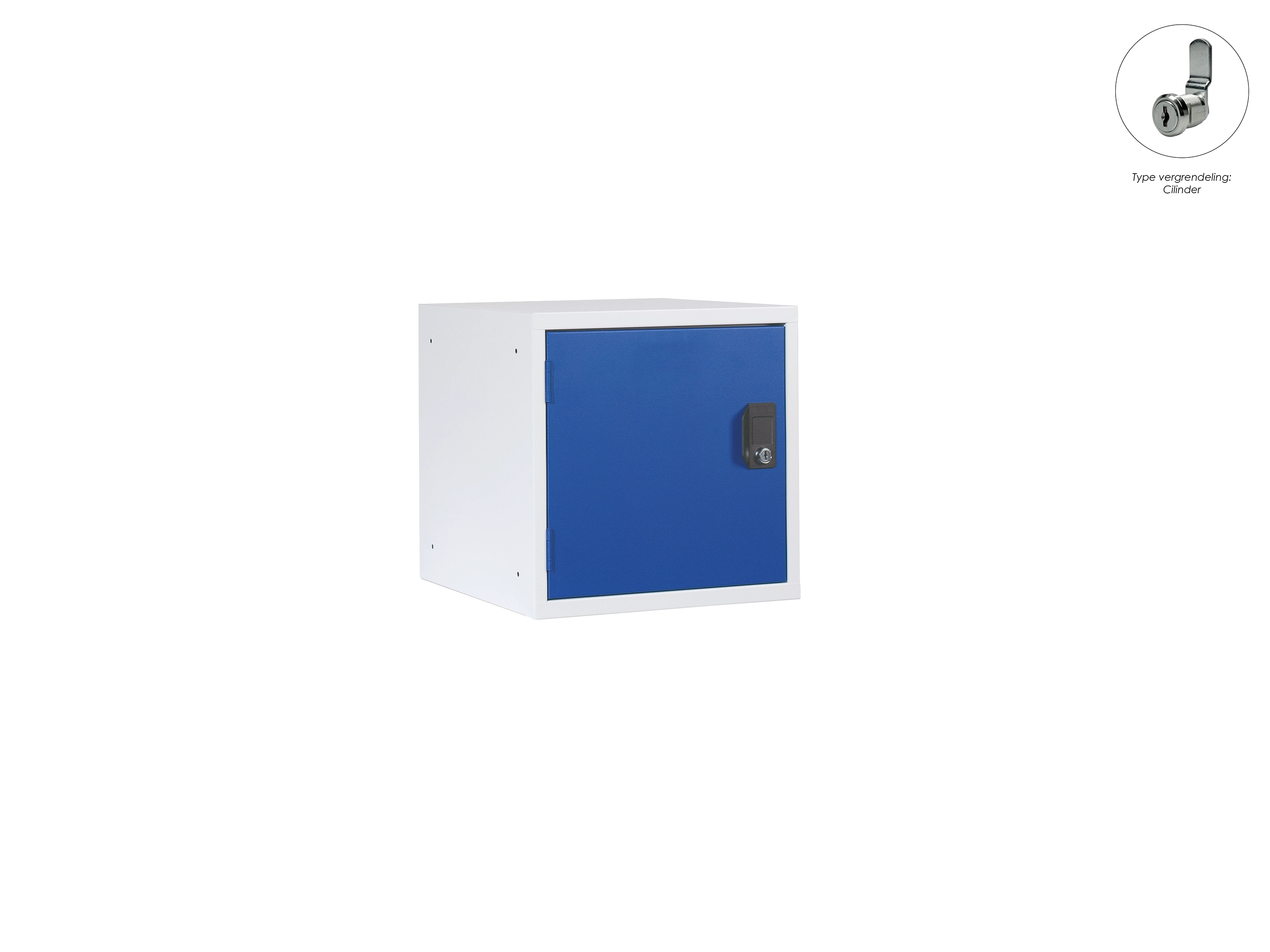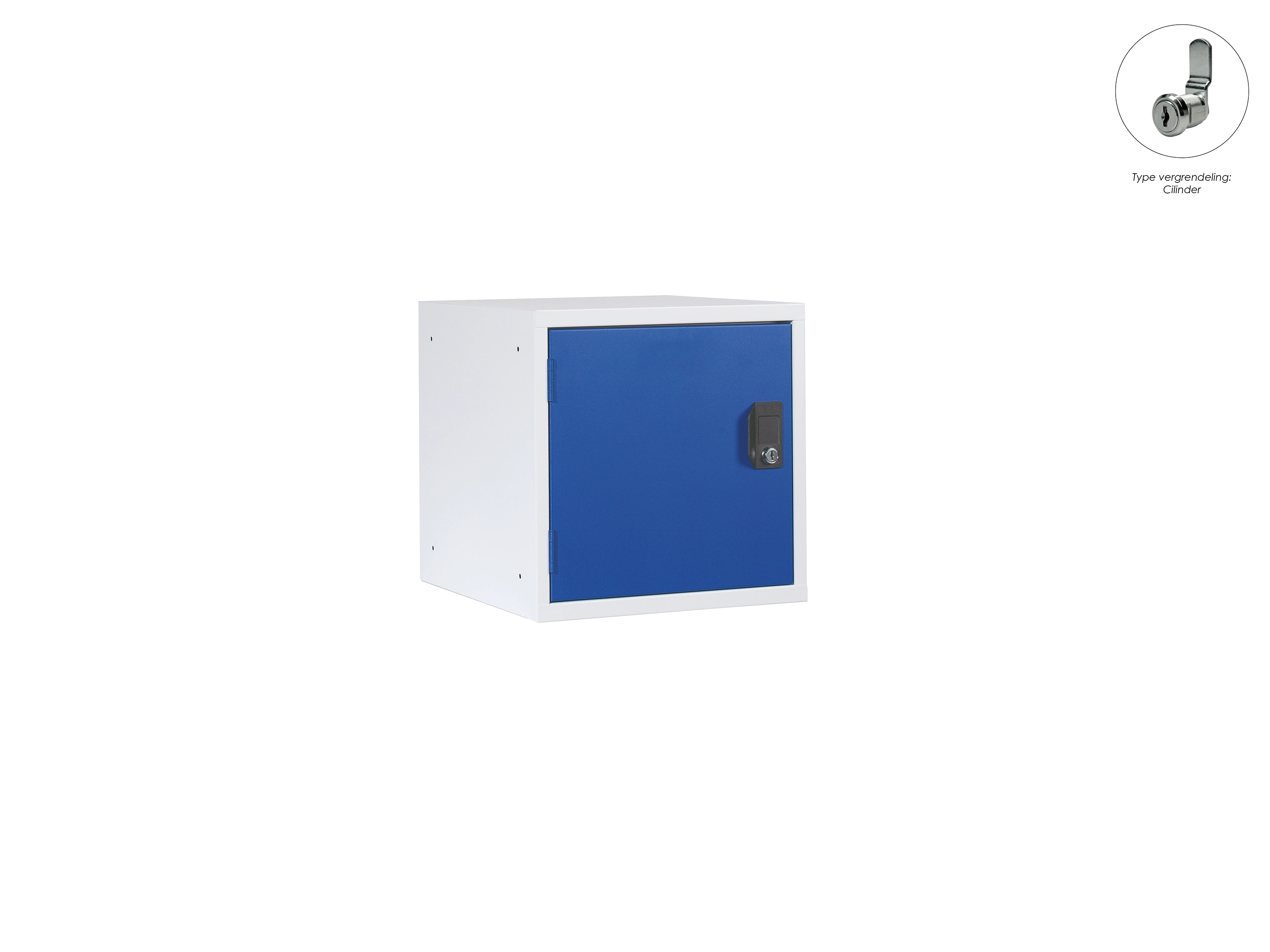 Type deuren: glad zonder naamkaarthouder, type slot: cilinderslot. Kleur romp: grijs (RAL7035), kleur deuren: blauw (RAL5010) . Afmeting: 45x45x45 cm (HxBxD). Netto doorsteek: 395x374x433mm. Aantal sleutels per slot: 2.