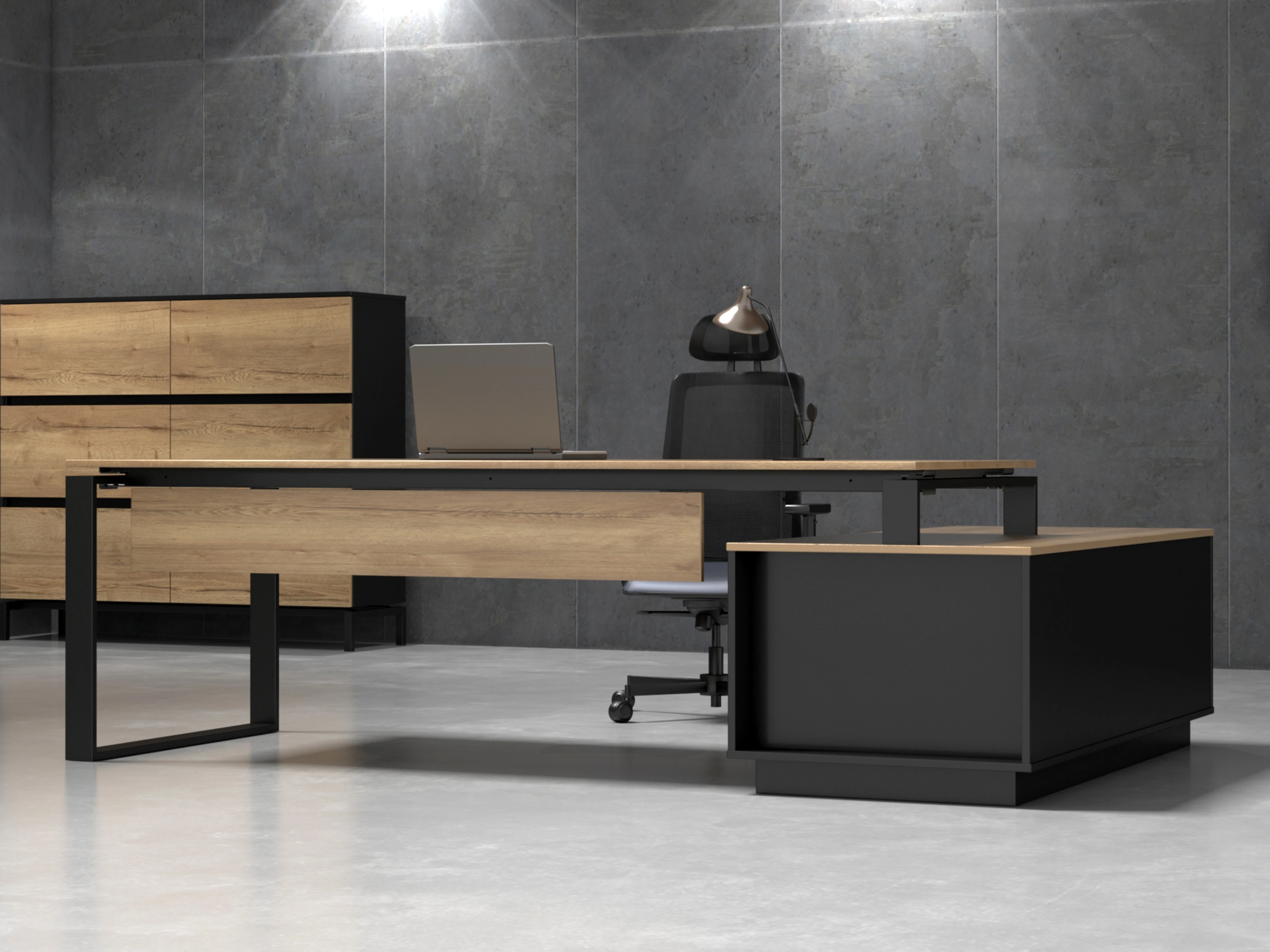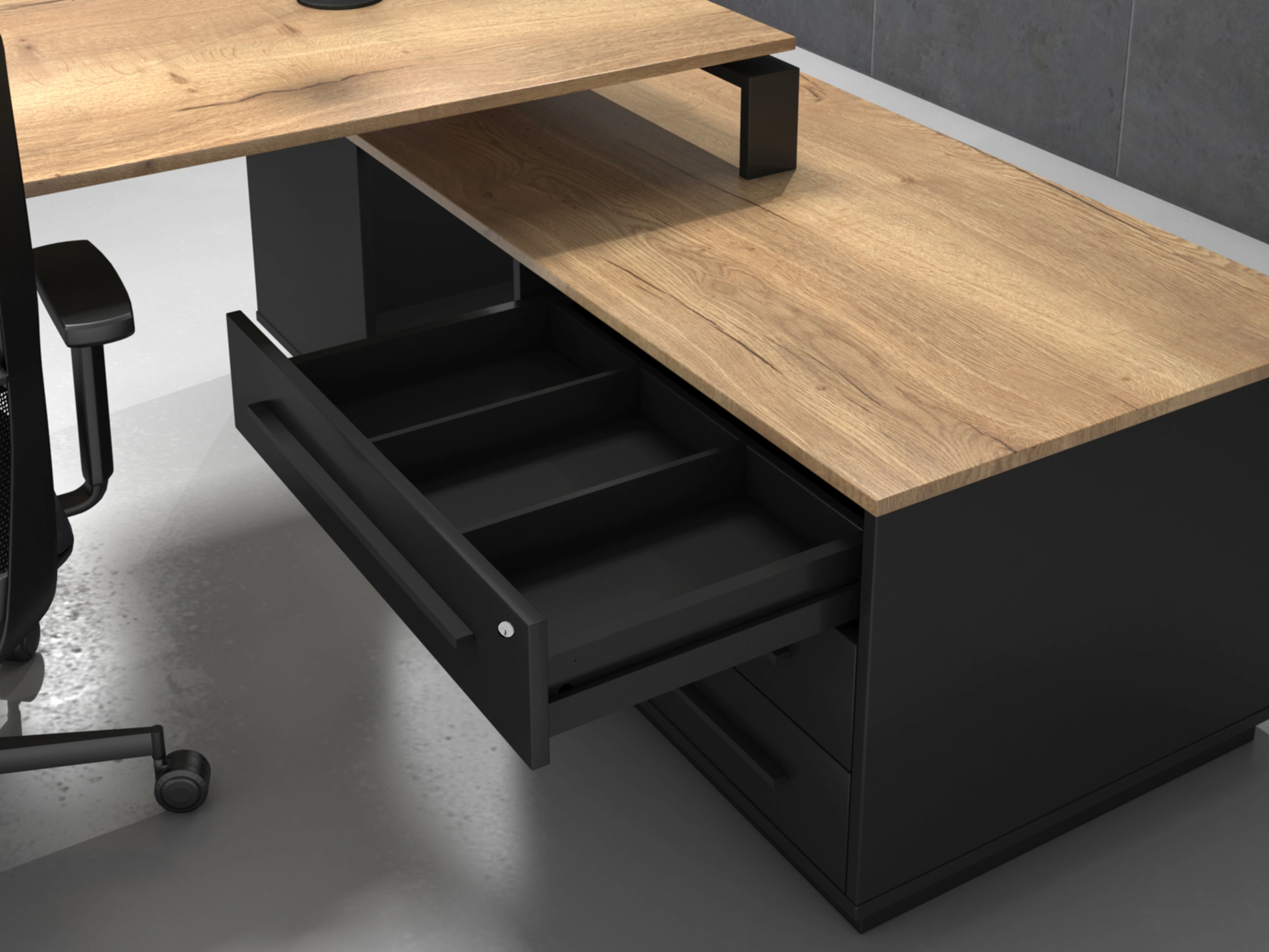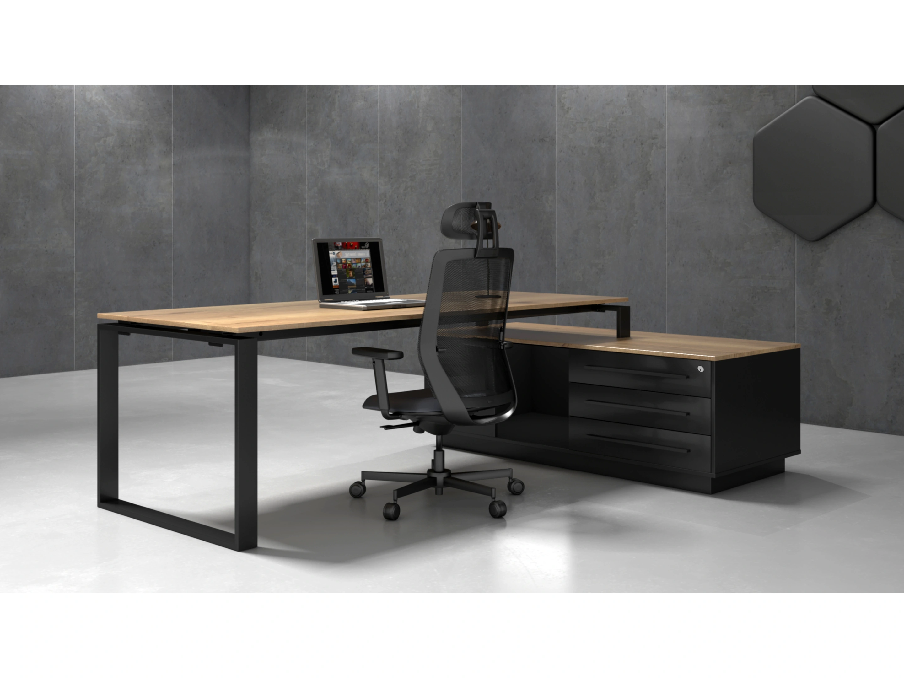 Directiebureau op O-Poot frame van 224x74x90cm met een zwevend blad. Hoekaanbouw aan rechter zijde van 180x57cm breed voorzien van een ladeblok met 3 lade. Bladdikte is 18mm.