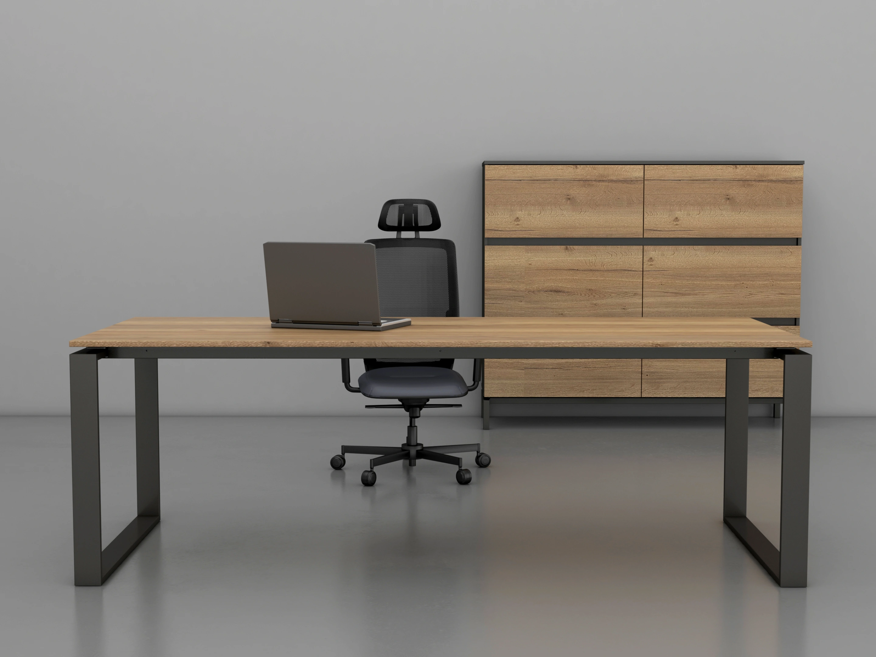 Directiebureau op O-poot frame van 200x74x90cm met een zwevend blad. Bladdikte is 18mm.