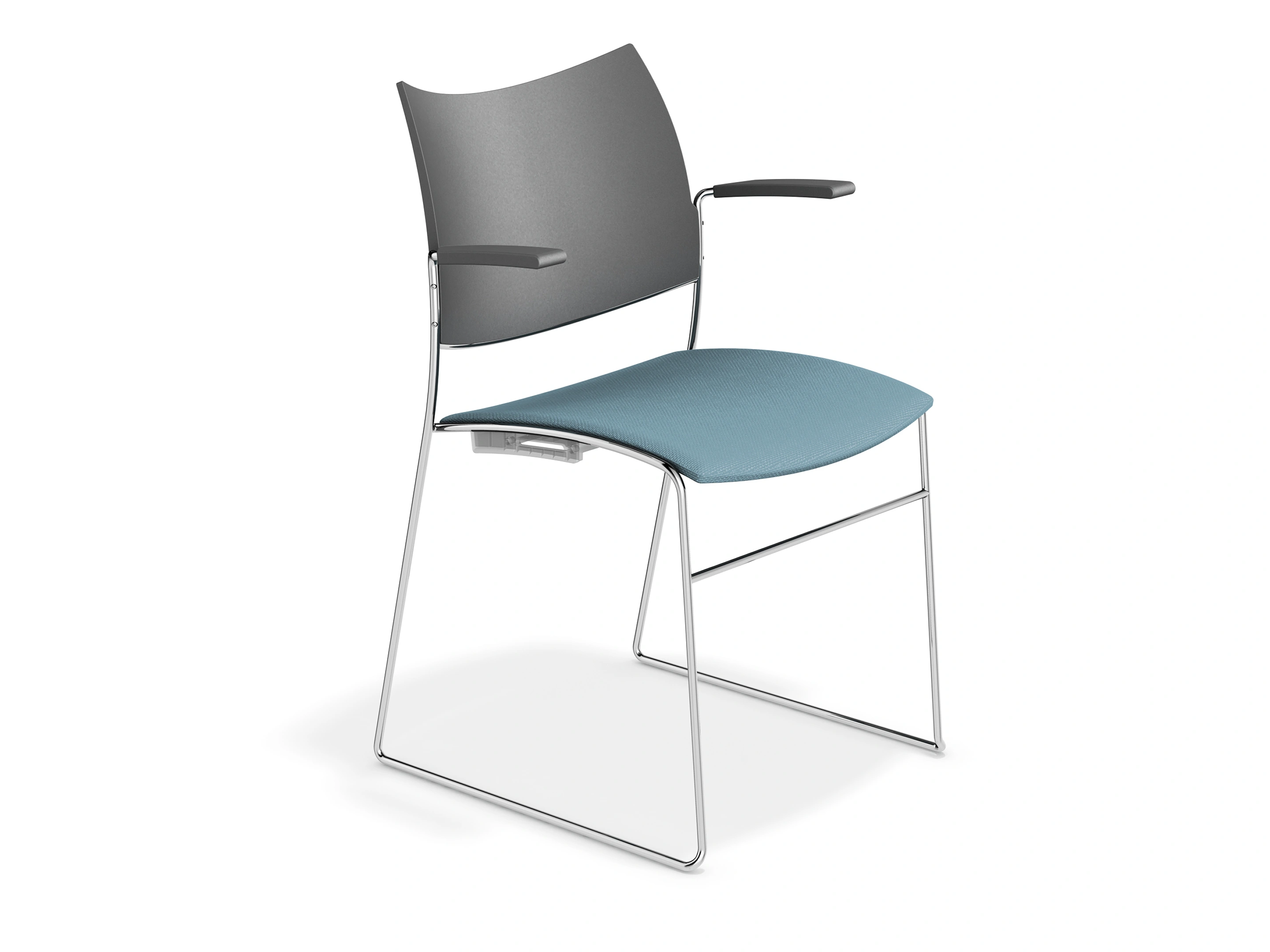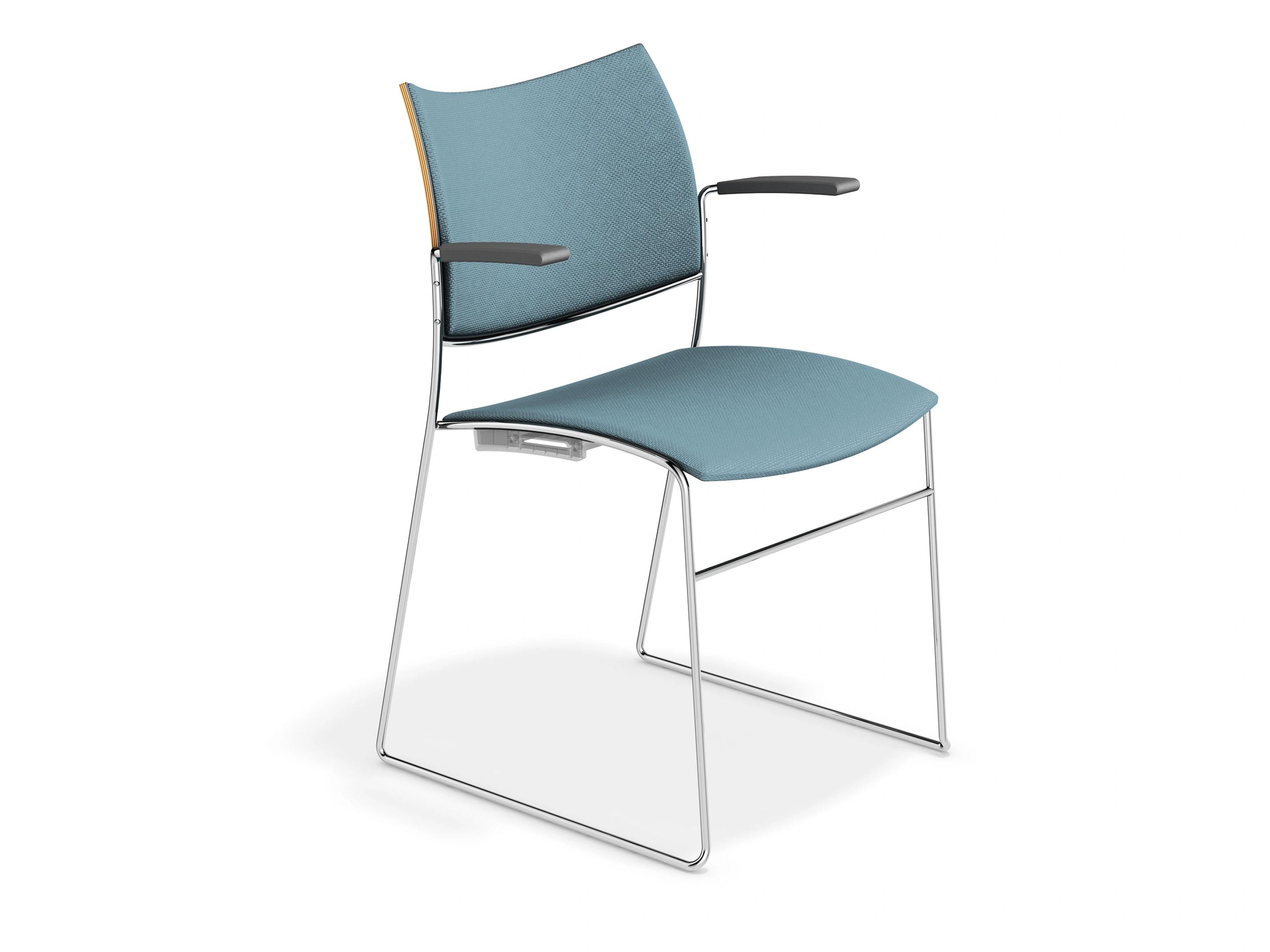 Sledeframe met een gestoffeerde zitting en kunststof rug zonder stoffering. Inclusief armleggers. Stapelbaar tot 32 stuks op transportwagen en tot 6 stuks vrijstaand.