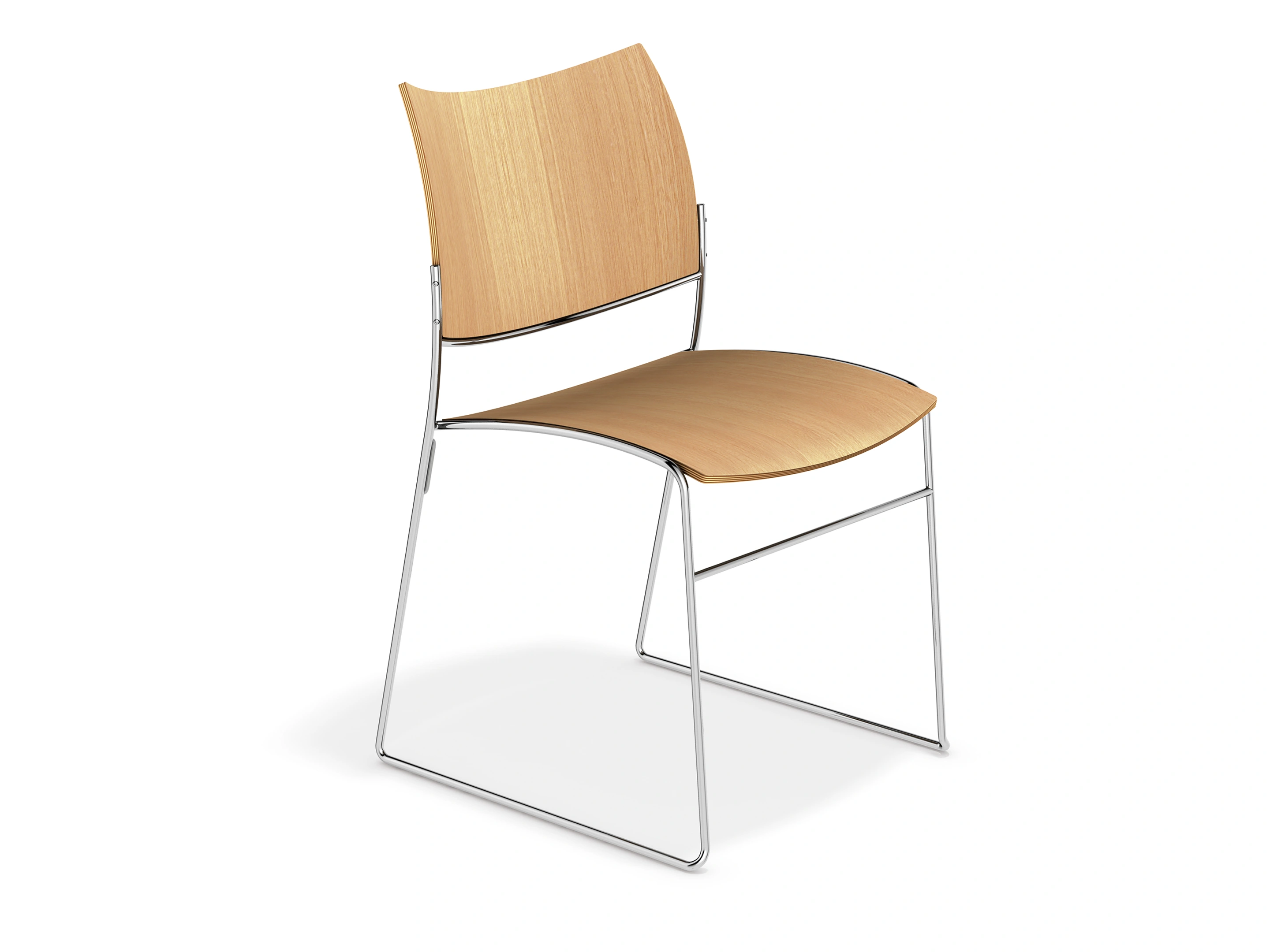 Sledeframe met een houten zitting en rug zonder stoffering. Exclusief armleggers. Stapelbaar tot 45 stuks exclusief rijverbinding op transportwagen en tot 6 stuks vrijstaand. Stapelbaar tot 6 stuks.