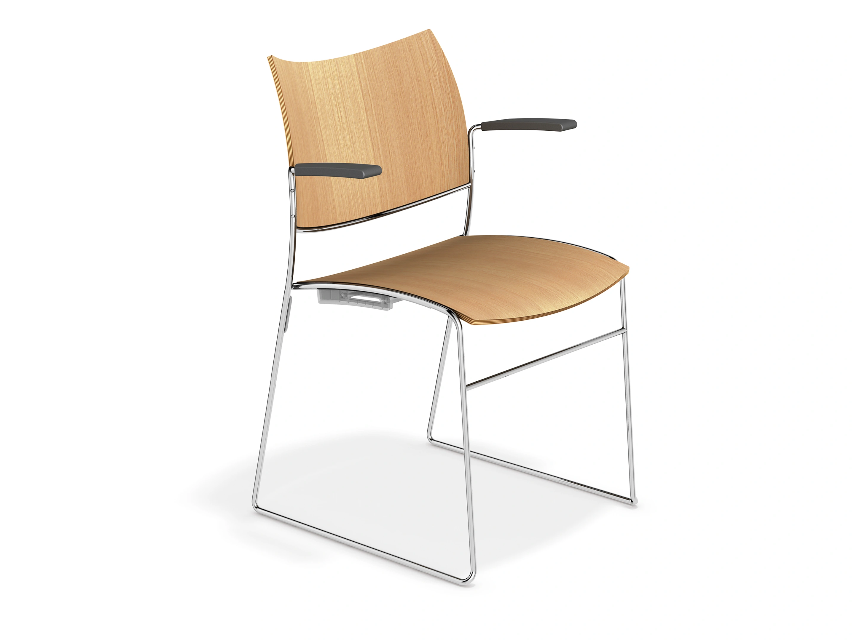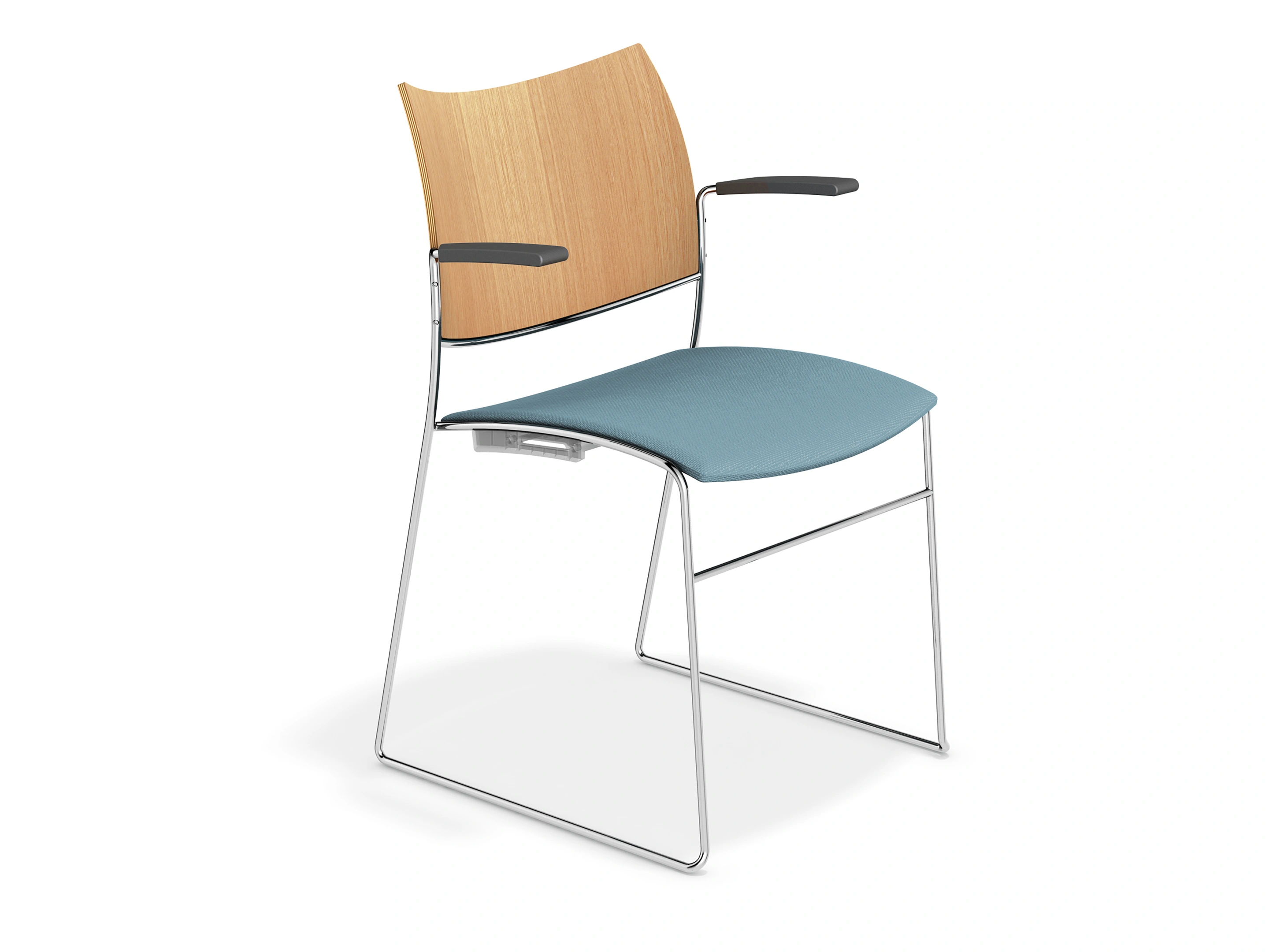 Sledeframe met een gestoffeerde zitting en houten rug zonder stoffering. Inclusief armleggers. Stapelbaar tot 32 stuks op transportwagen en tot 6 stuks vrijstaand.