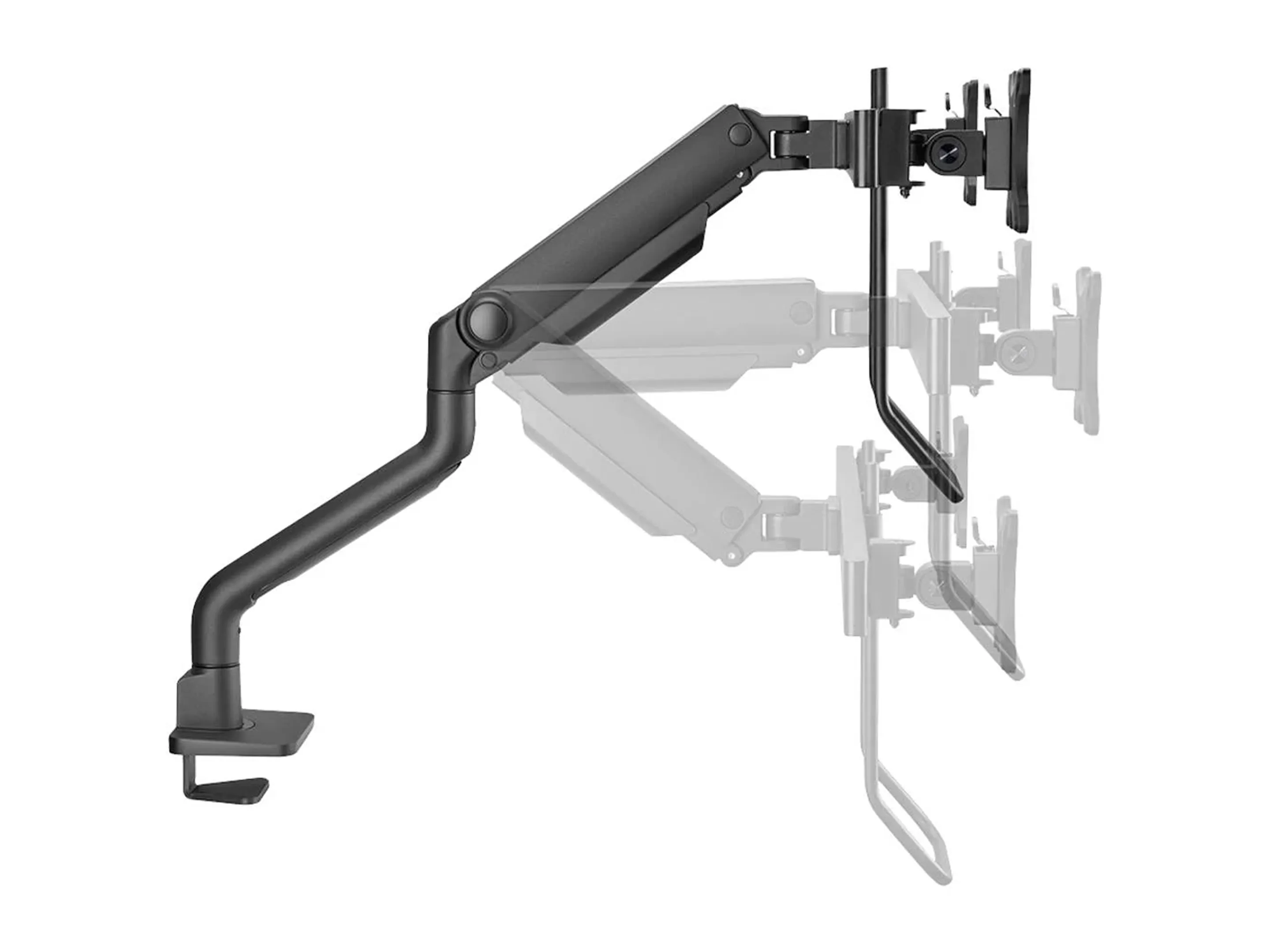 Gasveer full motion monitorarm met crossbar en handvat, VESA patroon: 75x75 & 100x100 mm, Bureaumontage: Doorvoer & Klem, Hoogteverstelling: 19,1-52,7 cm, Max. beeldformaat: 32 inch (per beeldscherm, Max 8kg (per beeldscherm), Kantelen: +60°, -60°