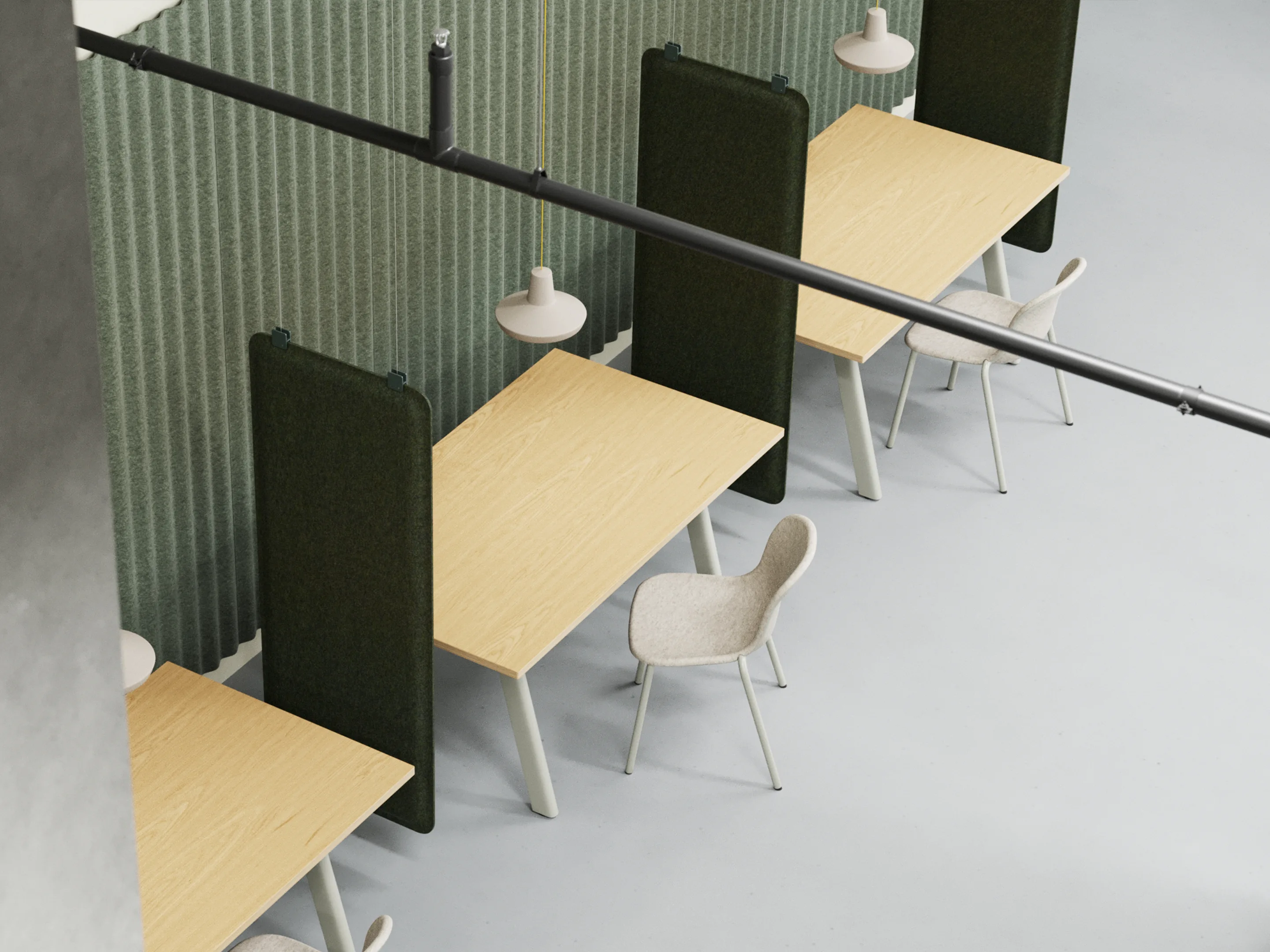 Uit gerecycled PET flessen gevormde werkplek hangdivider. Afmeting: 630x1600x50mm (BxHxD).