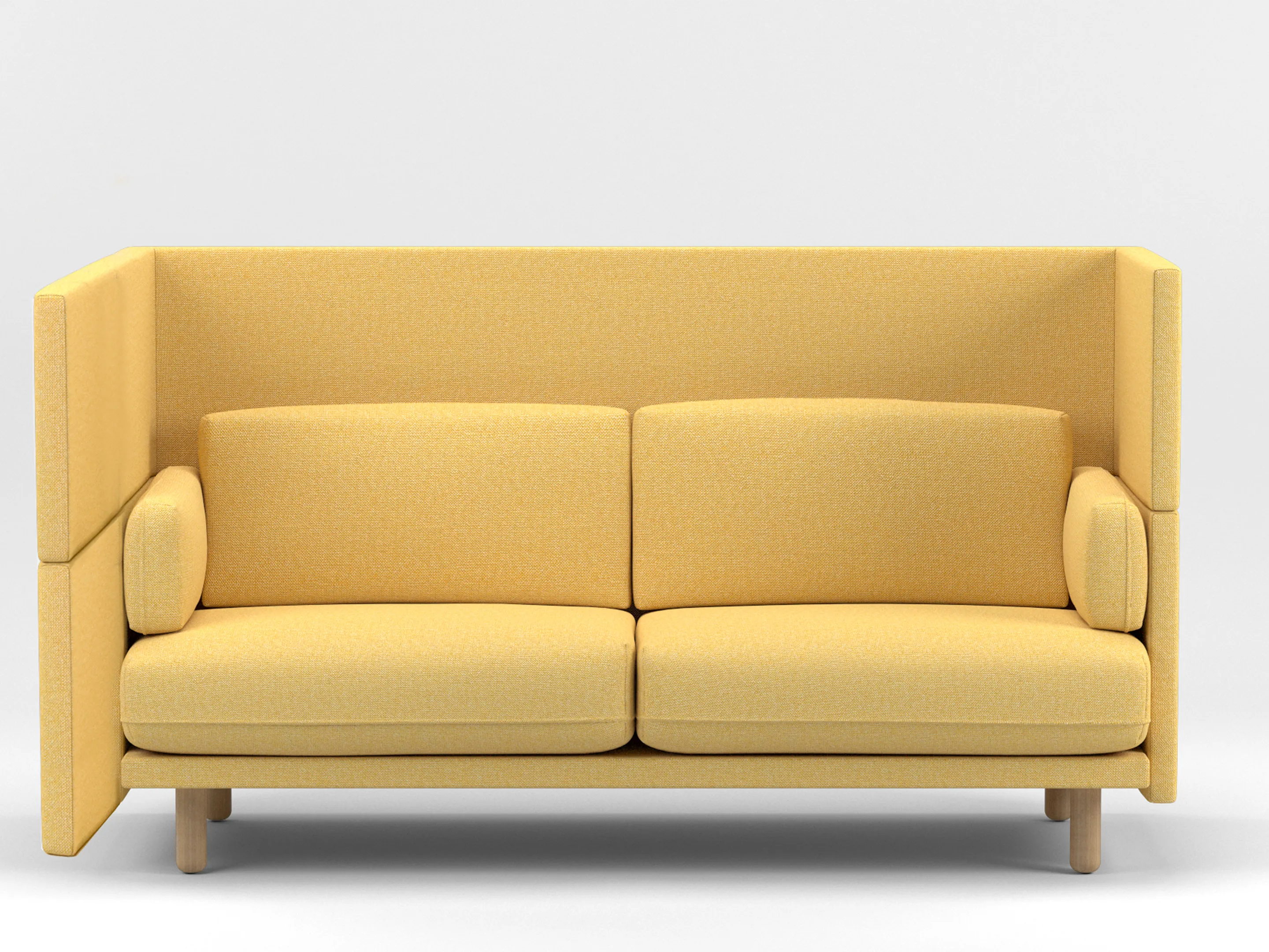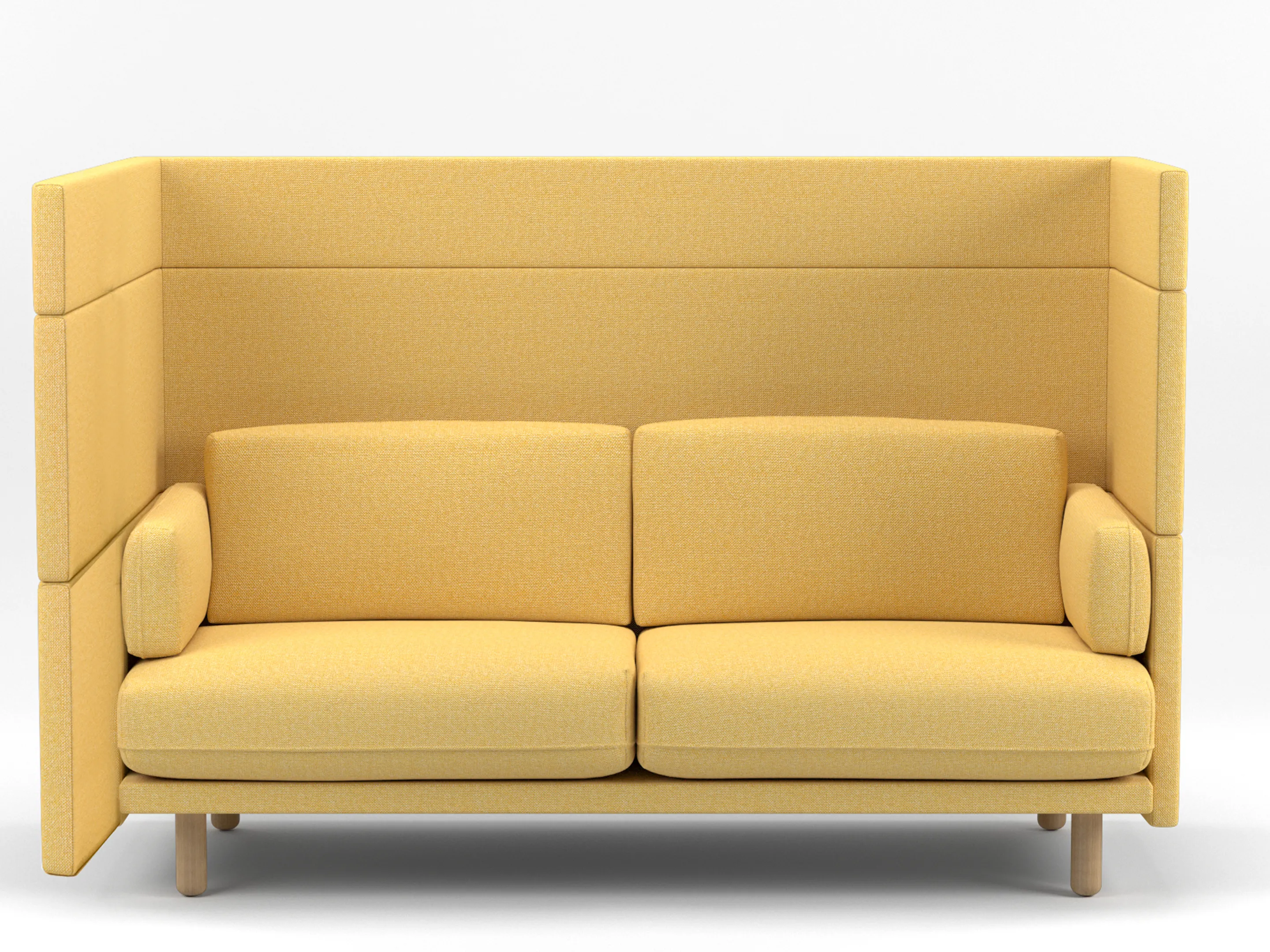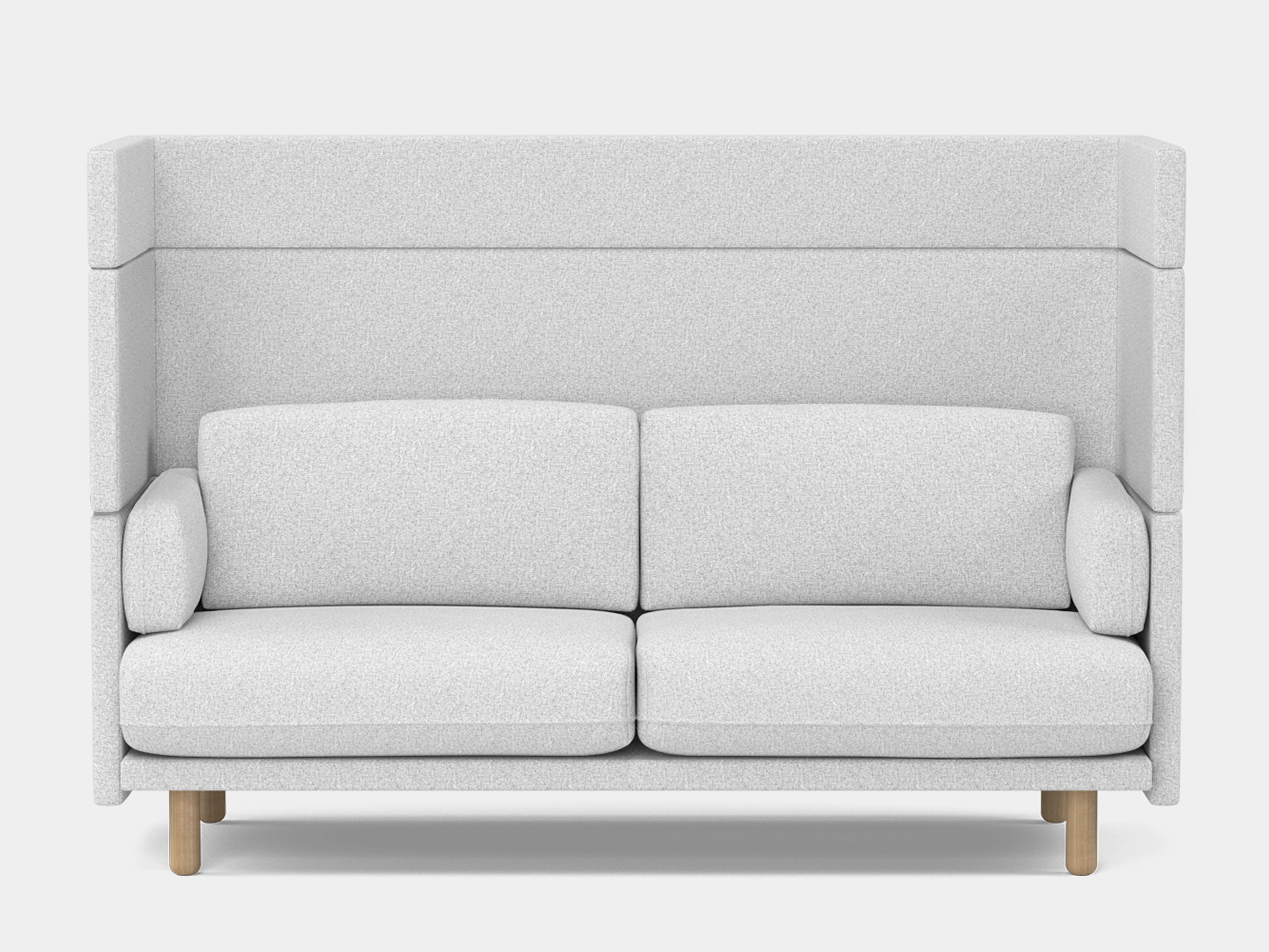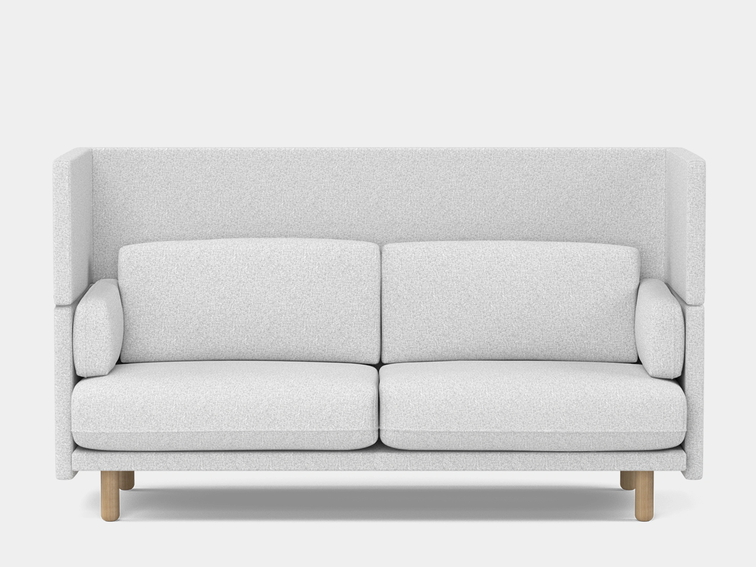 Volledig gestoffeerde 2-zits Modulaire zitbank met en extra hoge rug (141mm hoog), compleet met kussens. Koppelpaneel: Links (zit-perspectief)