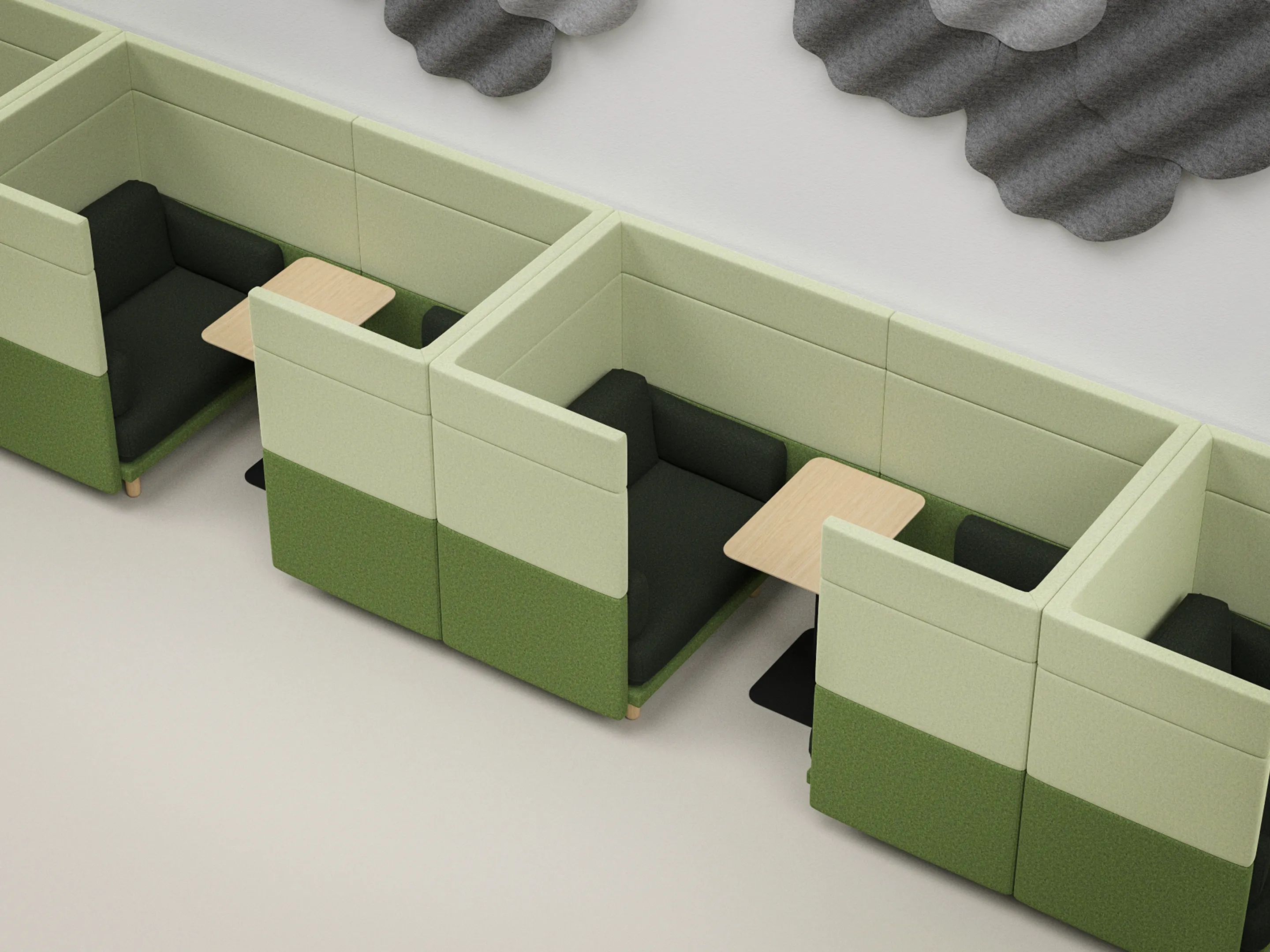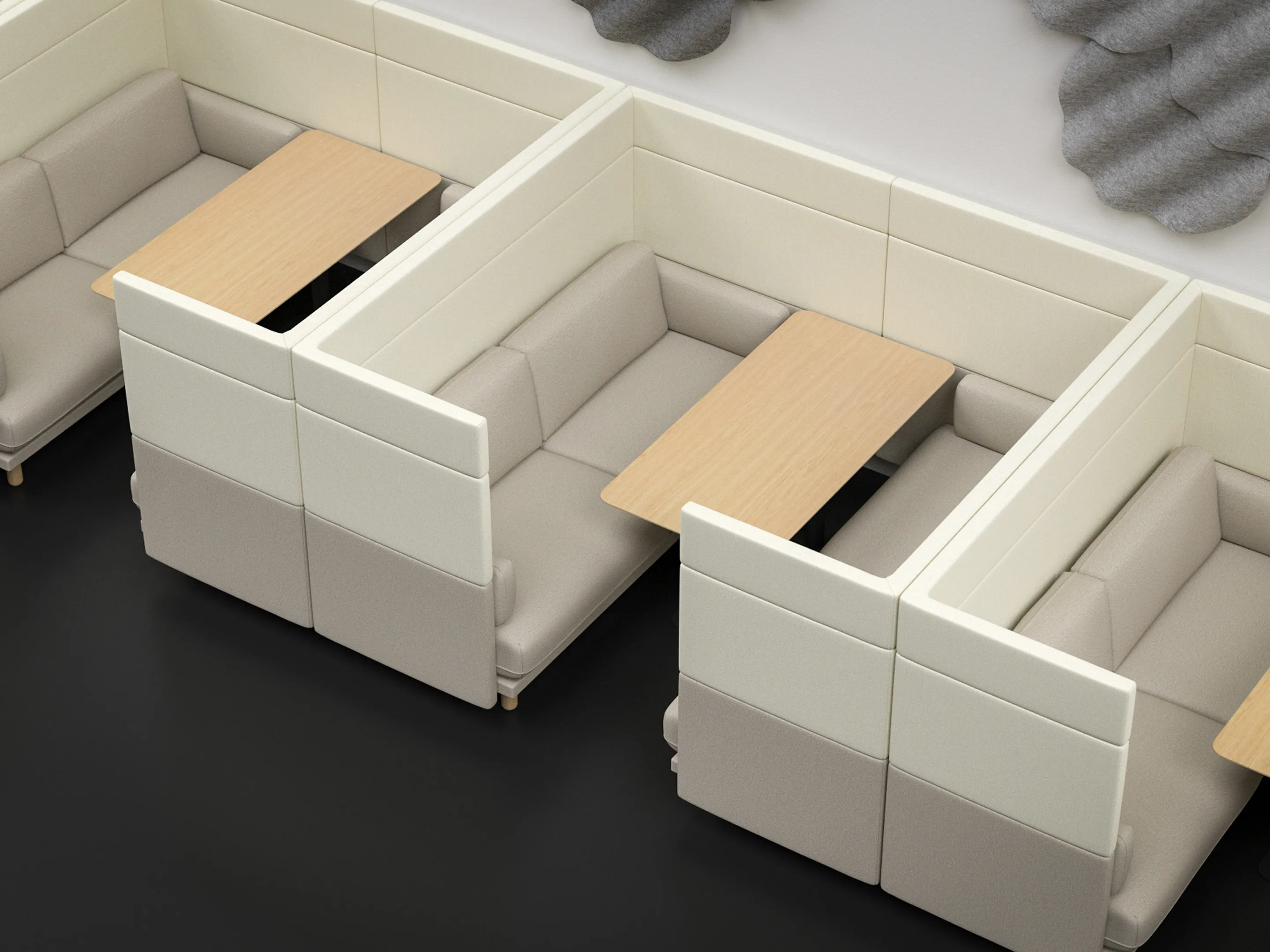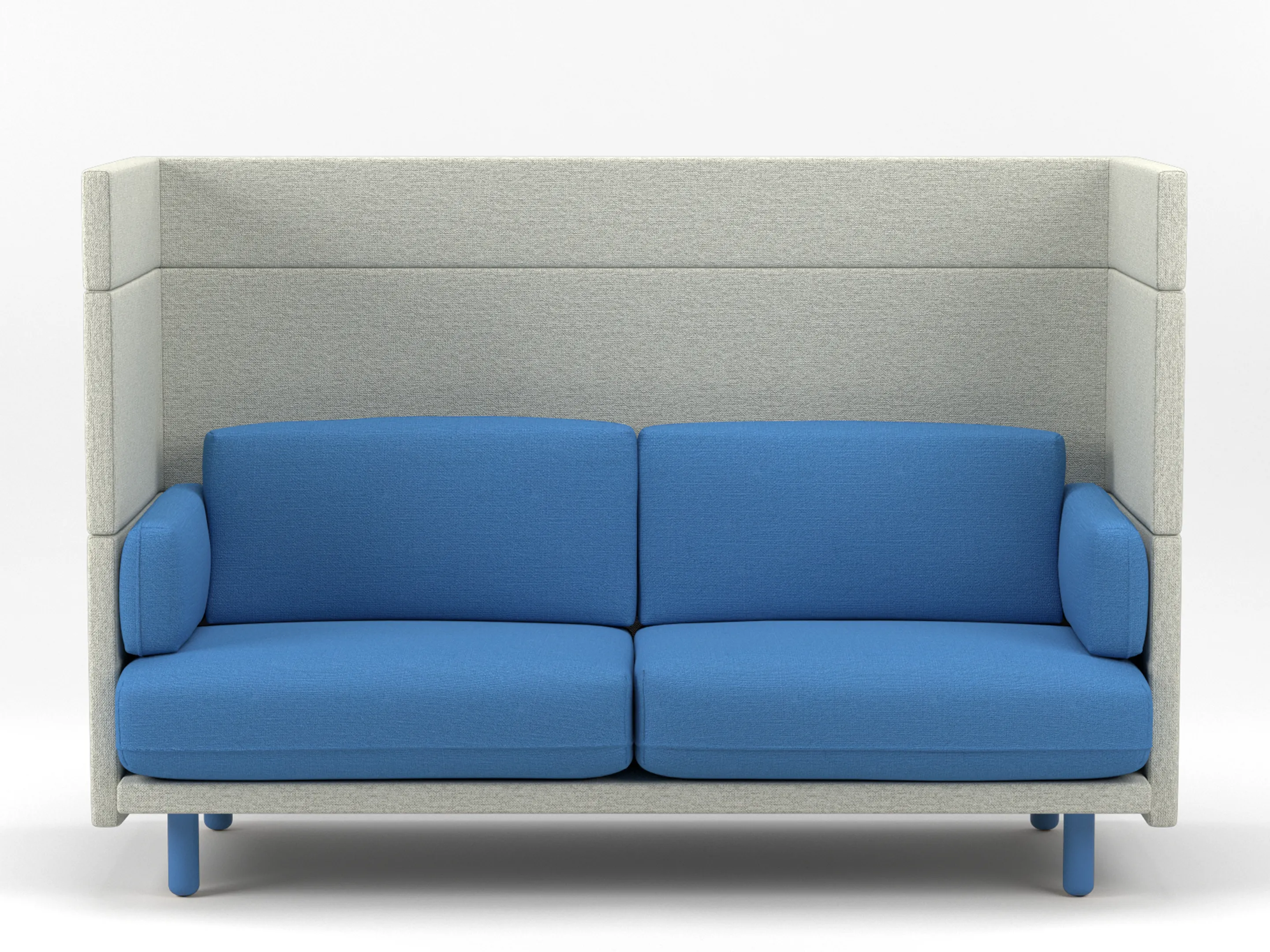 Volledig gestoffeerde 2-zits Modulaire zitbank met en hoge rug (118mm hoog), compleet met kussens. Koppelpaneel: Rechts (zit-perspectief)