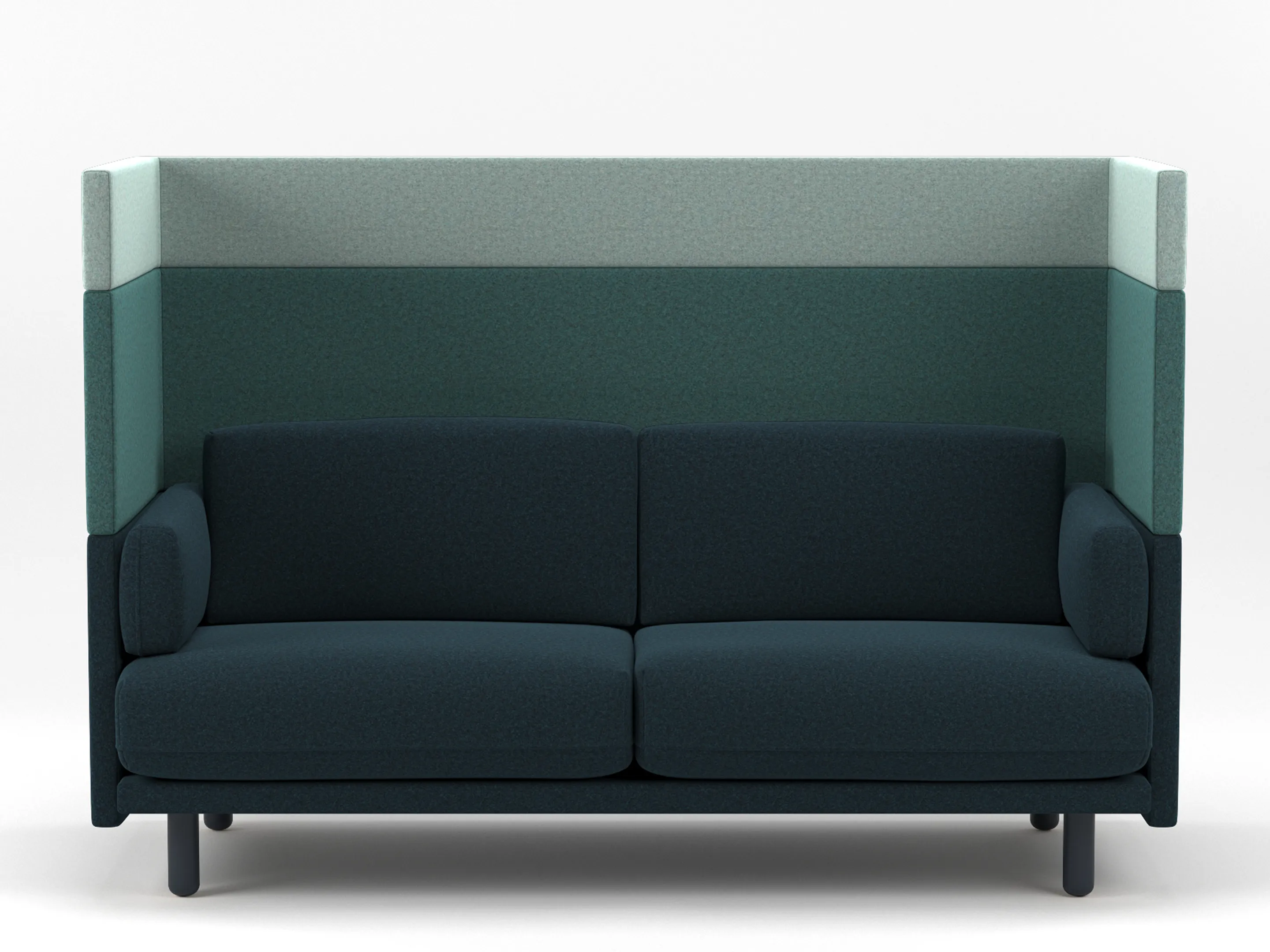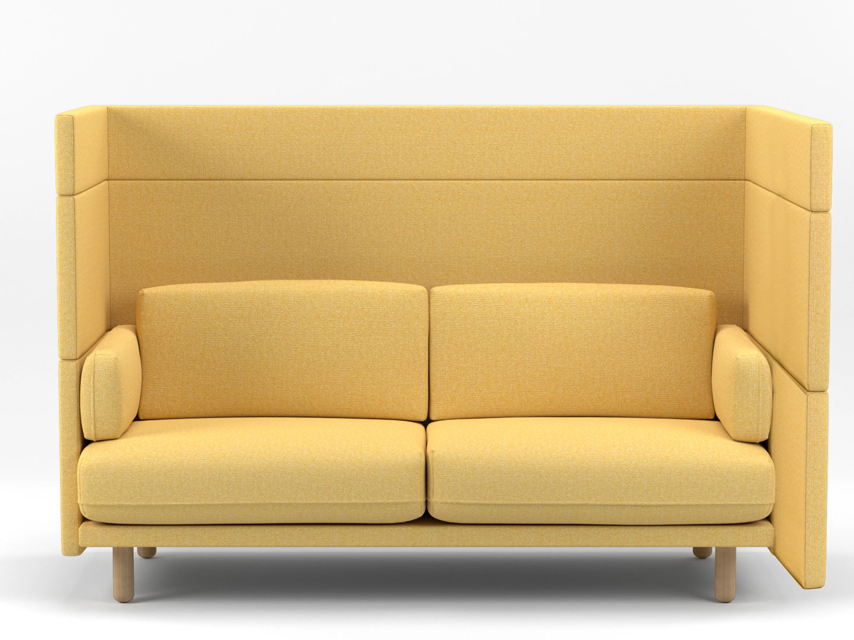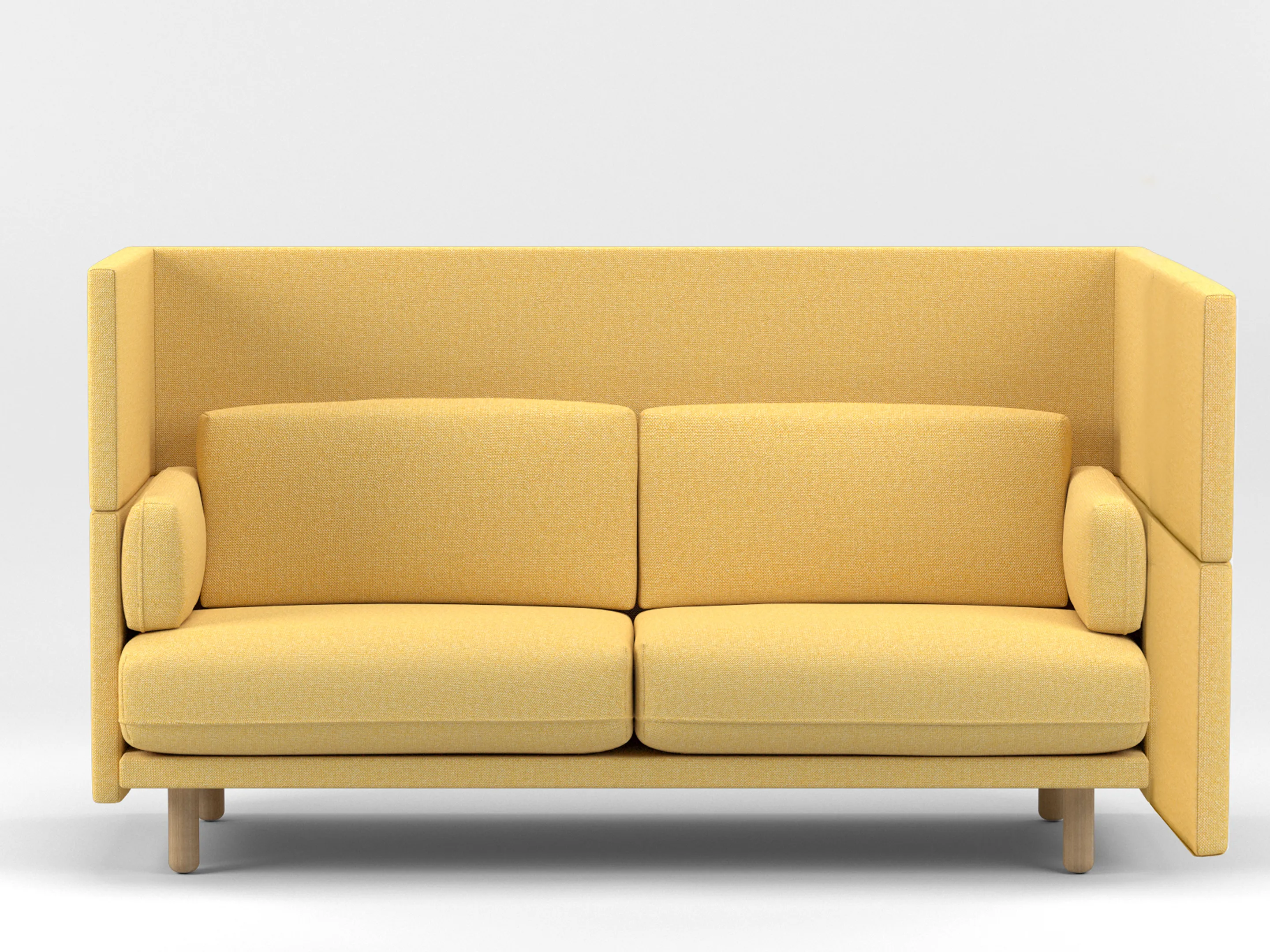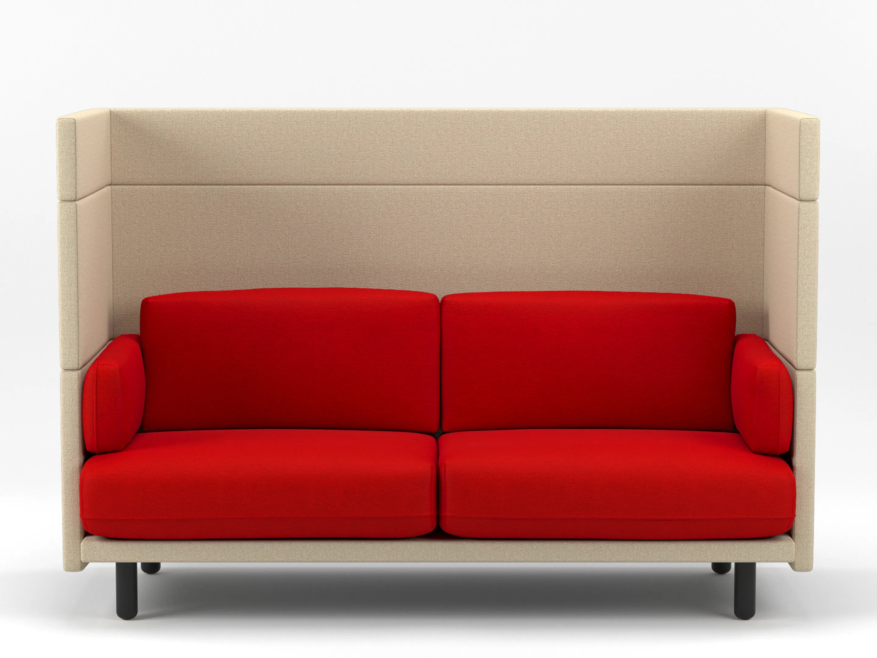 Volledig gestoffeerde 2-zits Modulaire zitbank met en extra hoge rug (141mm hoog), compleet met kussens. Koppelpaneel: Rechts (zit-perspectief)
