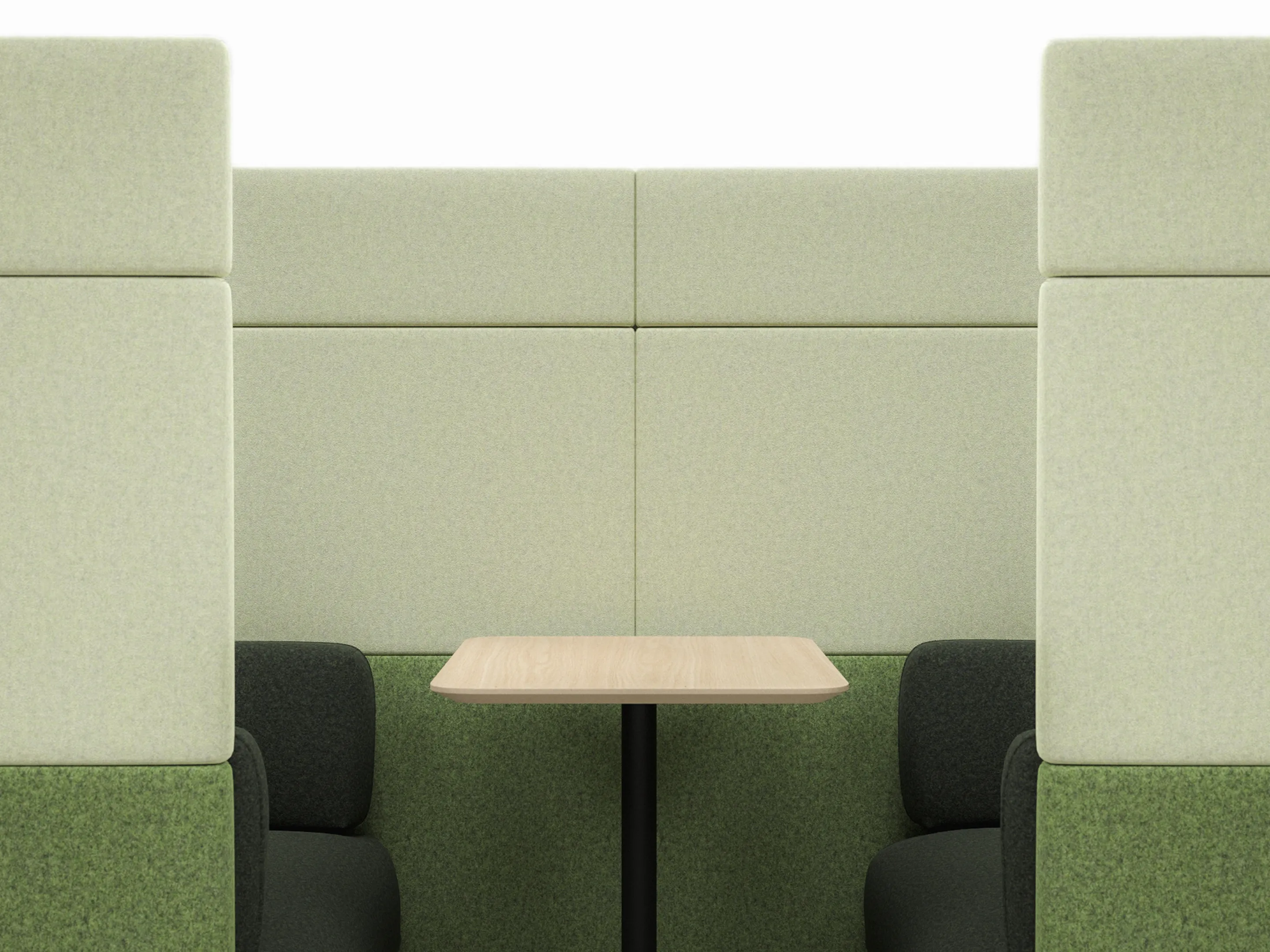 Volledig gestoffeerde 2-zits Modulaire zitbank met en middelhoge rug (940mm hoog), compleet met kussens. Koppelpaneel: Rechts (zit-perspectief)