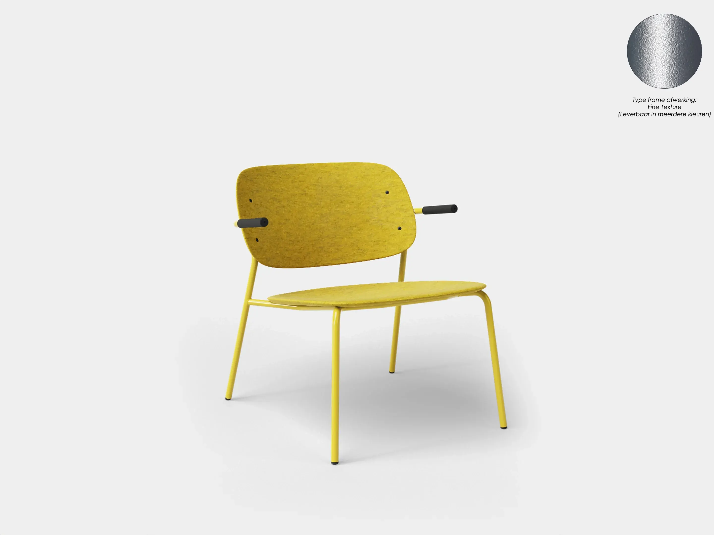 Pet-felt Lounge stoel met armleuningen. Zitschaal in een basis kleur, frame in een Fine Texture kleur. Let op, voor "Fine Texture" kleuren worden opstartkosten in rekening gebracht.