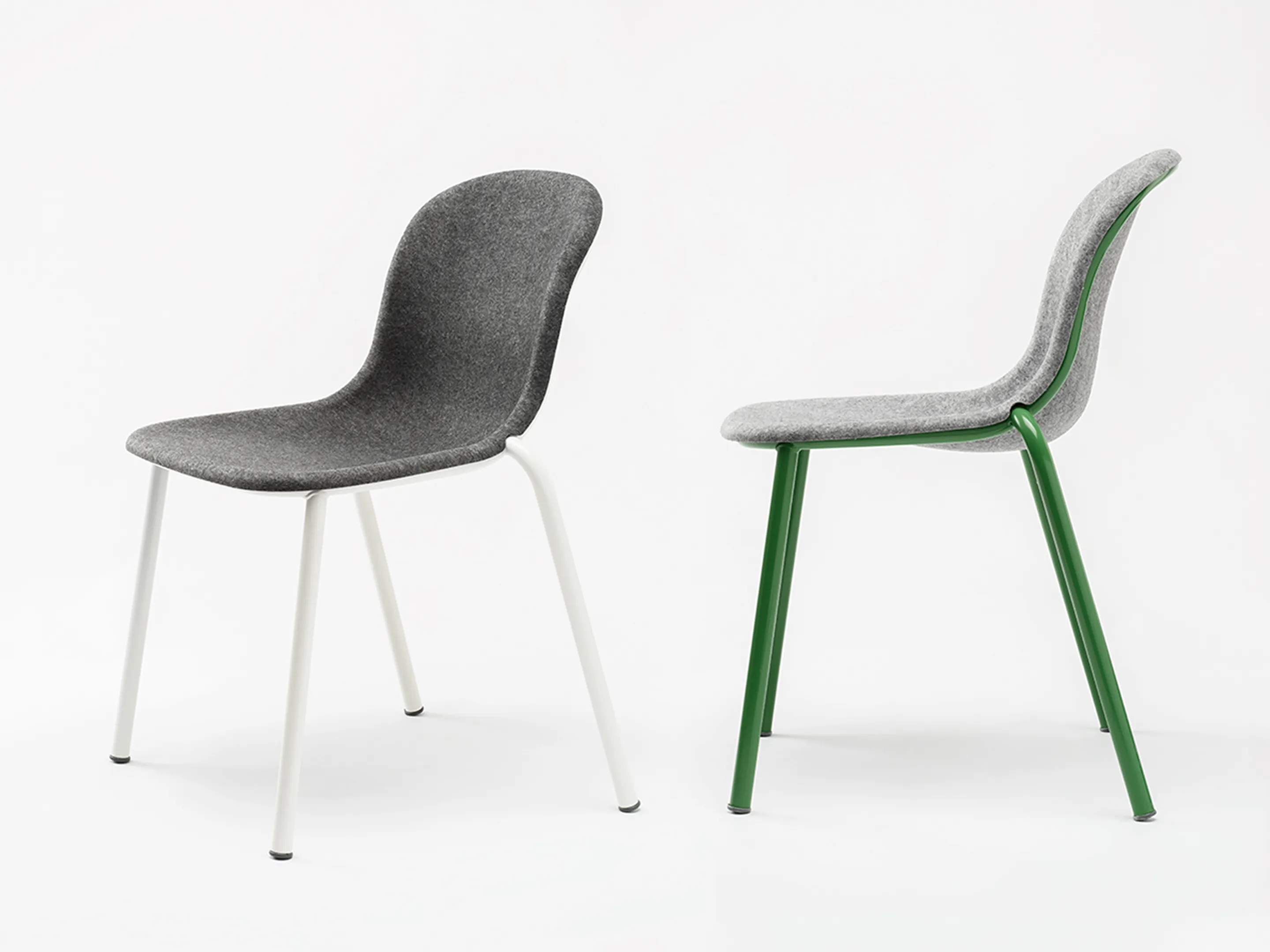 Stapelbare PET-felt stoel zonder armleuningen. Zitschaal in een basis kleur, frame in een Fine Texture kleur. Let op, voor "Fine Texture" kleuren worden opstartkosten in rekening gebracht.