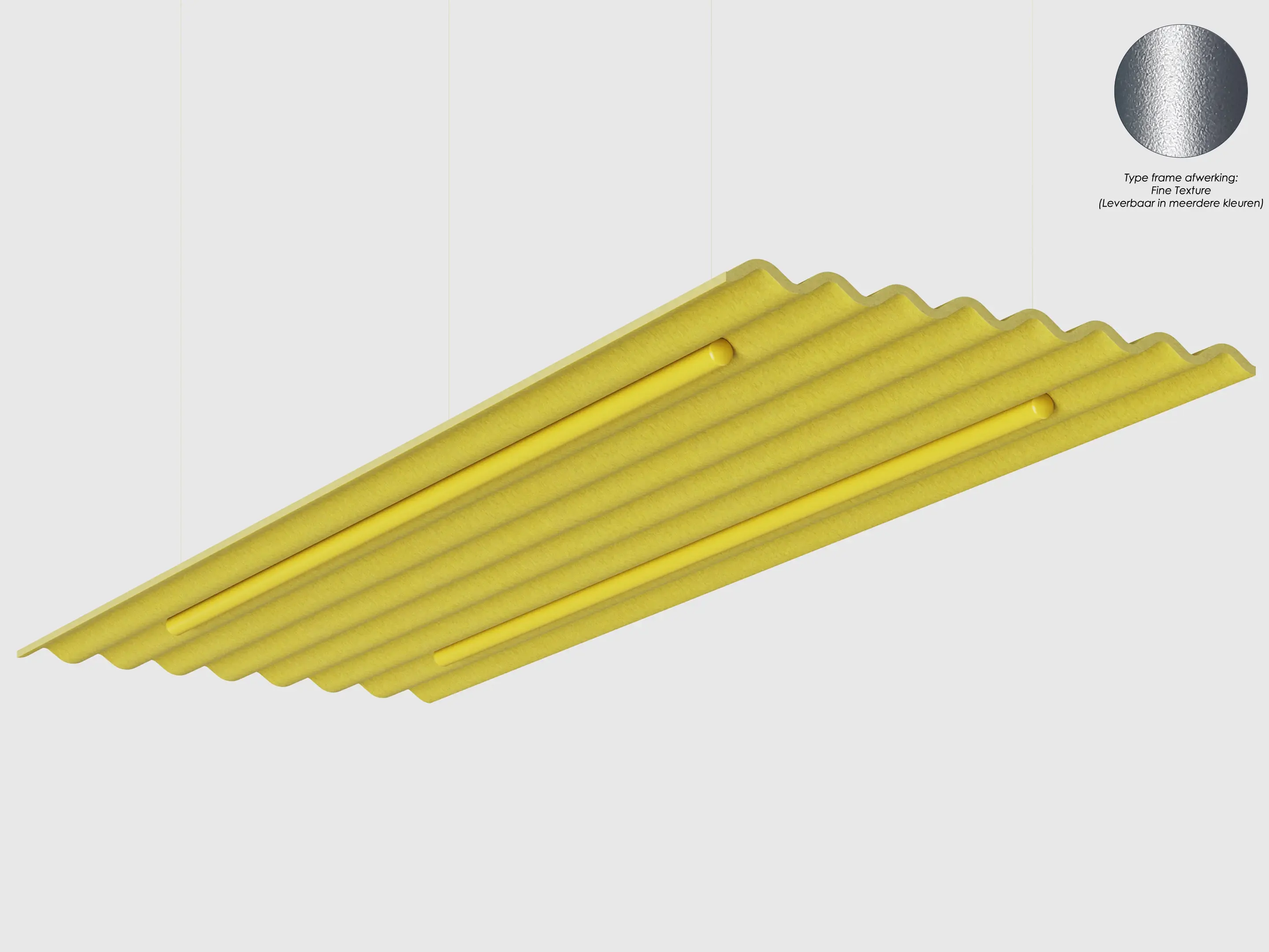 Uit gerecycled PET flessen gevormde akoestische hang panelen. Afmeting: 2390x790x47mm (HxBxD). Hangpanelen zijn voorzien van metalen tubes Let op, voor "Fine Texture" kleuren worden opstartkosten in rekening gebracht.