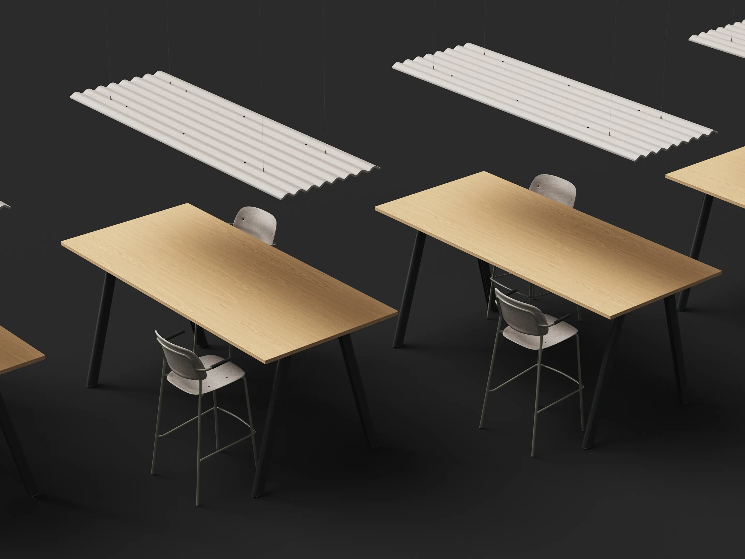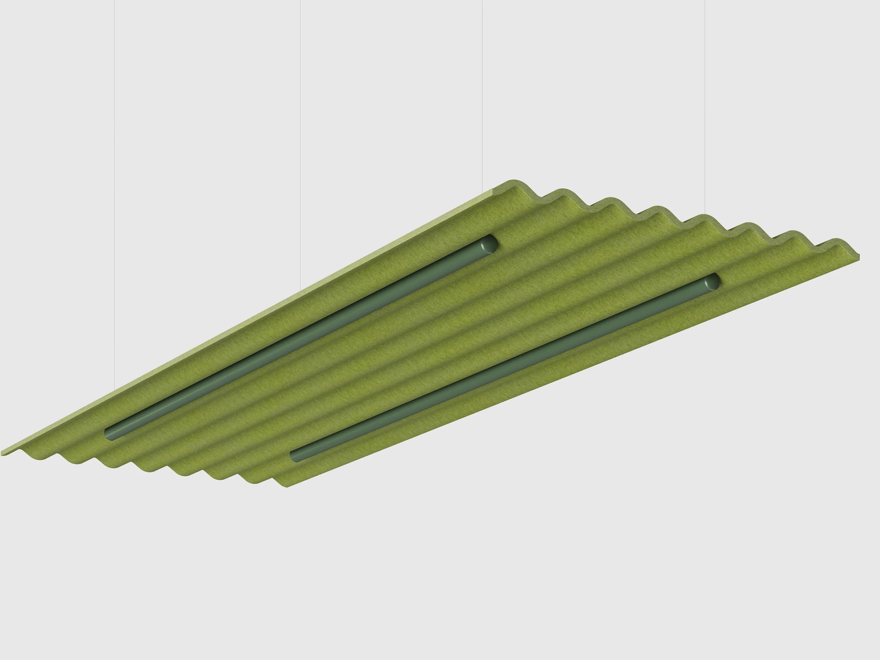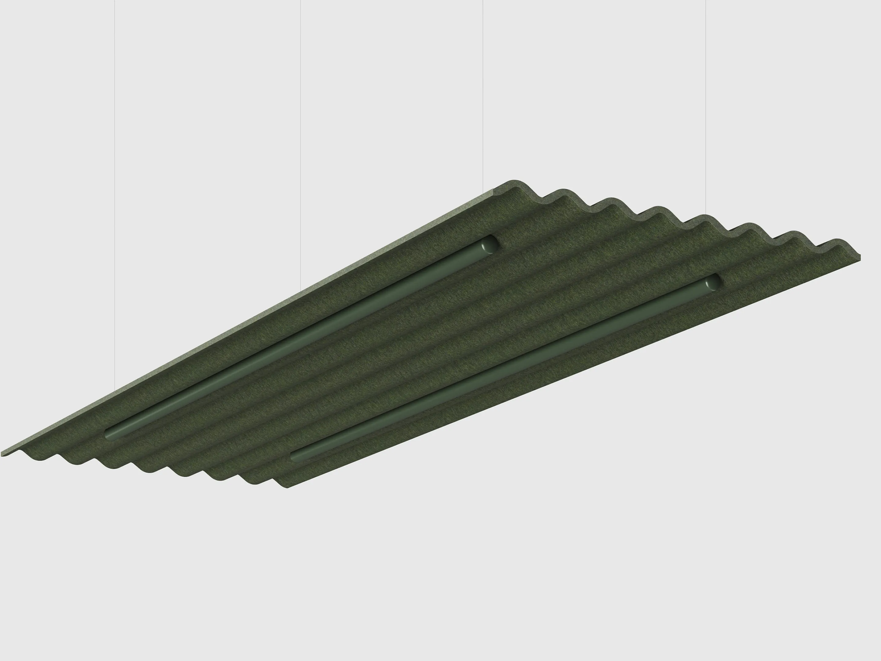Uit gerecycled PET flessen gevormde akoestische hang panelen. Afmeting: 2390x790x47mm (HxBxD). Hangpanelen zijn voorzien van metalen tubes