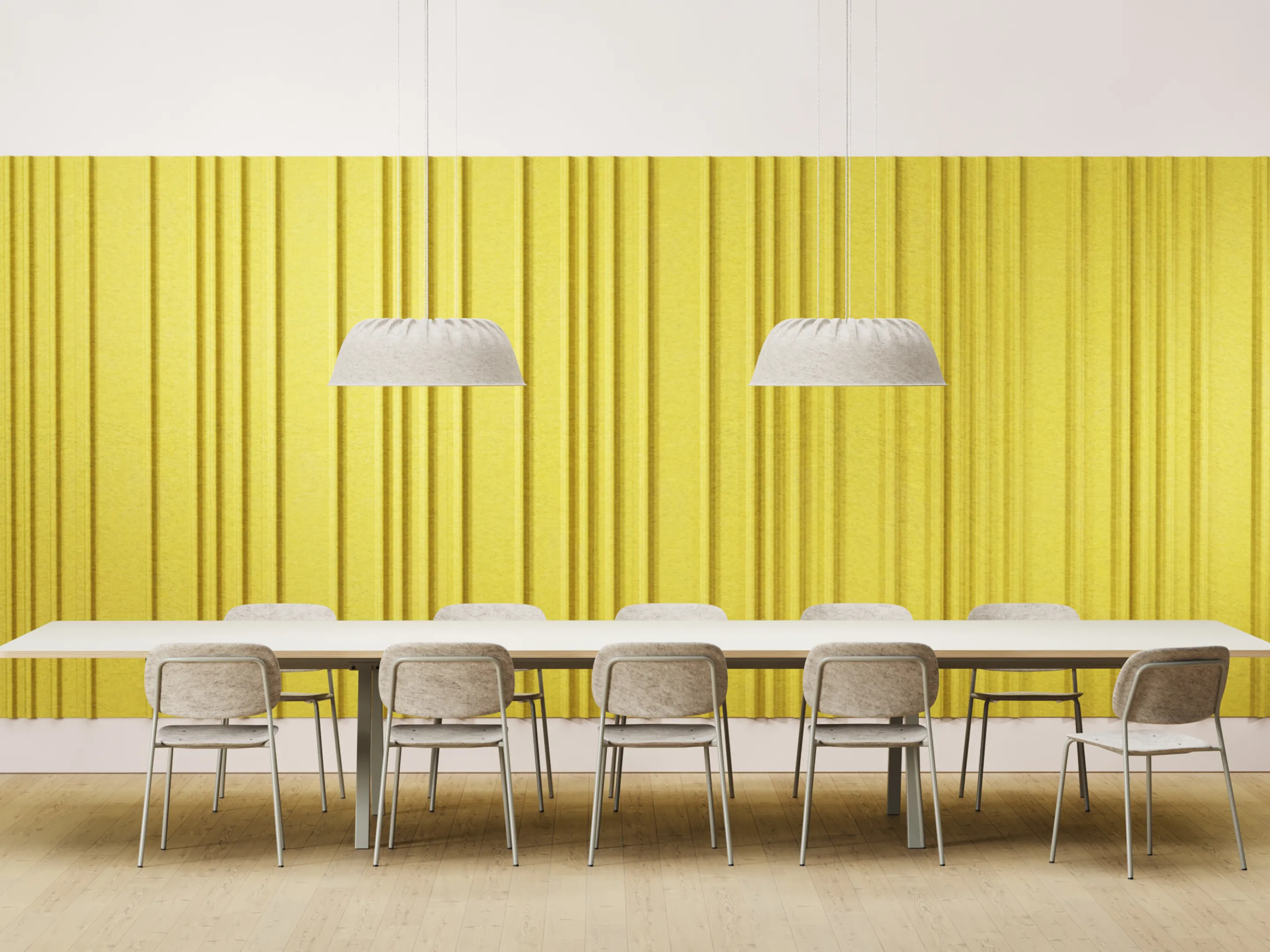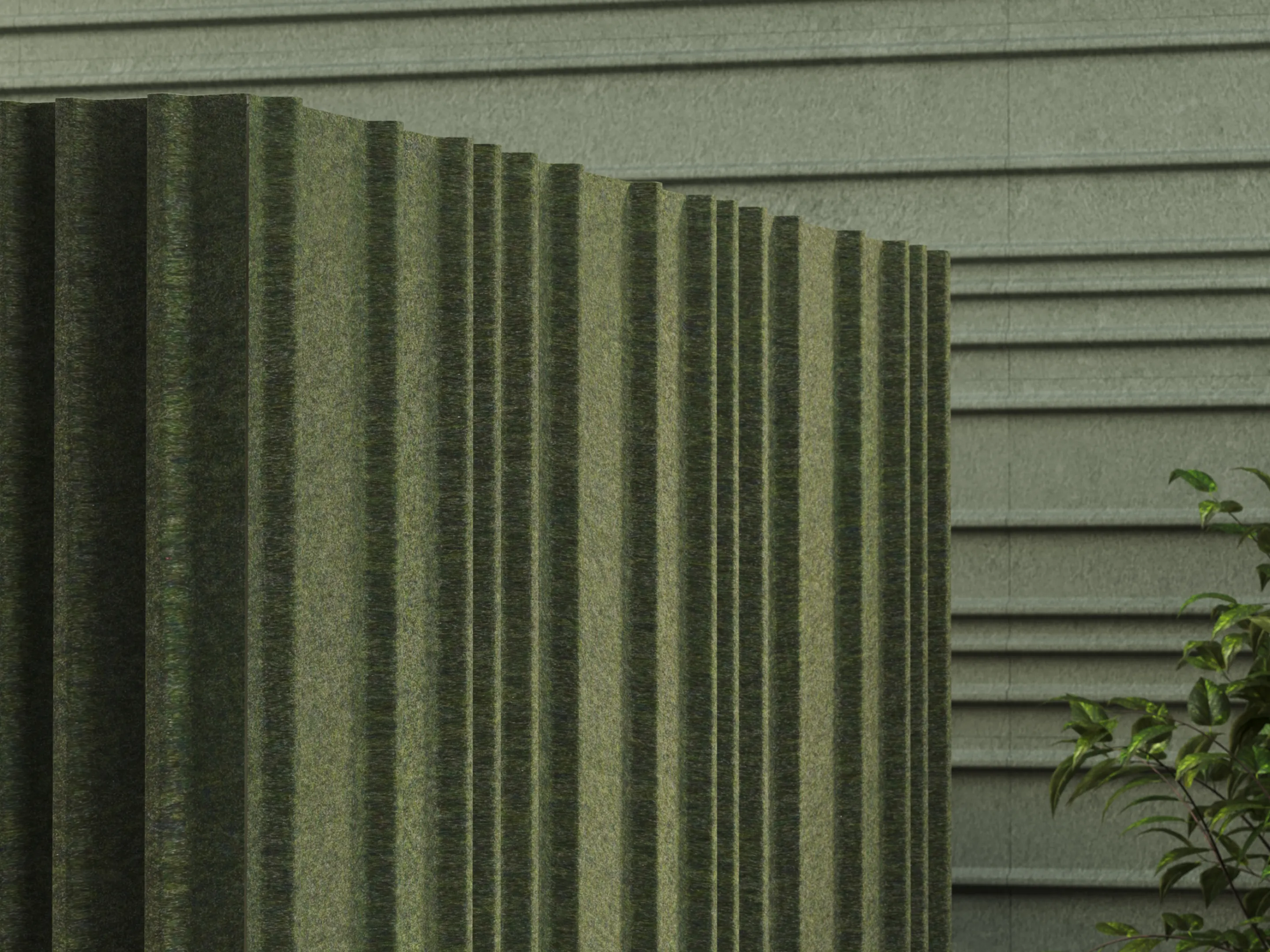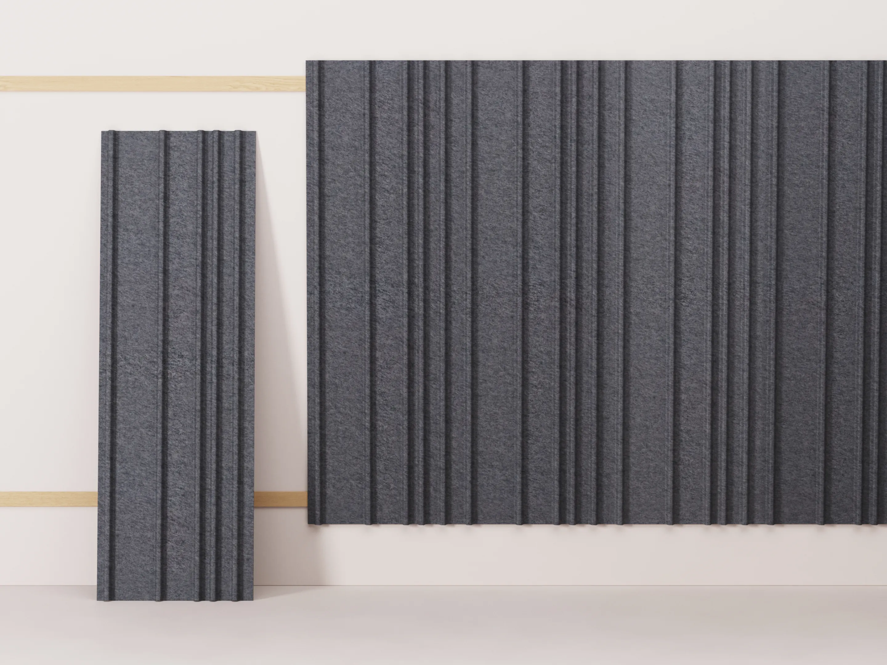 Uit gerecycled PET flessen gevormde akoestische panelen. Afmeting: 2390x790x43mm (HxBxD)
