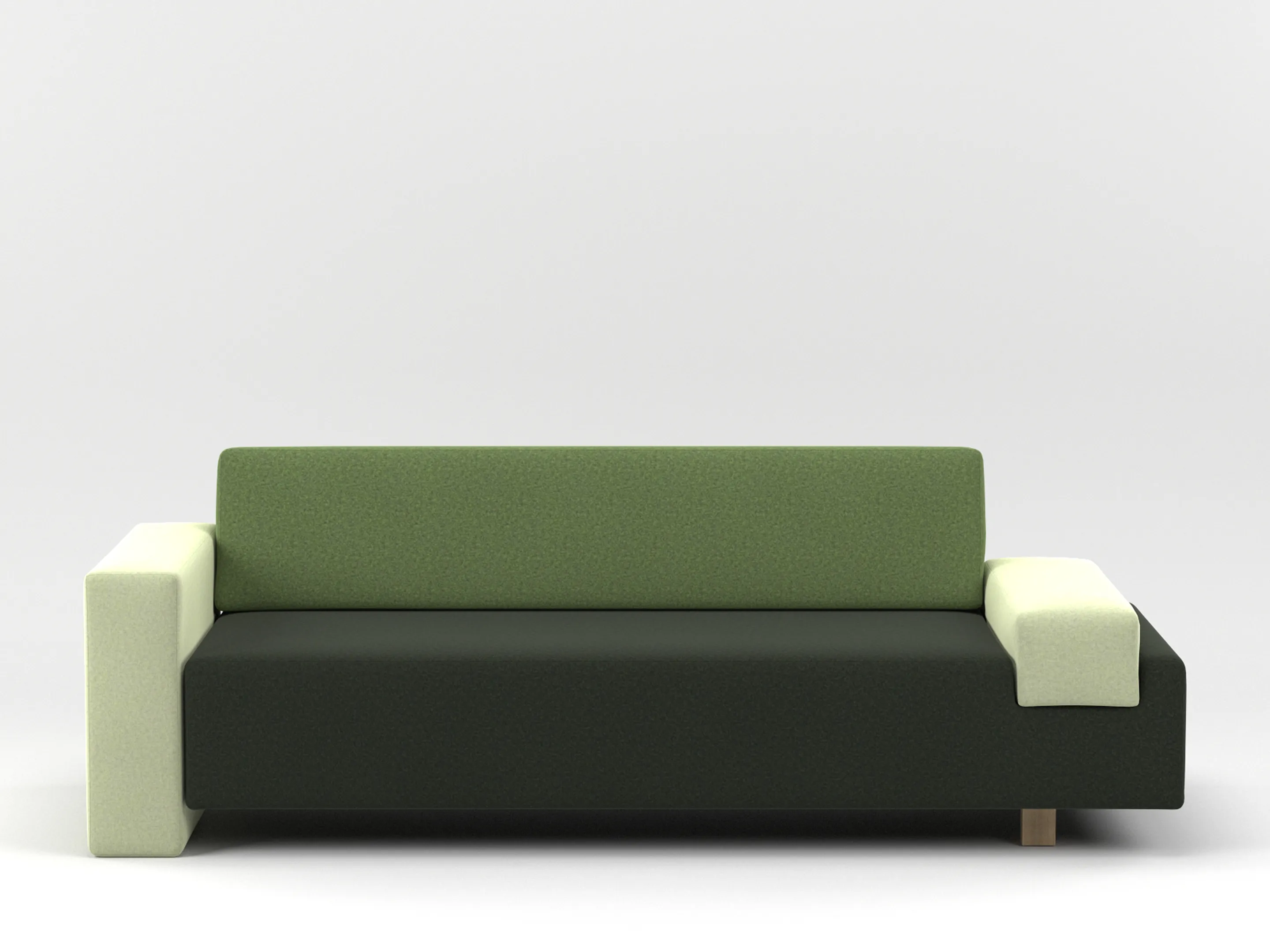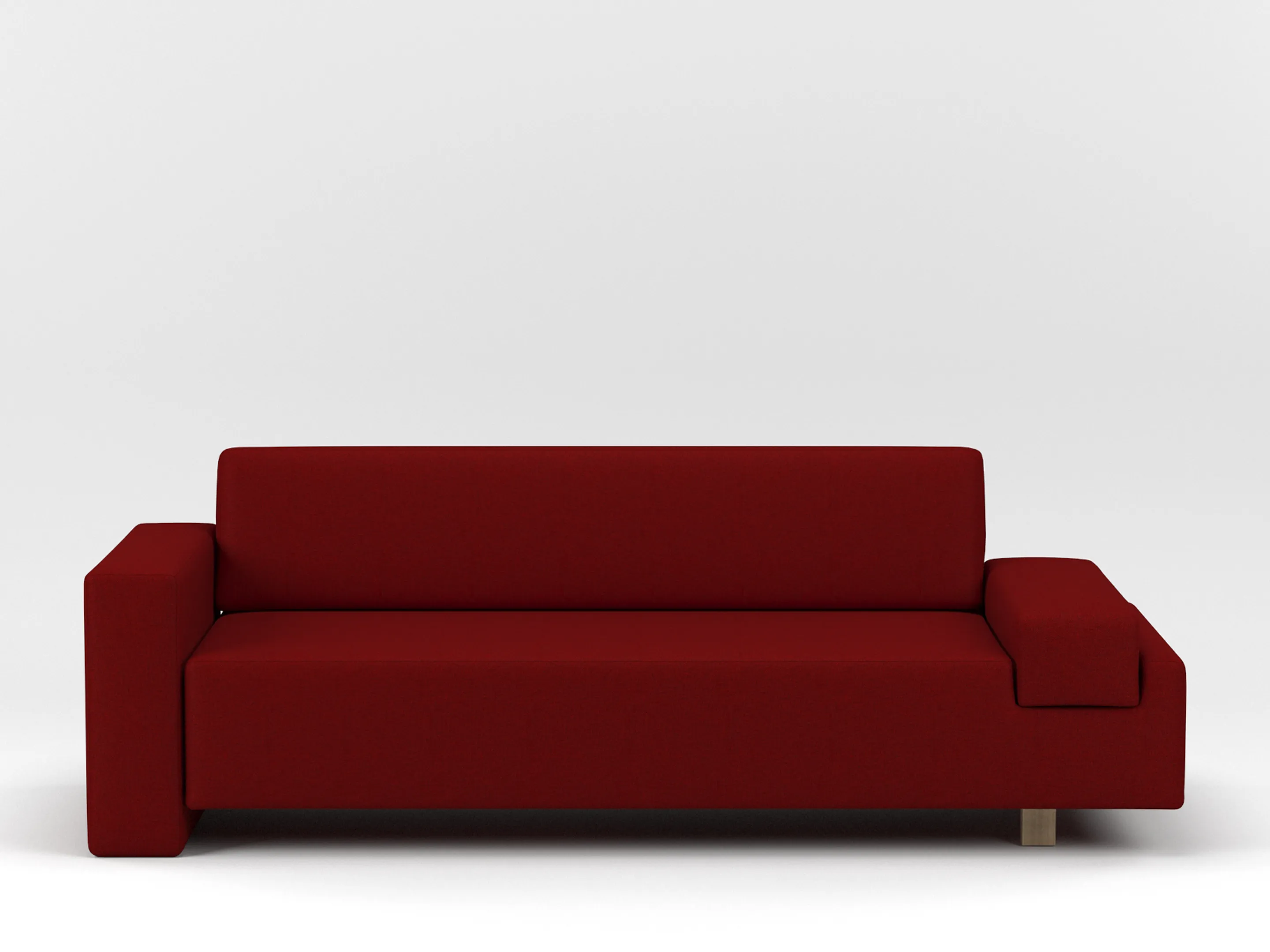 Volledig gestoffeerde 3-zits poef, afmeting: 245cm x 85cm, 52cm (BxDxH), Het armdeel aan de rechter zijde (zit-perspectief).