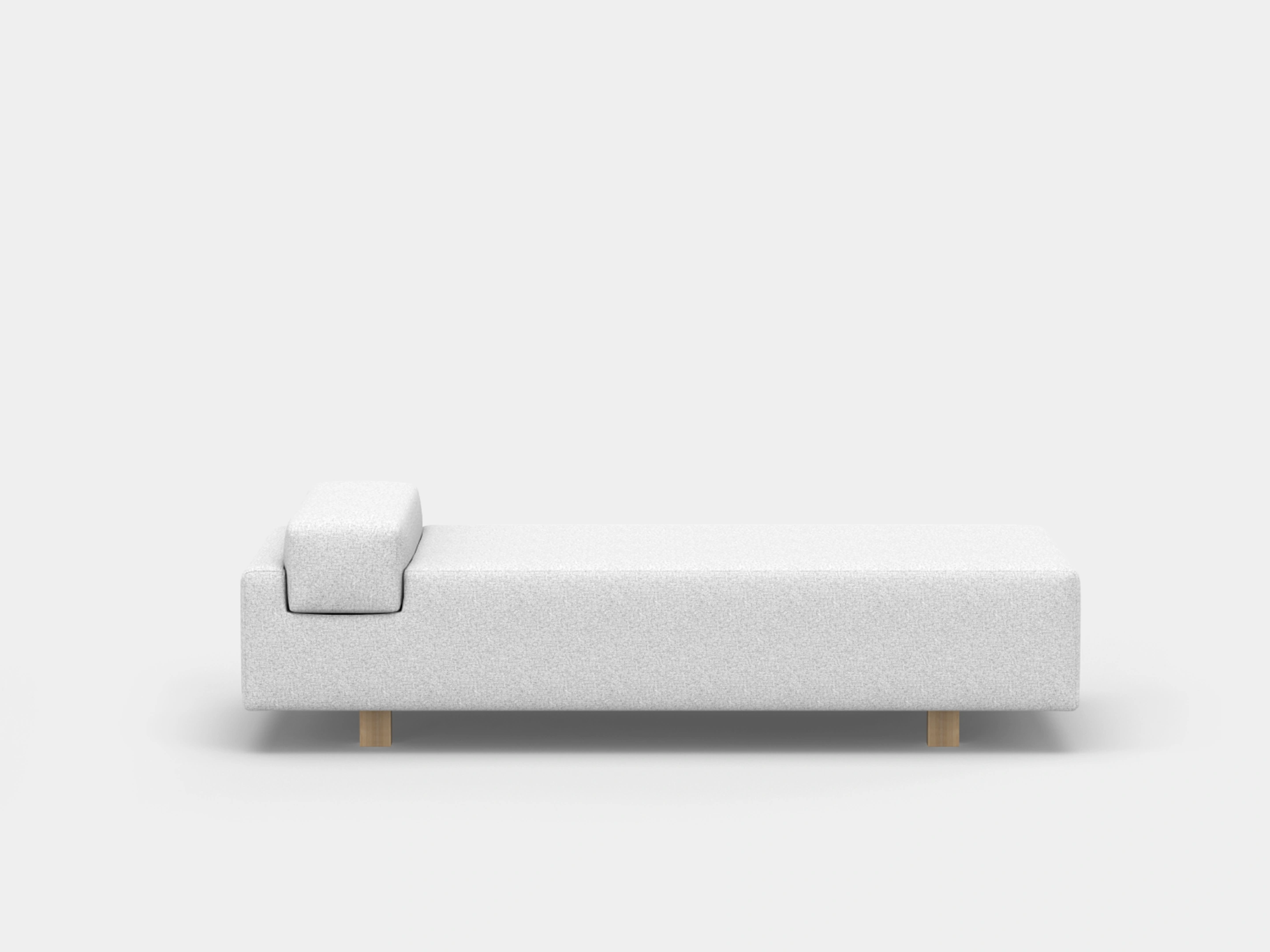 Volledig gestoffeerde 2-zits poef, afmeting: 185cm x 85cm, 52cm (BxDxH), Het armdeel aan de rechter zijde (zit-perspectief).