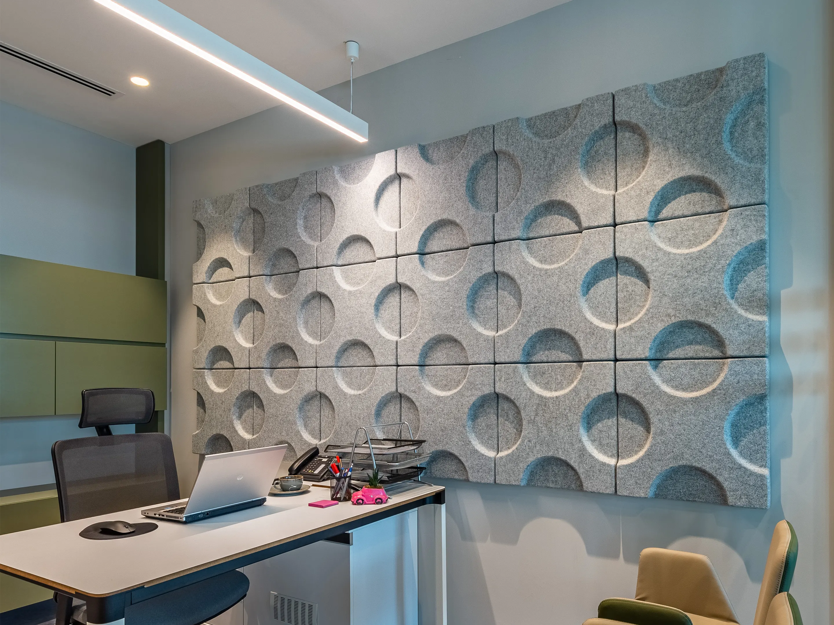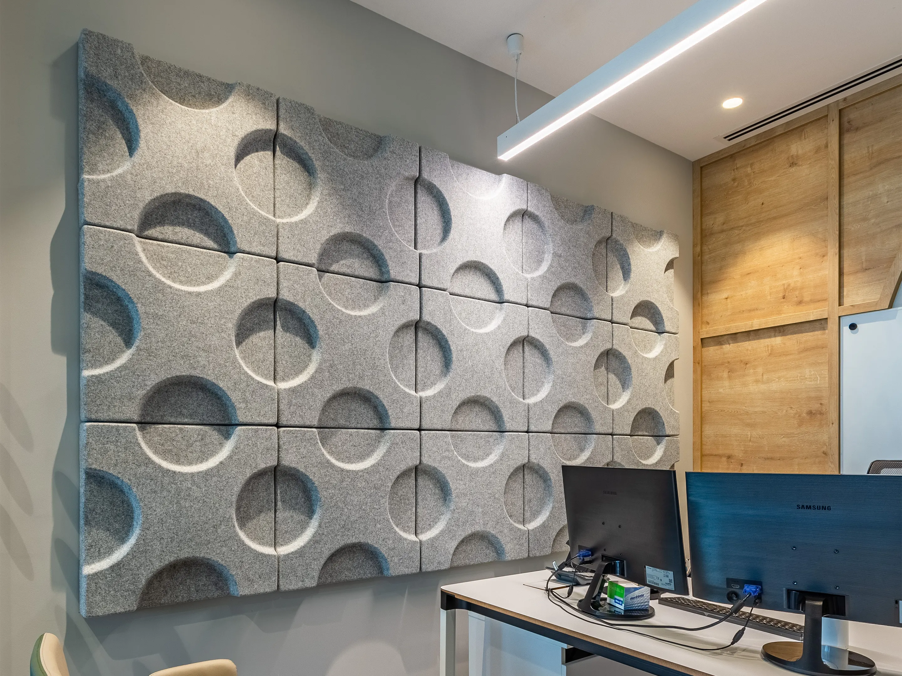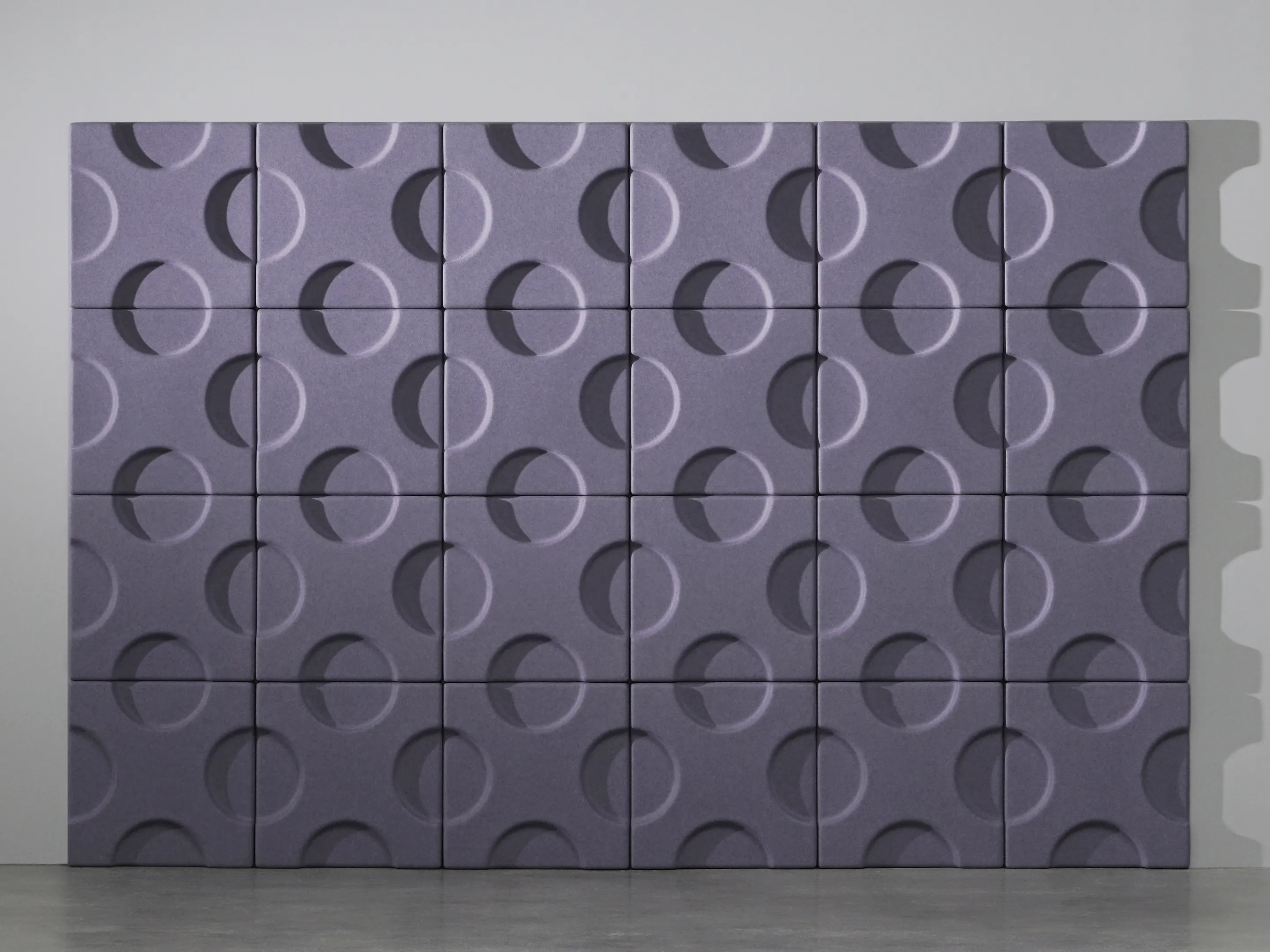 Vierkant akoestisch paneel met halve cirkel patroon en een NRC Waarde van 0,80. Bevestiging d.m.v. magneetprofiel. Geschikt voor bevestiging aan een wand of plafond. Inclusief schroeven, pluggen en installatiehandleiding.